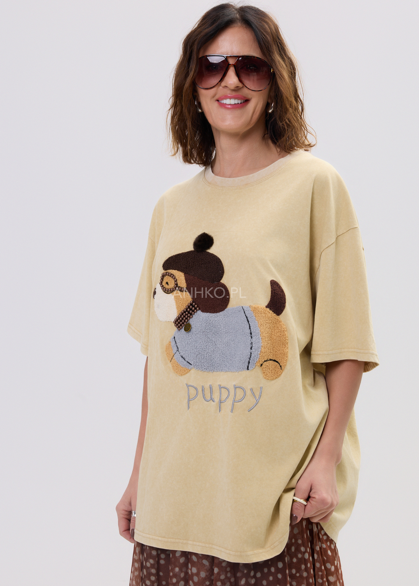 Największym wyróżnikiem jest oryginalna aplikacja pieska, wykonana z połączenia haftu, naszywki i koralików, co tworzy efekt 3D i przyciąga spojrzenia. Delikatnie sprany odcień beżu nadaje całości modowego charakteru i sprawia, że model idealnie wpisuje się w aktualne trendy, pozostając jednocześnie ponadczasową bazą stylizacji.