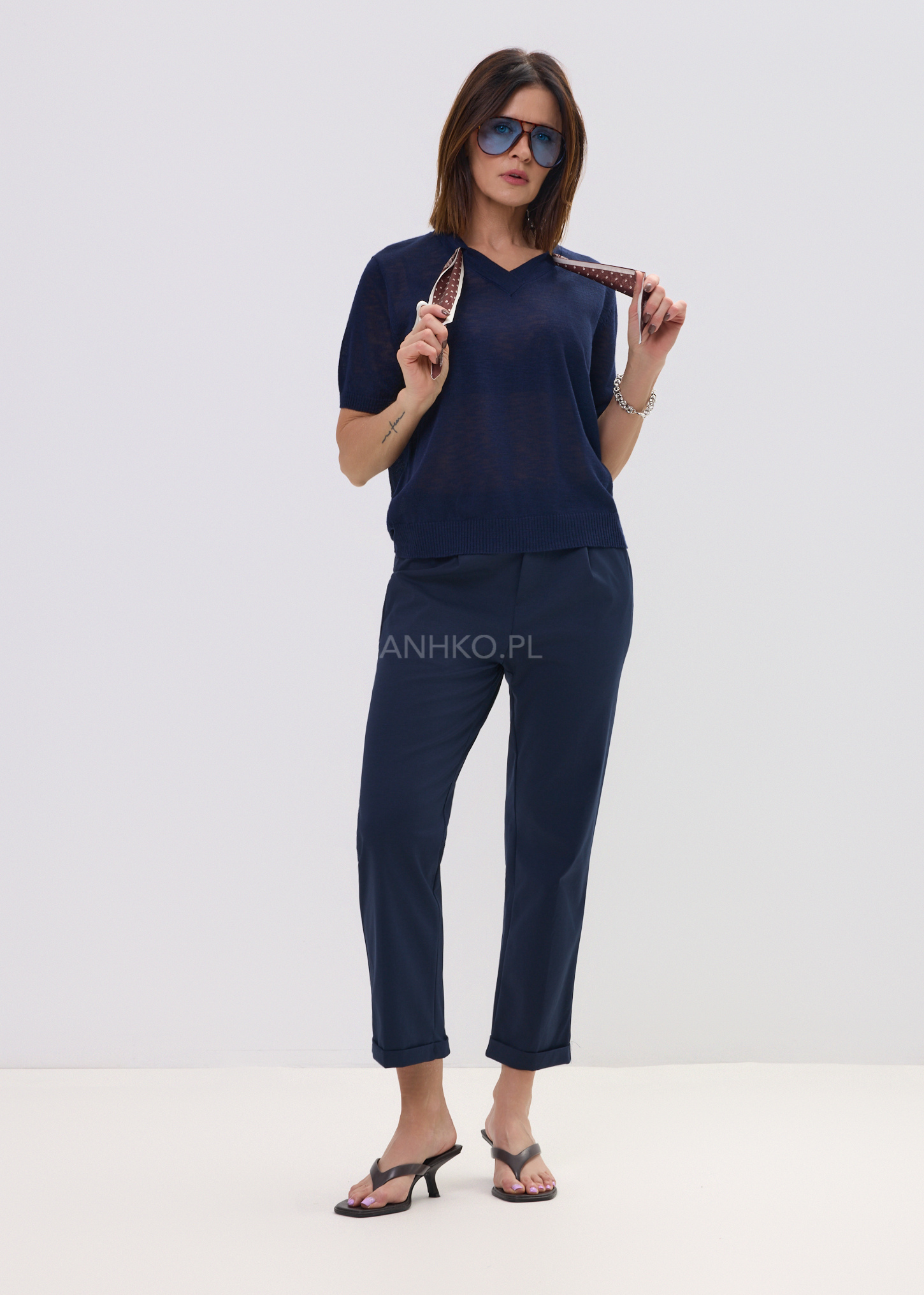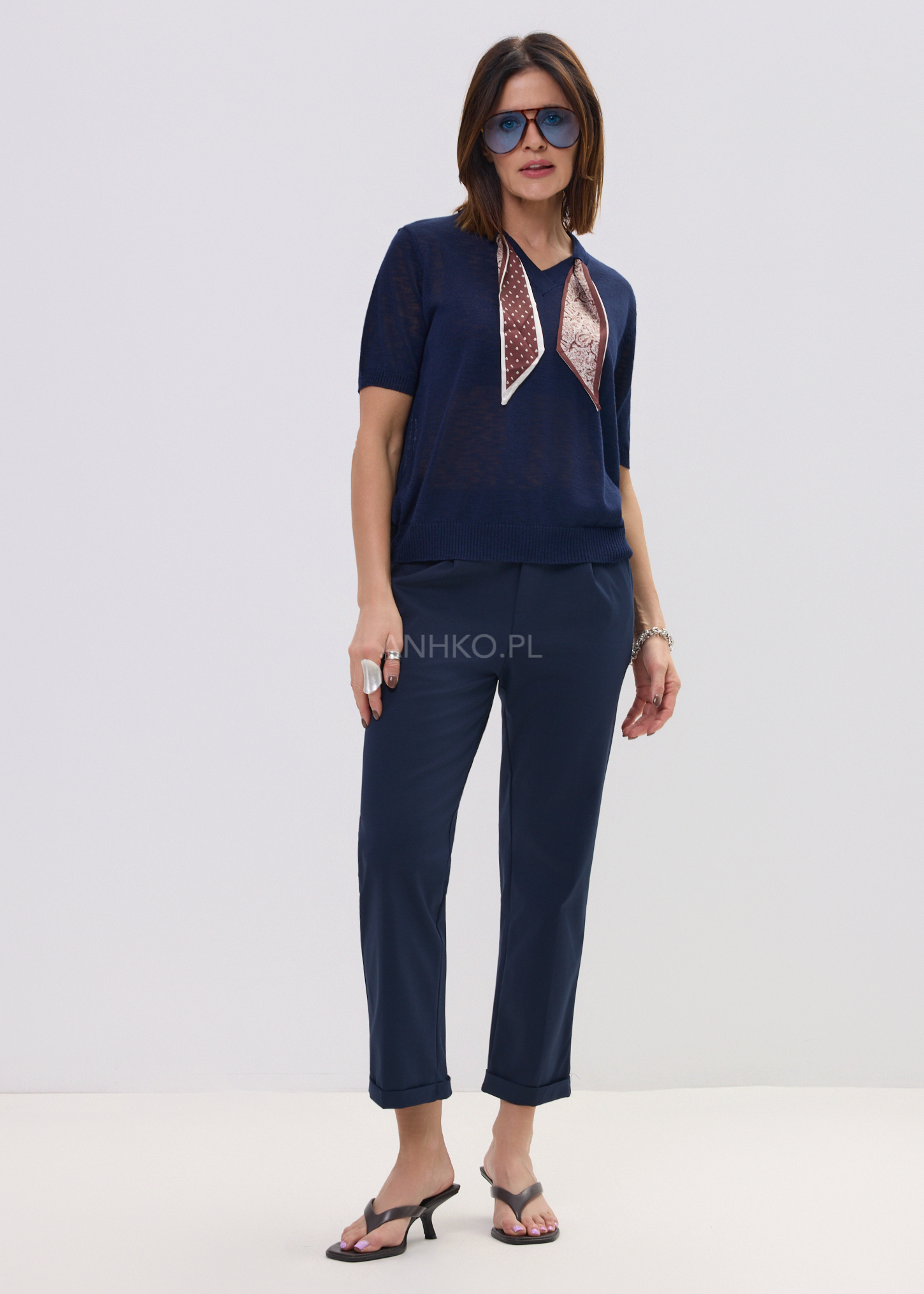 Ta bluzka dzianinowa z krótkim rękawem w kolorze granatowym to uniwersalna baza garderoby, która łączy komfort z dopracowanym stylem. Miękka, lekka dzianina delikatnie układa się na sylwetce, zapewniając wygodę przez cały dzień. Charakterystyczny dekolt w kształcie litery V został uzupełniony dekoracyjną apaszką w paisleyowy wzór, dzięki czemu model przyciąga uwagę subtelnym detalem.