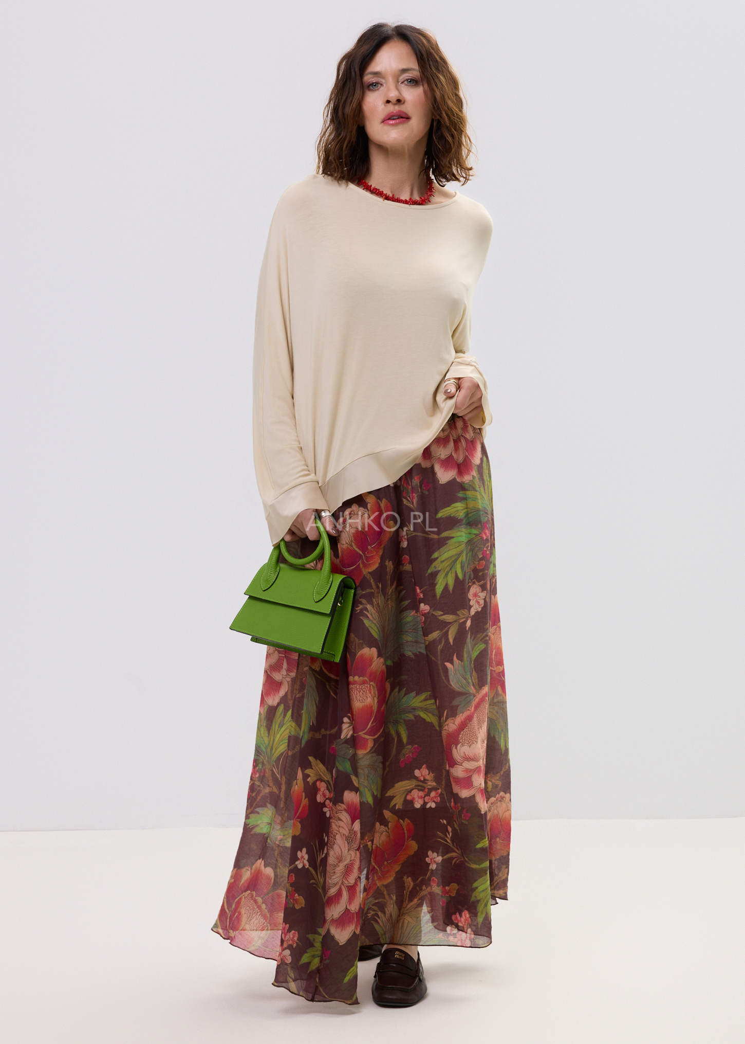 - Materiał: Miękko układająca się tkanina o lekkiej strukturze.