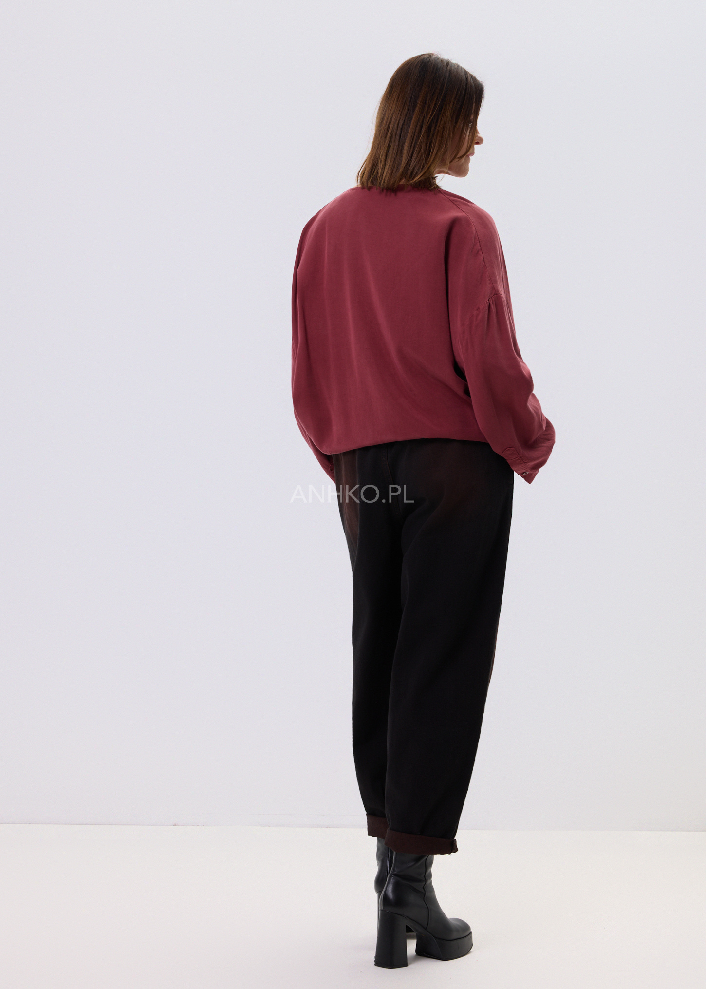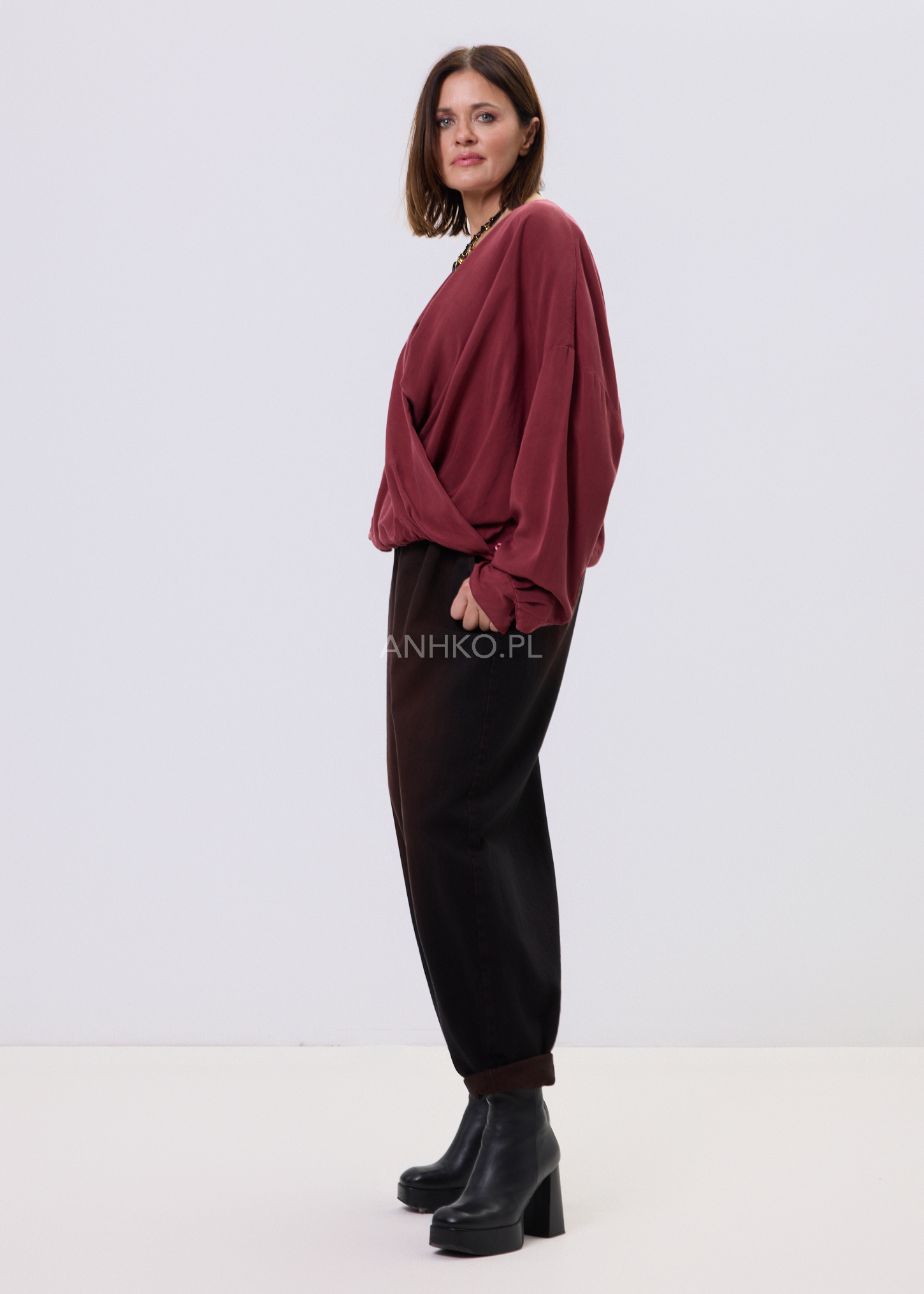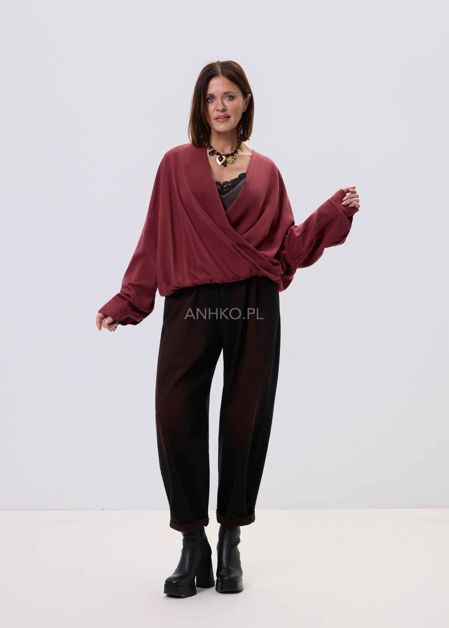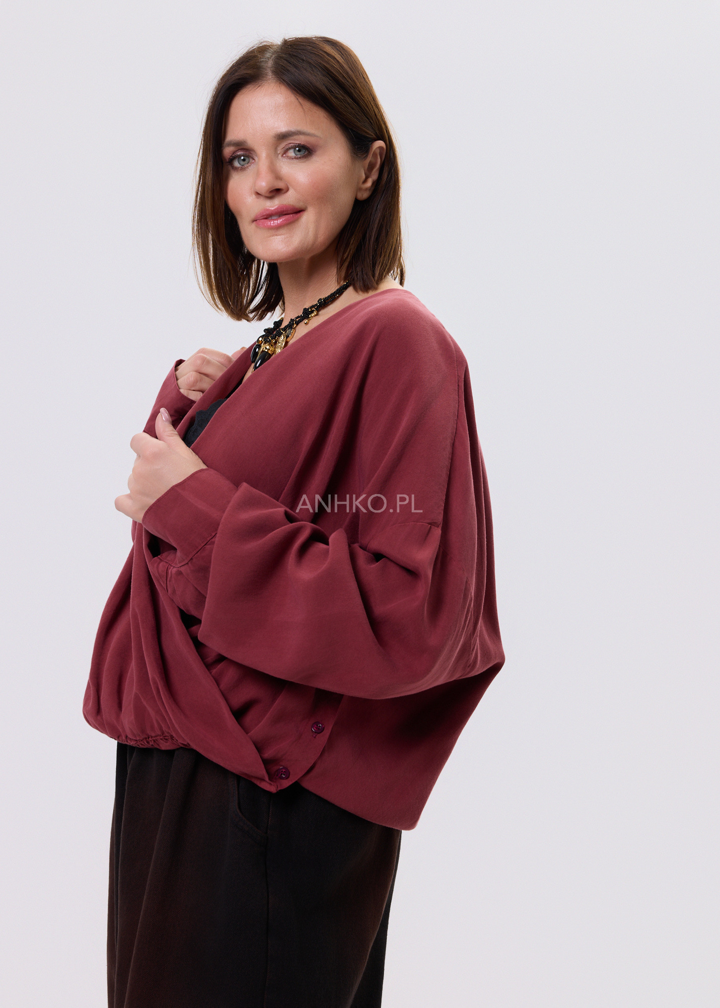 Casualowa bluzka damska w kolorze wina, zaprojektowana w luźnym kroju, który zapewnia wygodę i naturalne dopasowanie do sylwetki. Model wyróżnia się efektownym dekoltem kopertowym, który subtelnie podkreśla górne partie ciała i nadaje całości kobiecego charakteru. Lekko marszczony dół tworzy miękką linię i sprawia, że bluzka dobrze układa się podczas noszenia. Długie rękawy zakończone mankietem oraz boczne guziki pełnią funkcję dekoracyjną i konstrukcyjną. Lejący materiał nadaje stylizacji lekkości i płynności. Bluzka doskonale sprawdzi się w zestawach casualowych — z jeansami, spodniami materiałowymi lub spódnicą. Odpowiednia również dla sylwetek Plus Size.