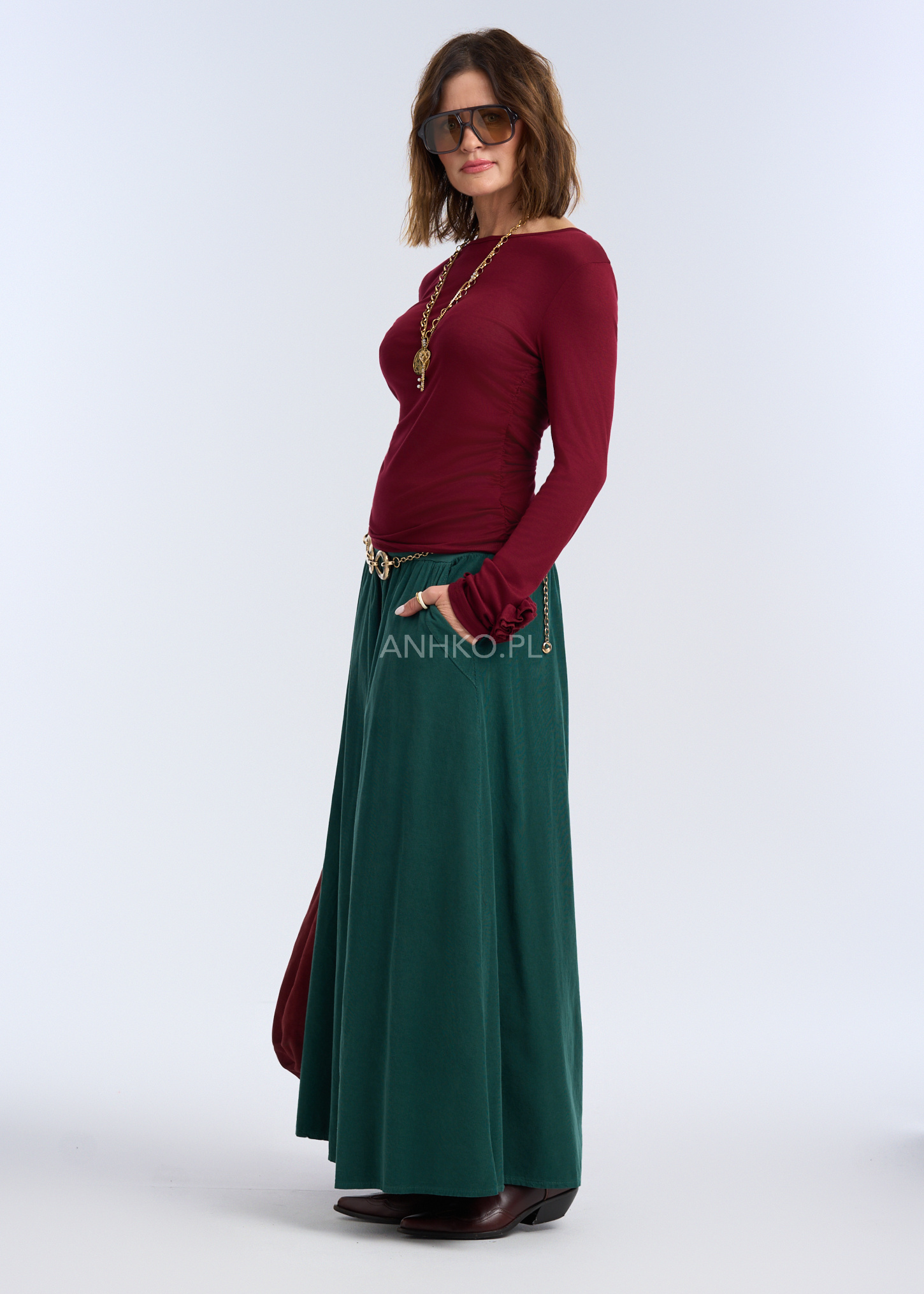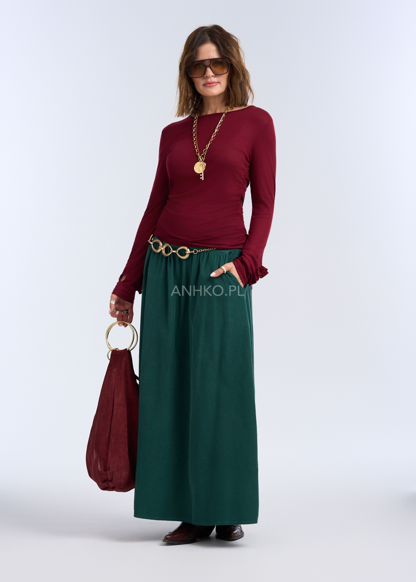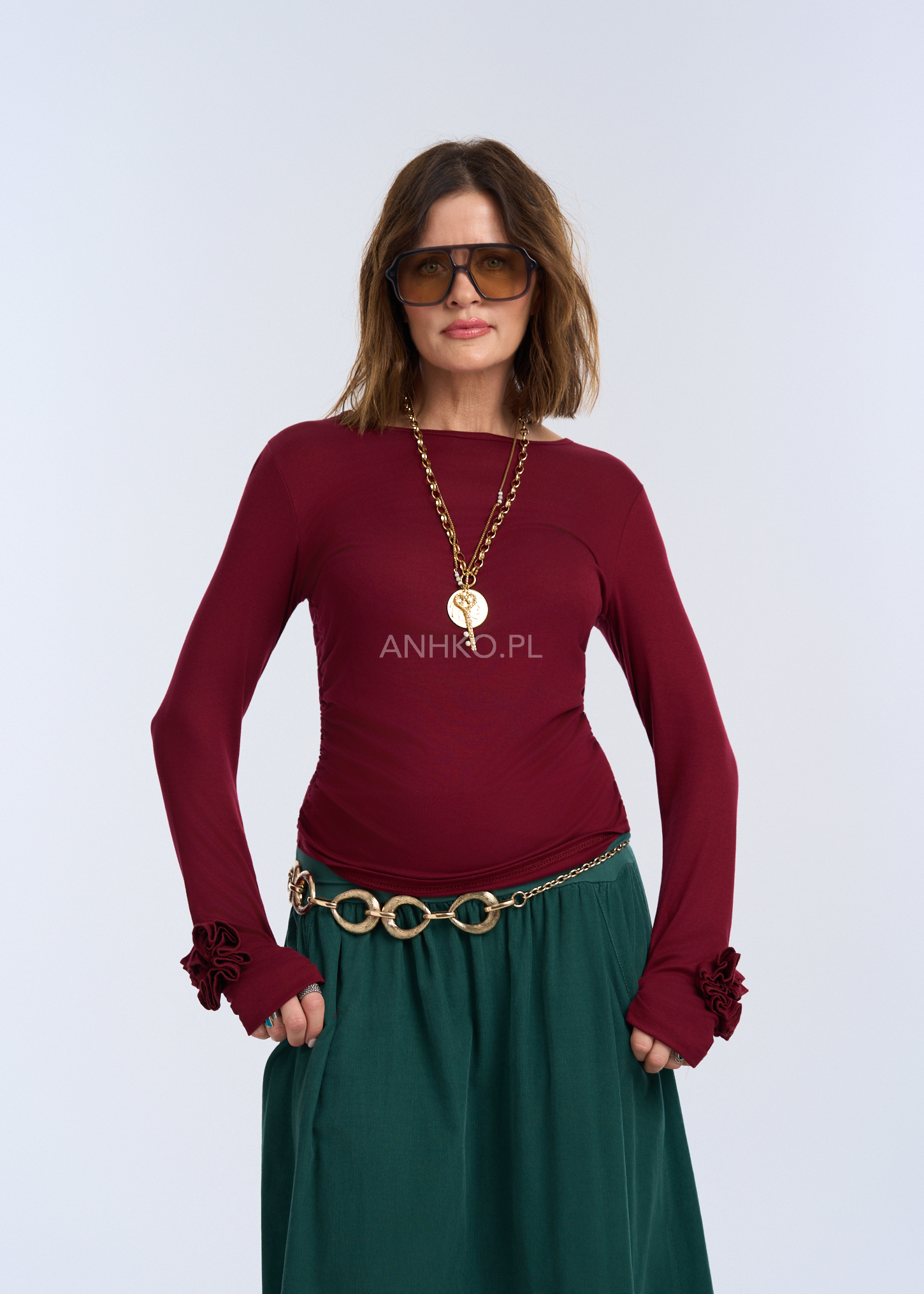 Ta wyjątkowa bluzka z kolekcji premium została zaprojektowana z myślą o kobietach ceniących elegancję i wygodę. Wykonana z miękkiej, elastycznej wiskozy idealnie dopasowuje się do sylwetki, a subtelne marszczenie po bokach dodaje jej charakteru oraz lekko modeluje figurę. Model posiada długi rękaw i gładkie wykończenie bez kieszeni, podszewki czy dodatkowych warstw, dzięki czemu świetnie sprawdzi się zarówno jako element codziennych stylizacji, jak i baza pod żakiety czy marynarki. Idealna na spotkania, pracę, wieczorne wyjścia oraz na co dzień – wszędzie tam, gdzie liczy się lekkość i styl.