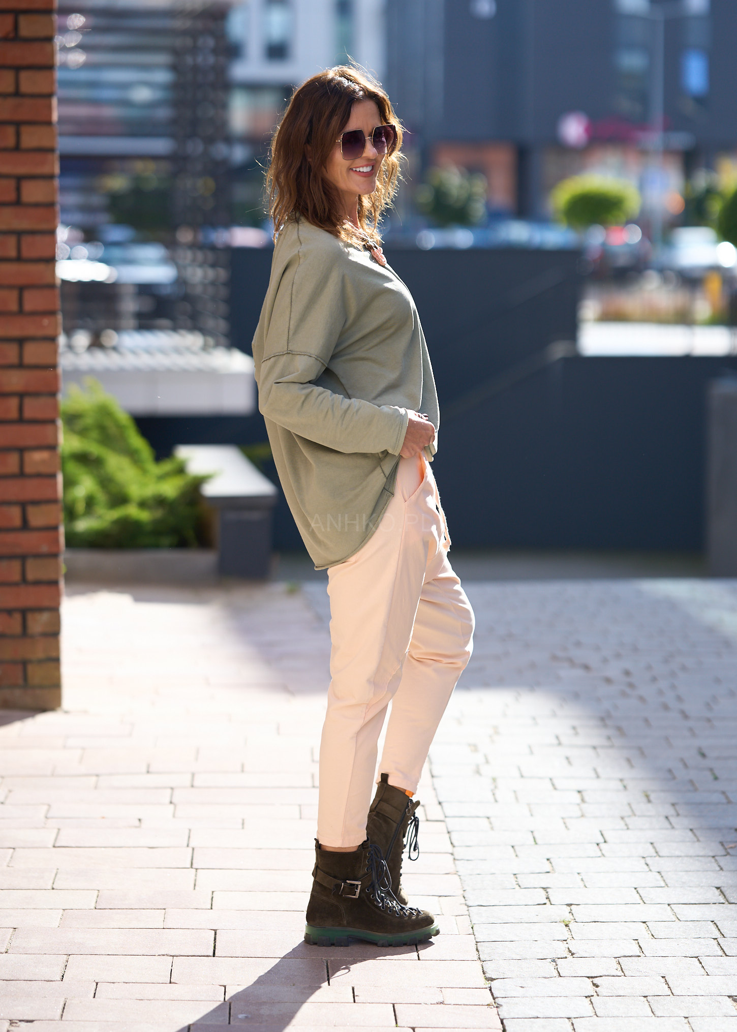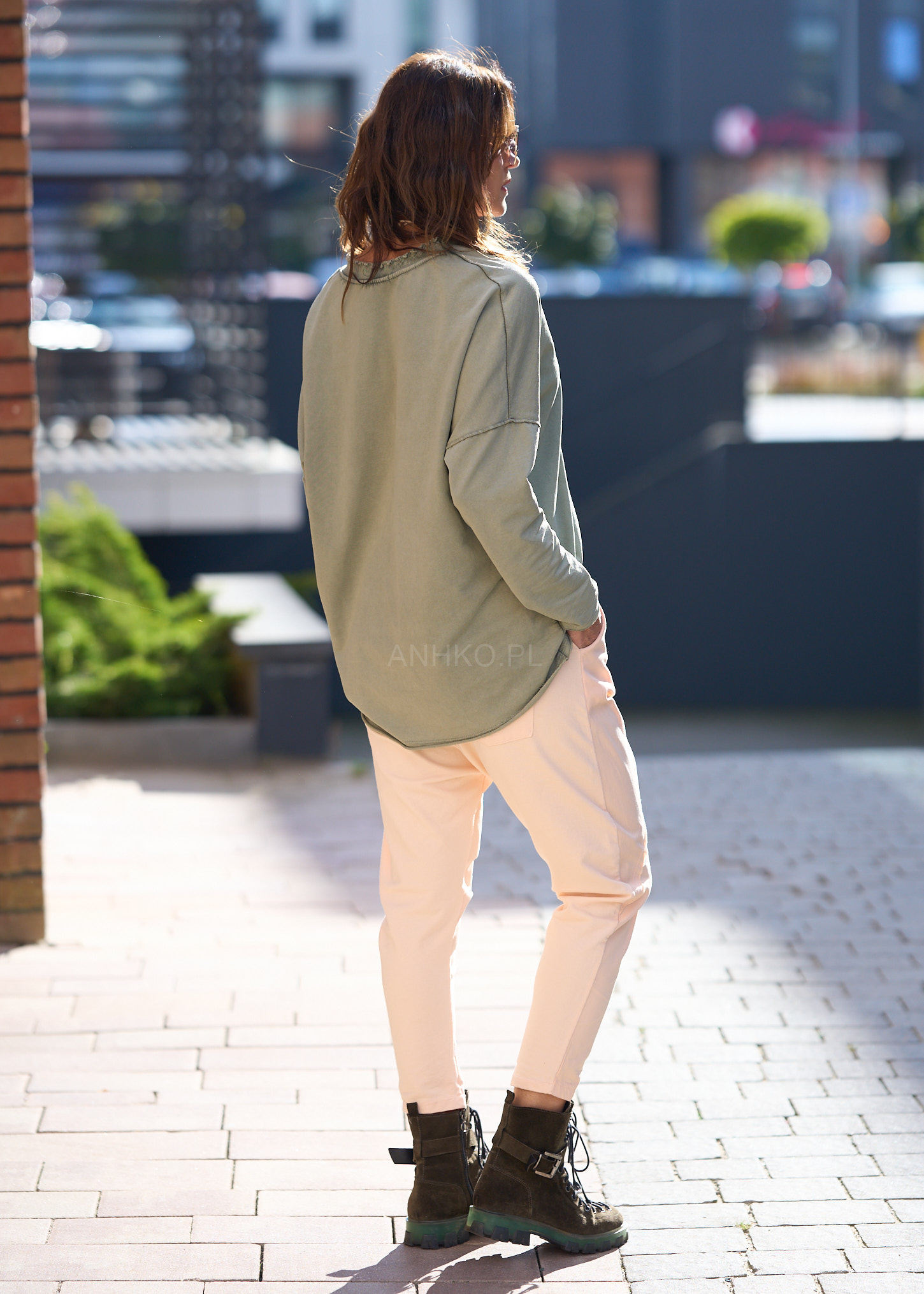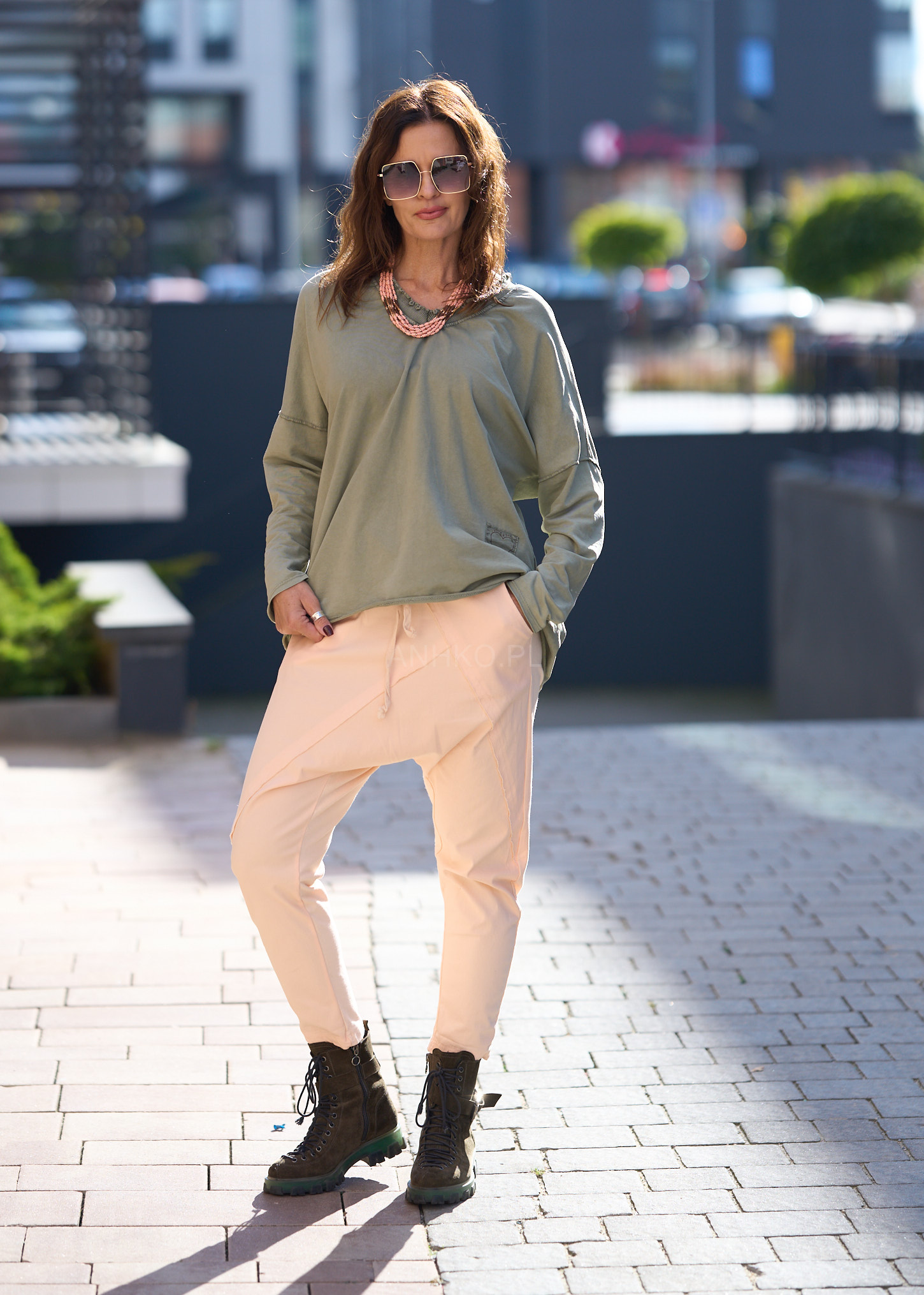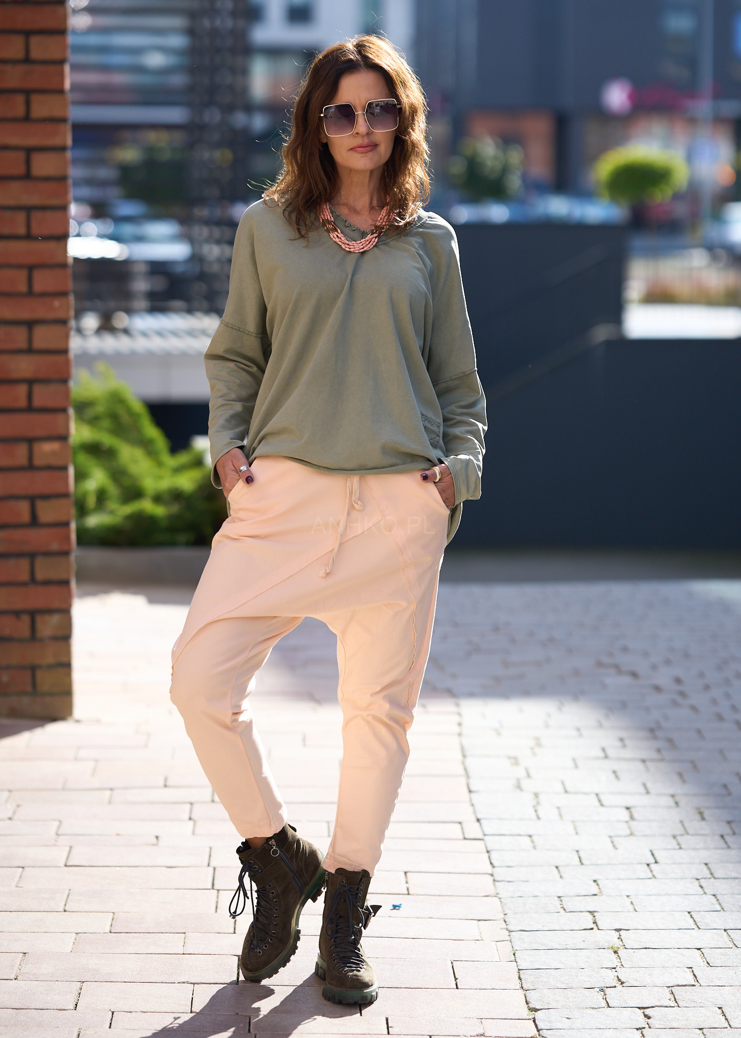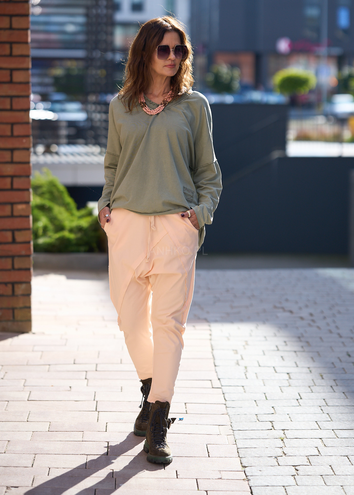 Spodnie Natale Morelowe - Luźne spodnie o asymetrycznym kroju w odcieniu jasnego beżu. Wygodne, stylowe i idealne do miejskich oraz casualowych stylizacji – połączenie luzu i kobiecej elegancji.