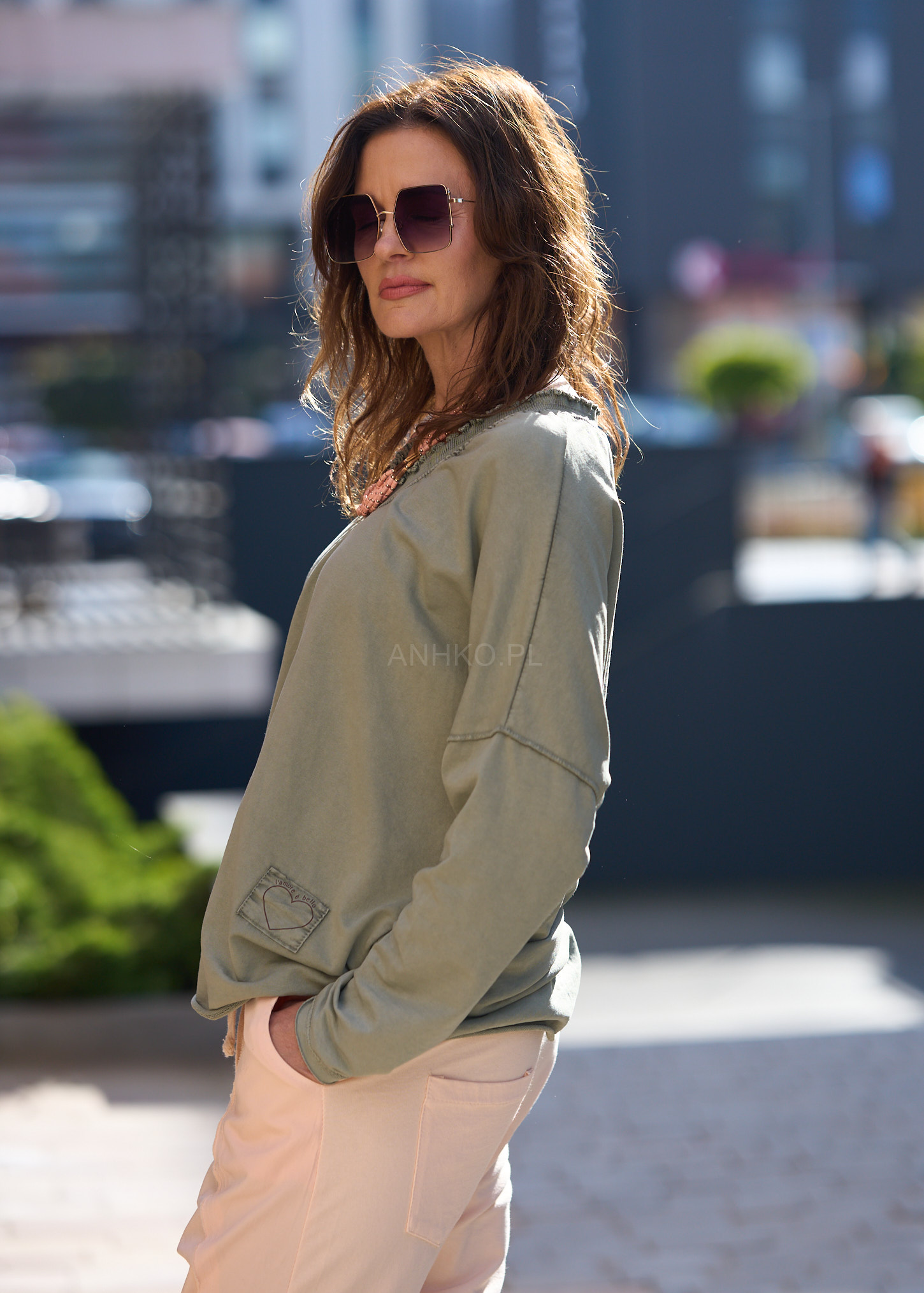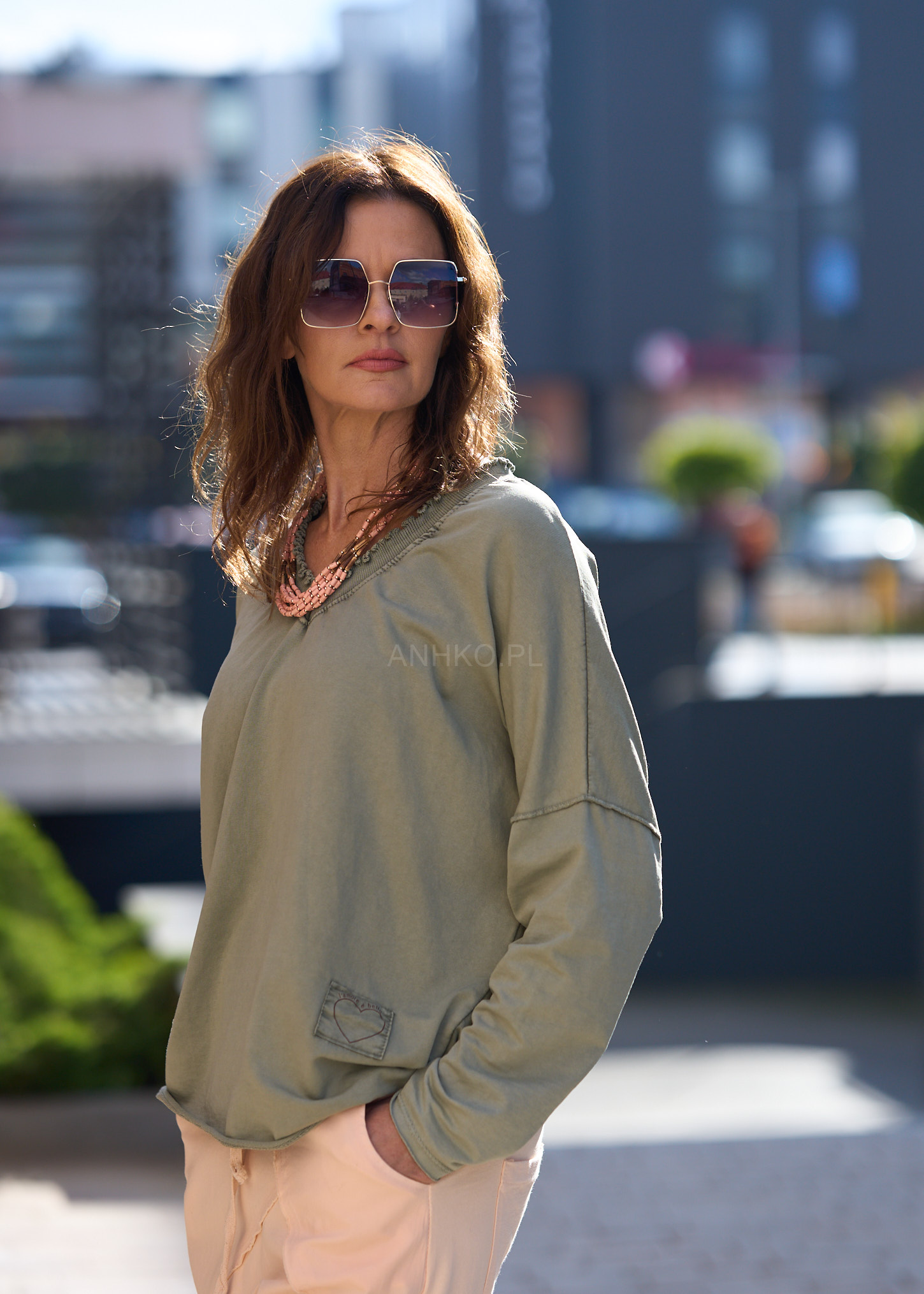 To połączenie włoskiego luzu i kobiecej subtelności. Wykonana z przyjemnej w dotyku bawełny z dodatkiem elastanu, doskonale dopasowuje się do sylwetki i zapewnia komfort przez cały dzień. Luźny krój i opuszczone ramiona tworzą swobodny, nonszalancki look. Ozdobny dekolt w kształcie litery V z delikatnymi marszczeniami dodaje jej wyjątkowego charakteru, a naszywka z motywem serca nadaje całości uroczego, włoskiego akcentu. Idealna do jeansów, spodni z lnu czy spódnic – sprawdzi się w stylizacjach casualowych i miejskich. Bluzka, która łączy prostotę z detalem, tworząc bazę wielu codziennych zestawów.
