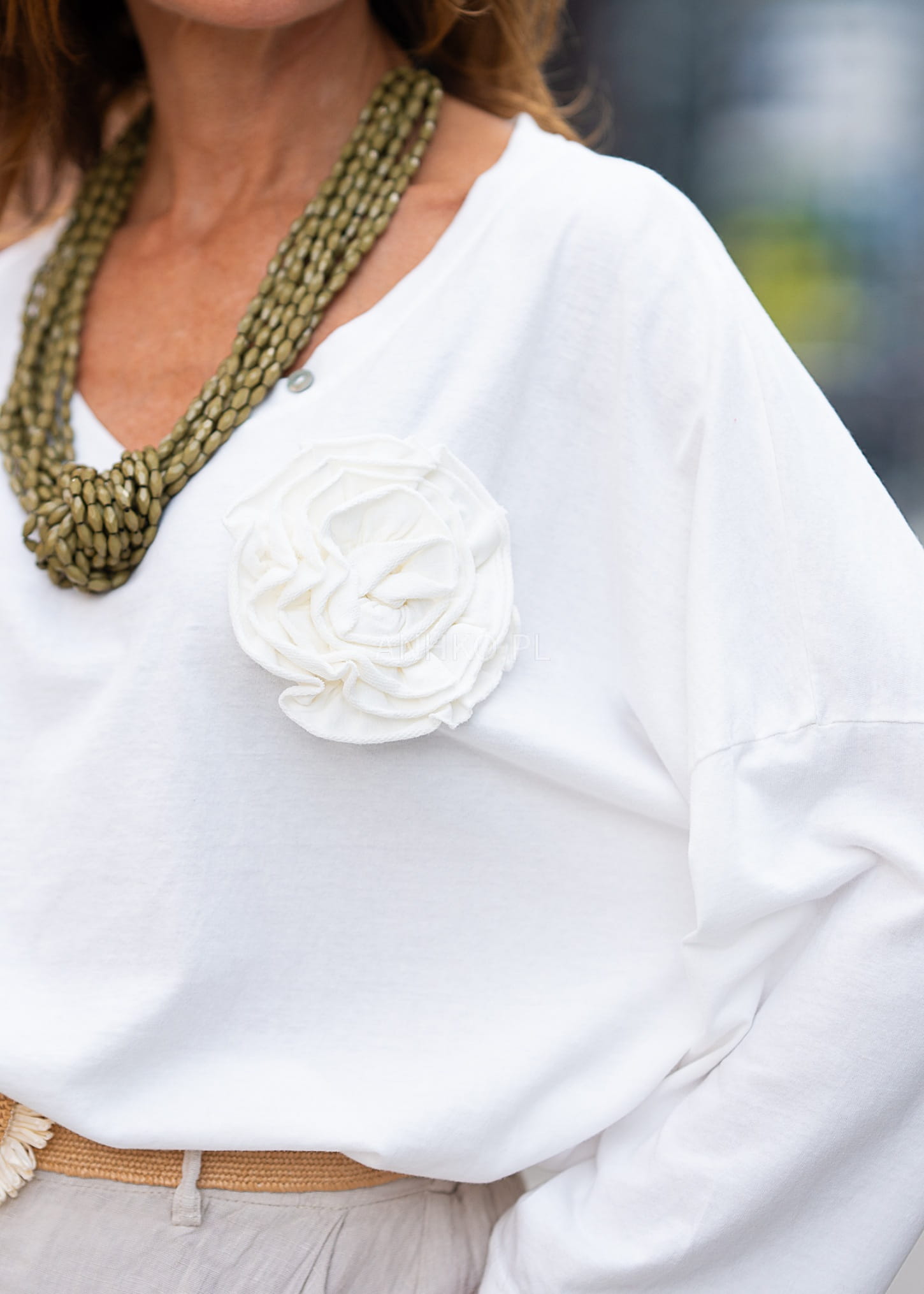 To subtelna propozycja, która łączy komfort bawełny z kobiecym detalem w postaci kwiatowej aplikacji przy dekolcie. Dekolt w kształcie litery V został ozdobiony trzema guzikami, co nadaje całości delikatny, stylowy akcent. Idealna do jeansów, spódnic, czy eleganckich spodni – sprawdzi się zarówno w pracy, jak i na spacerze czy kolacji. Naturalna bawełna zapewnia oddychalność i wygodę przez cały dzień, a włoskie wykonanie gwarantuje wysoką jakość.