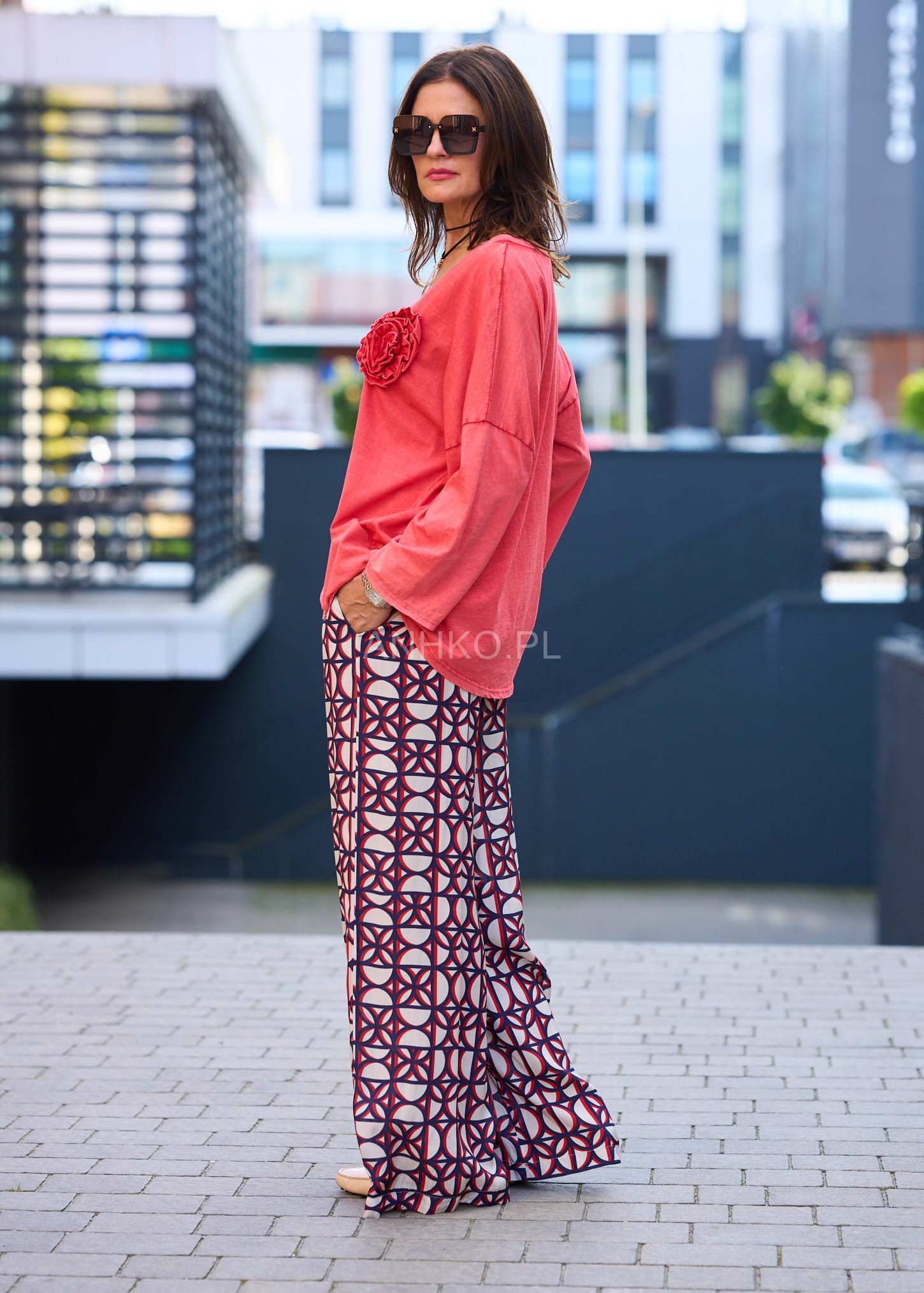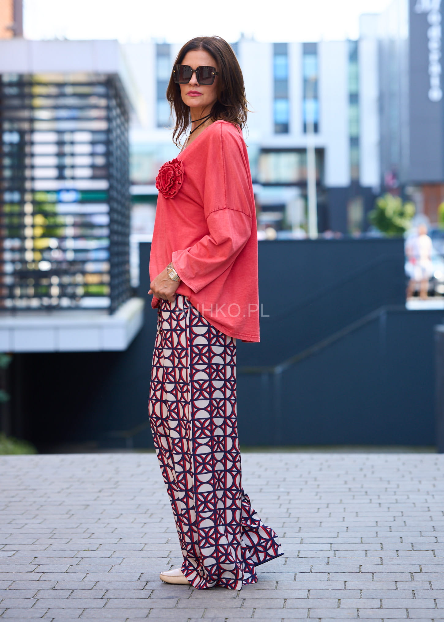 Spodnie Retro Geometry Beżowo-Czerwono-Granatowe - Wzorzyste, szerokie spodnie z geometrycznym motywem w stylu retro. Wygodny fason z gumką w pasie i kieszeniami bocznymi. Idealne na lato, spacery, do pracy i na urlop.