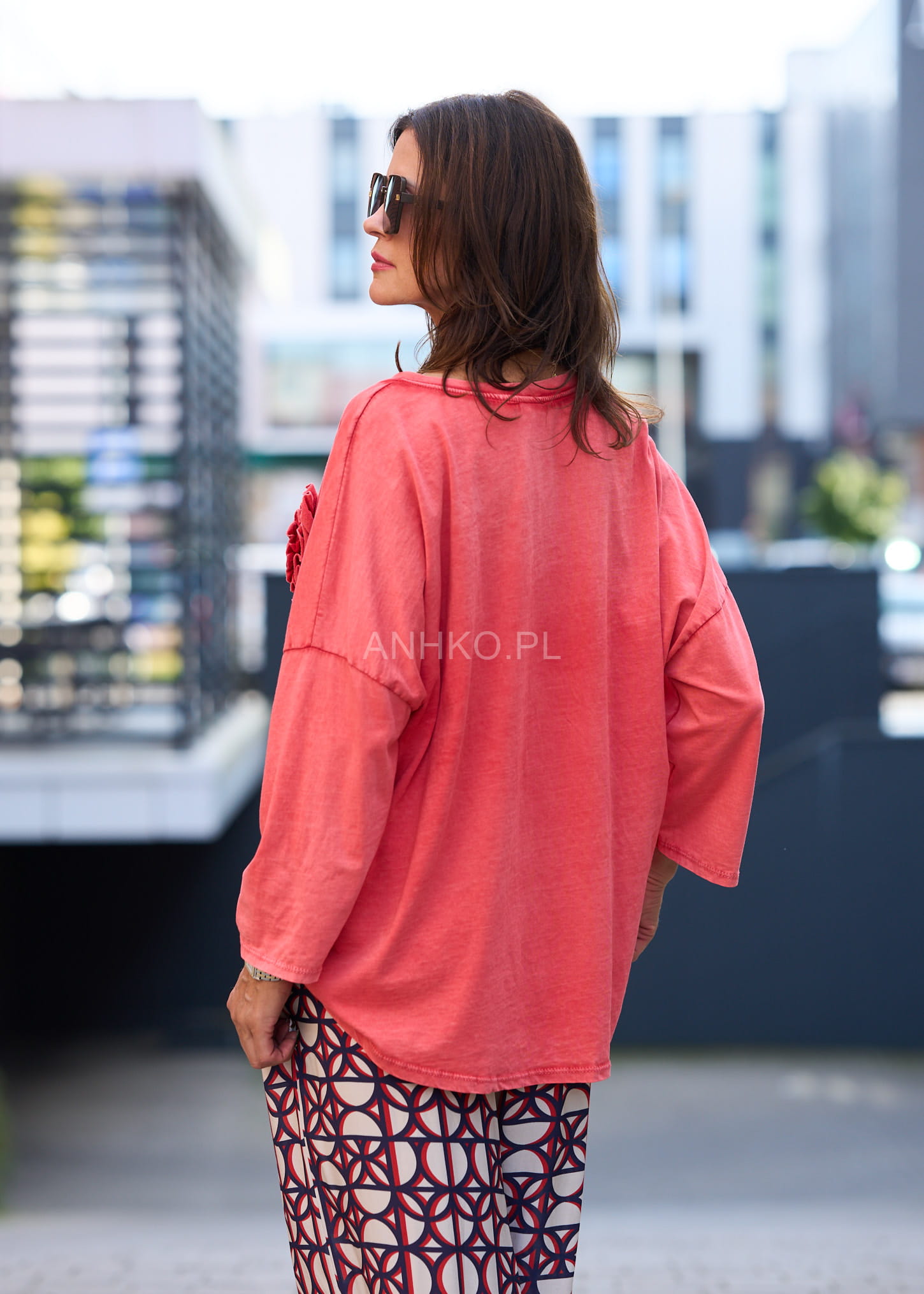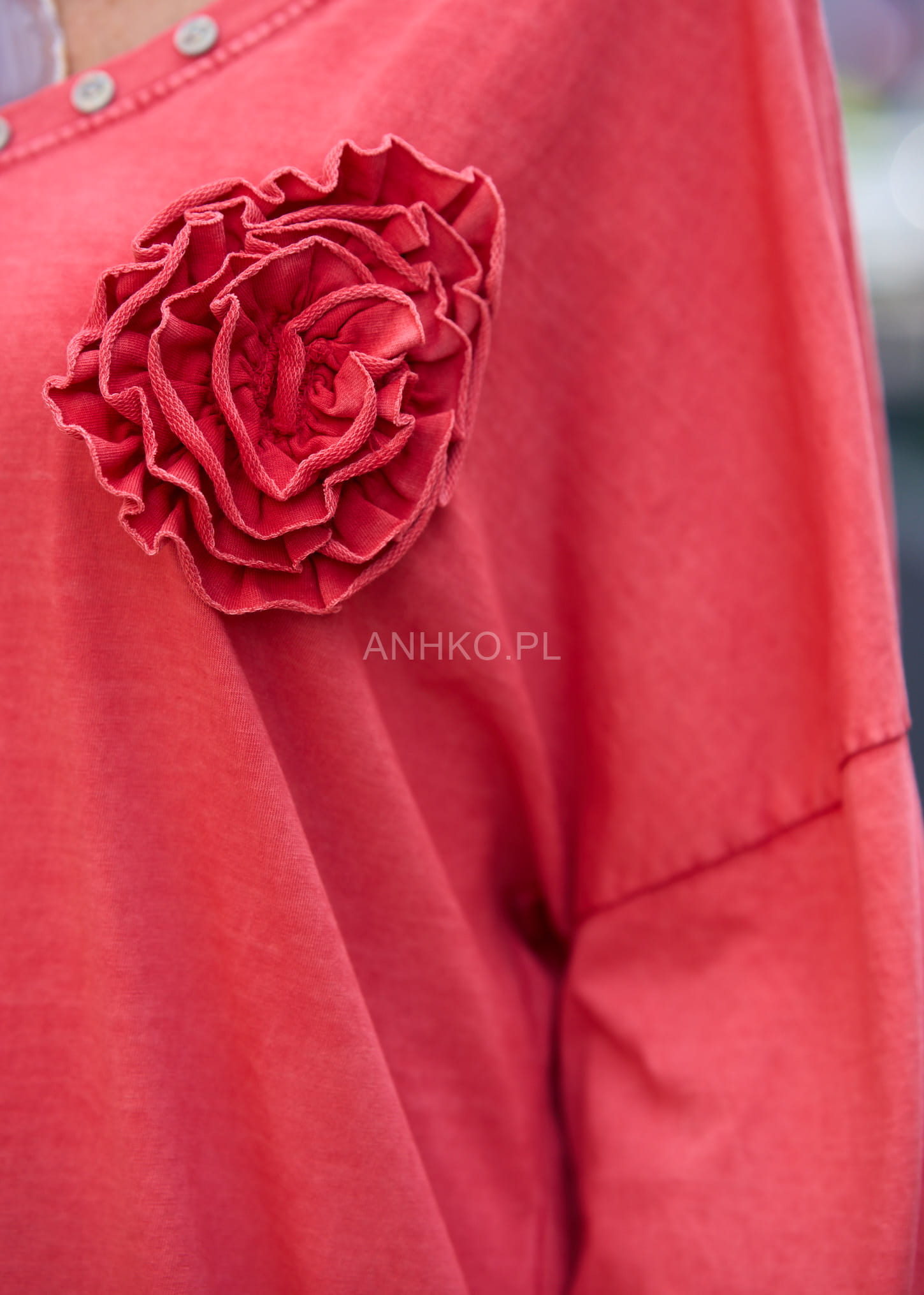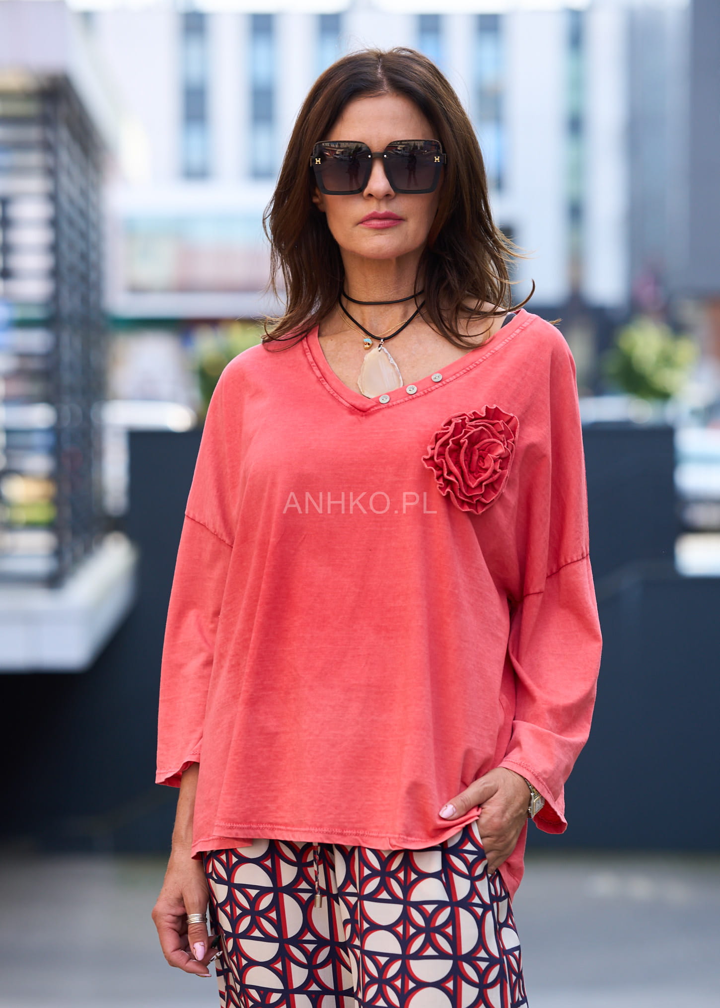 To subtelna propozycja, która łączy komfort bawełny z kobiecym detalem w postaci kwiatowej aplikacji przy dekolcie. Dekolt w kształcie litery V został ozdobiony trzema guzikami, co nadaje całości delikatny, stylowy akcent. Idealna do jeansów, spódnic, czy eleganckich spodni – sprawdzi się zarówno w pracy, jak i na spacerze czy kolacji. Naturalna bawełna zapewnia oddychalność i wygodę przez cały dzień, a włoskie wykonanie gwarantuje wysoką jakość.