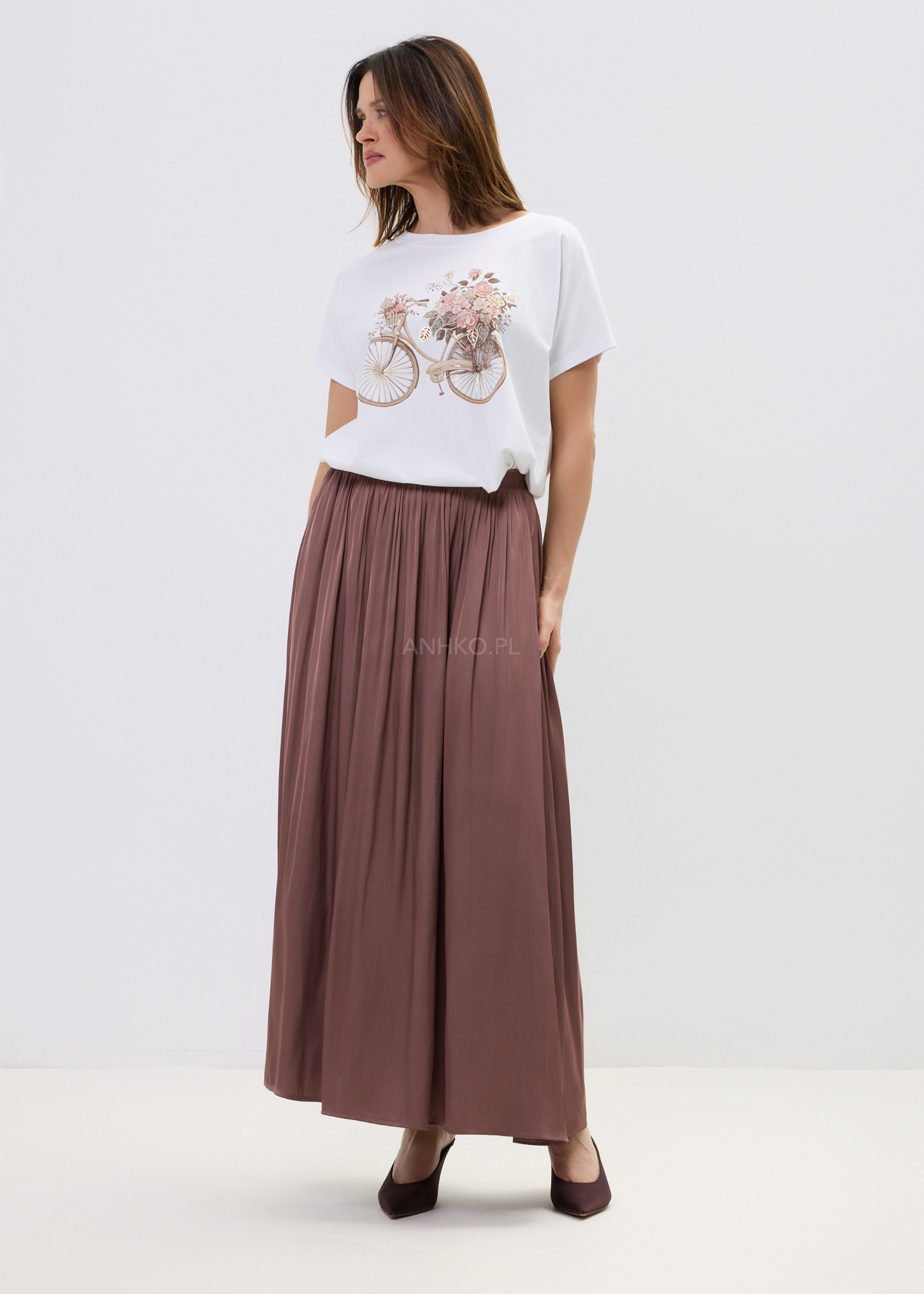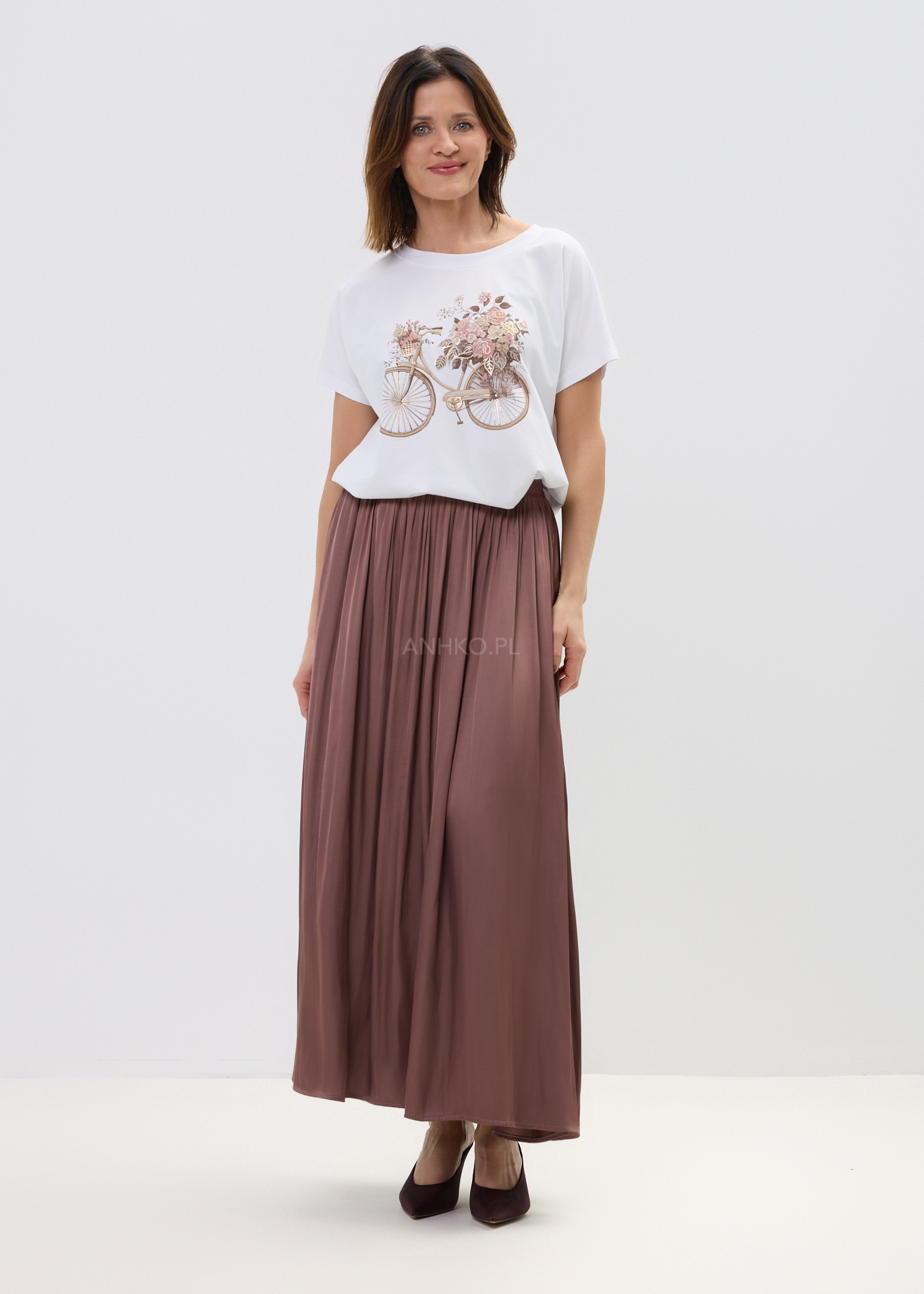 Komplet Satin Flow Brązowy - Elegancki komplet w satynowym wykończeniu, który łączy luz z kobiecym szykiem. Lekko połyskująca tkanina, zwiewna spódnica i bluzka z wiązaniem tworzą gotową stylizację na każdą okazję.