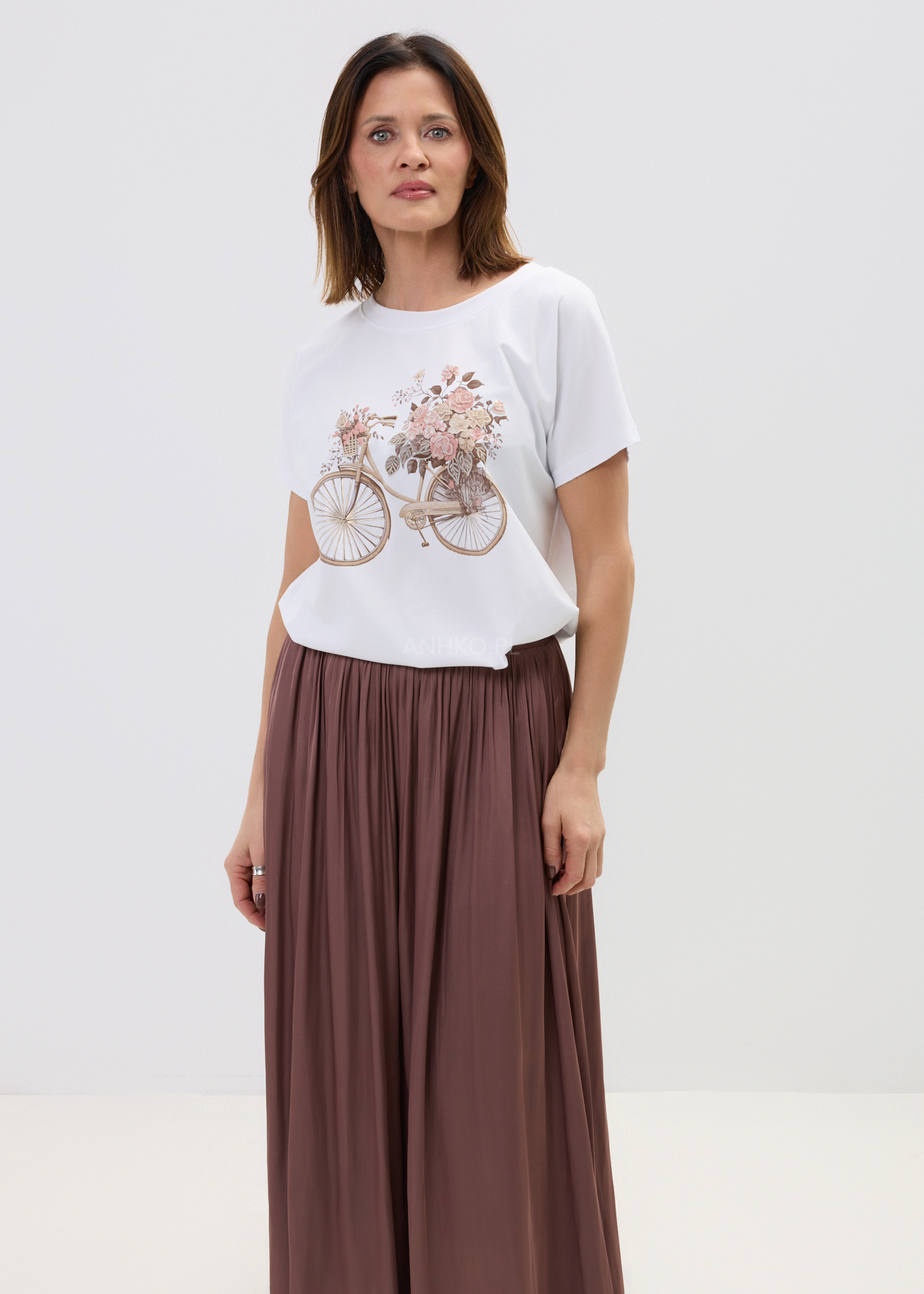 T-shirt Flower Ride to propozycja dla osób, które lubią casual z odrobiną artystycznego akcentu. Ta koszulka damska w białym kolorze została ozdobiona wyjątkowym nadrukiem przedstawiającym rower wypełniony bukietem kwiatów, który przyciąga uwagę i nadaje stylizacji lekko artystycznego charakteru. Całość uzupełnia dekoracyjne subtelne wypukłe elementy nadruku, które dodają grafice głębi i oryginalności.