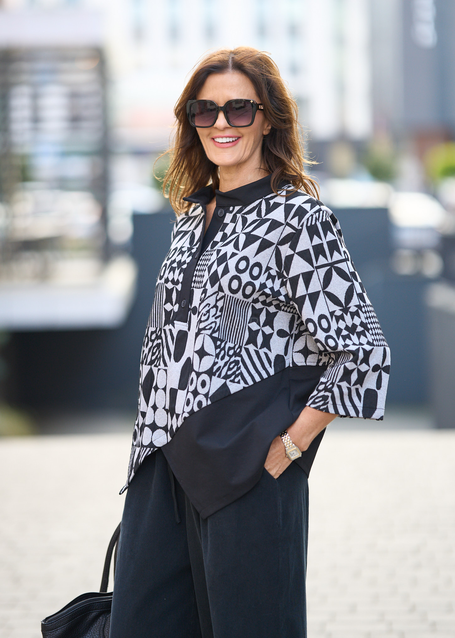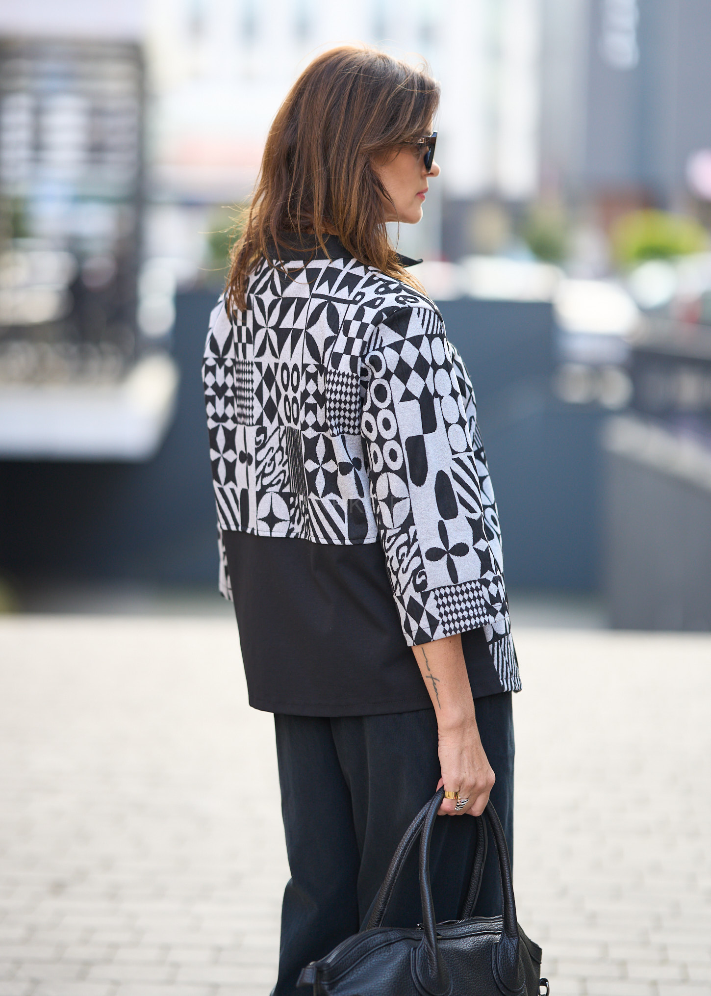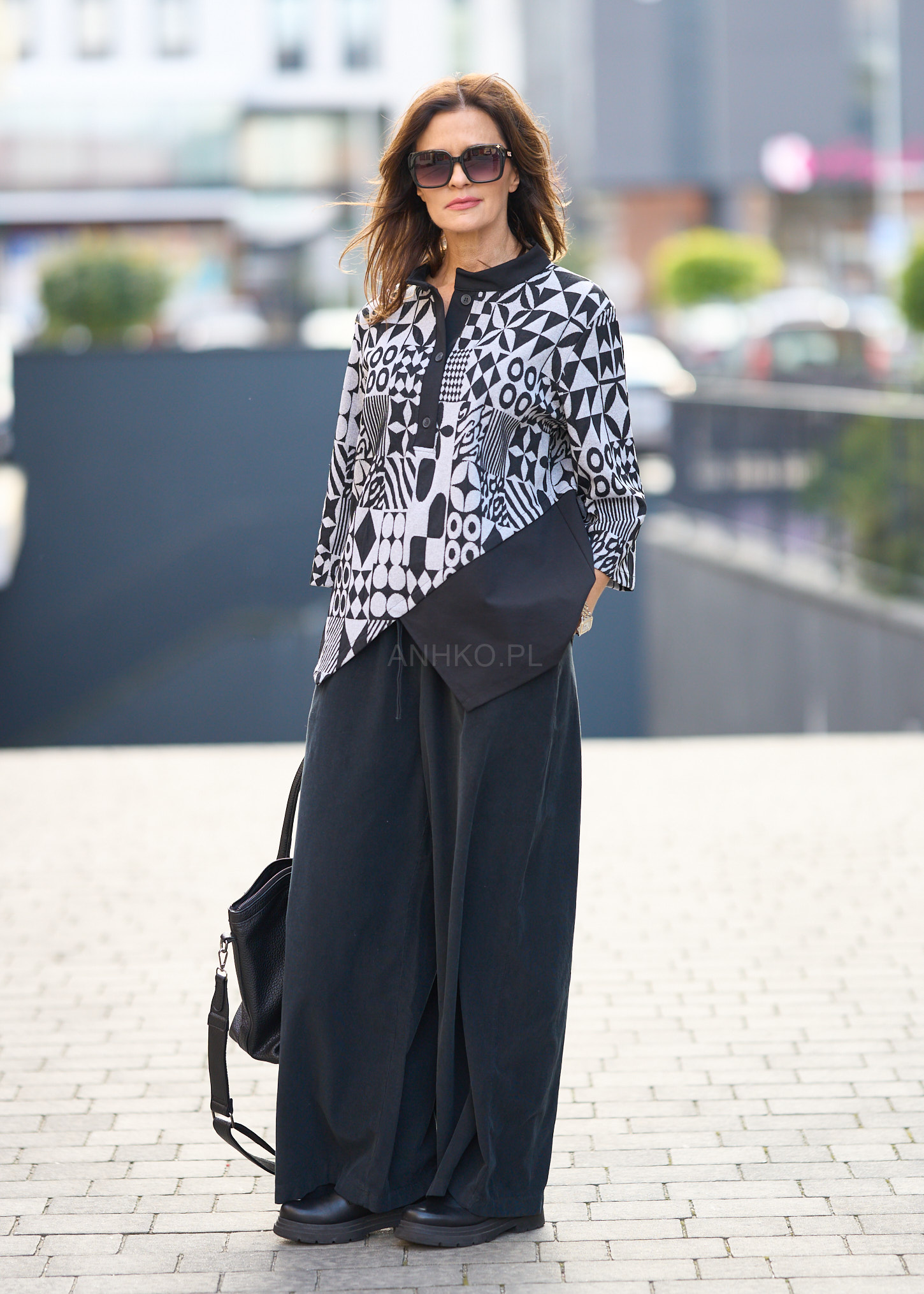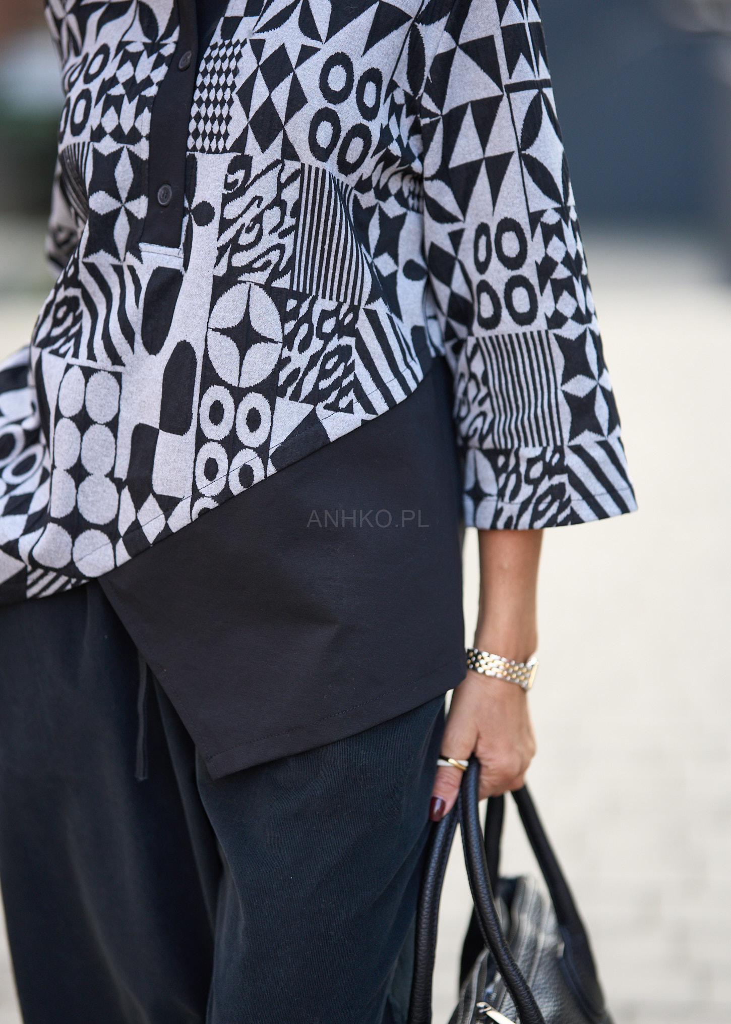 To wyjątkowa propozycja dla osób ceniących oryginalność i komfort. Włoska jakość i charakterystyczny czarno-szary wzór geometryczny sprawiają, że bluzka wyróżnia się na tle innych. Dzięki mieszance poliestru, bawełny i elastanu, materiał jest elastyczny i przyjemny w noszeniu. Asymetryczny krój dodaje nowoczesności, doskonale sprawdzając się w połączeniu z czarnymi spodniami, jeansami lub spódnicą. Idealna na casualowe wyjścia, spotkania w pracy czy wizyty w galerii sztuki. Ta bluzka to must-have w szafie każdej miłośniczki mody.