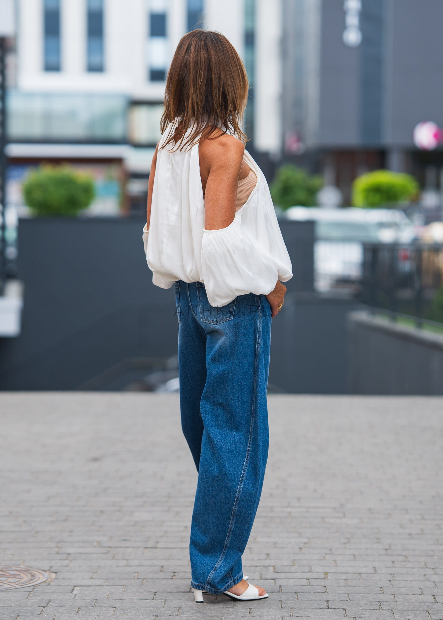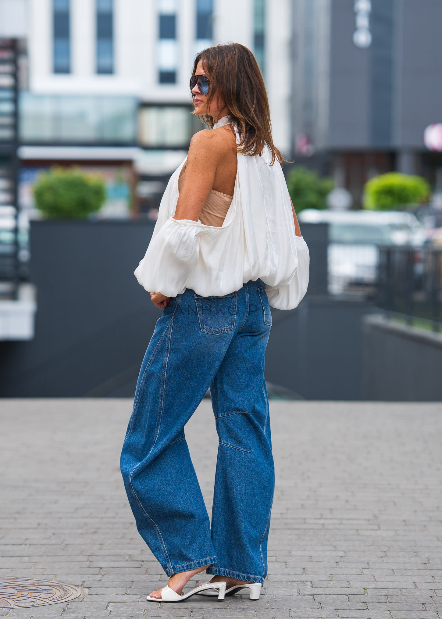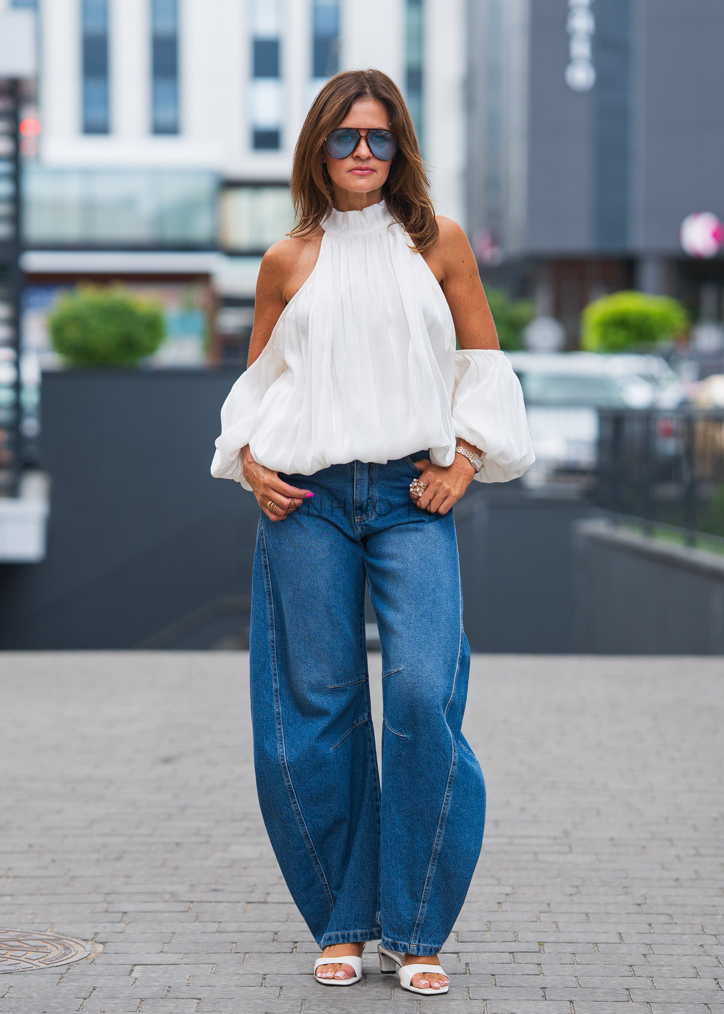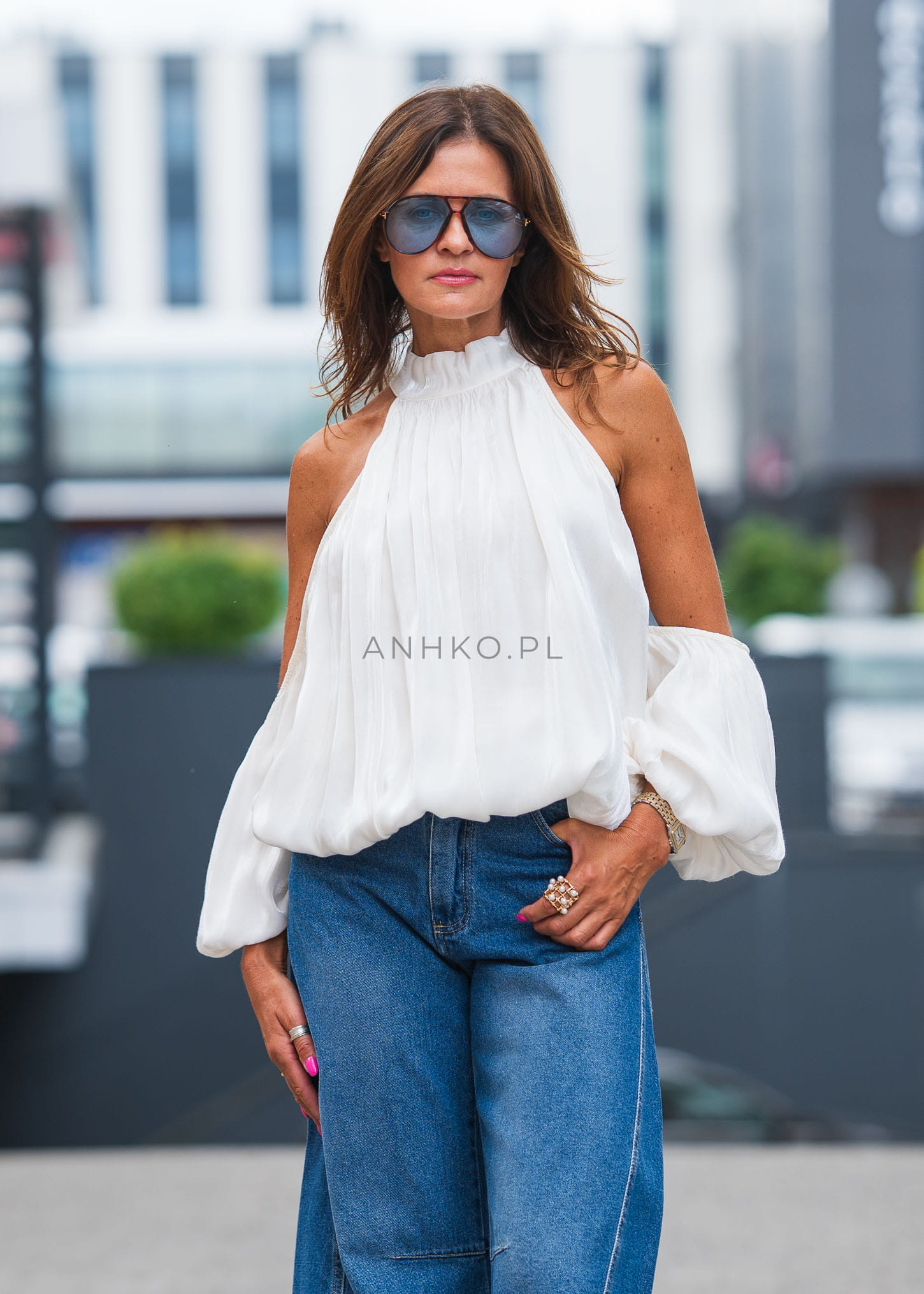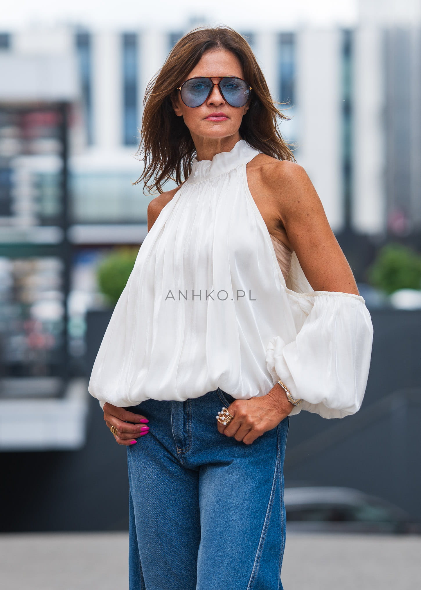 To spektakularna propozycja dla kobiet, które lubią przyciągać spojrzenia. Błyszczący materiał z delikatnymi refleksami w odcieniu Śmietankowym nadaje bluzce elegancki, wręcz bajkowy charakter. Charakterystyczne balonowe rękawy i marszczony krój zapewniają objętość i swobodę, a subtelne guziczki przy szyi dodają jej klasy. Doskonała na specjalne okazje, takie jak wesela, gale, imprezy wieczorowe czy wyjątkowe randki. Łącz ją z prostymi szpilkami i minimalistyczną biżuterią, by podkreślić jej wyrazisty design.