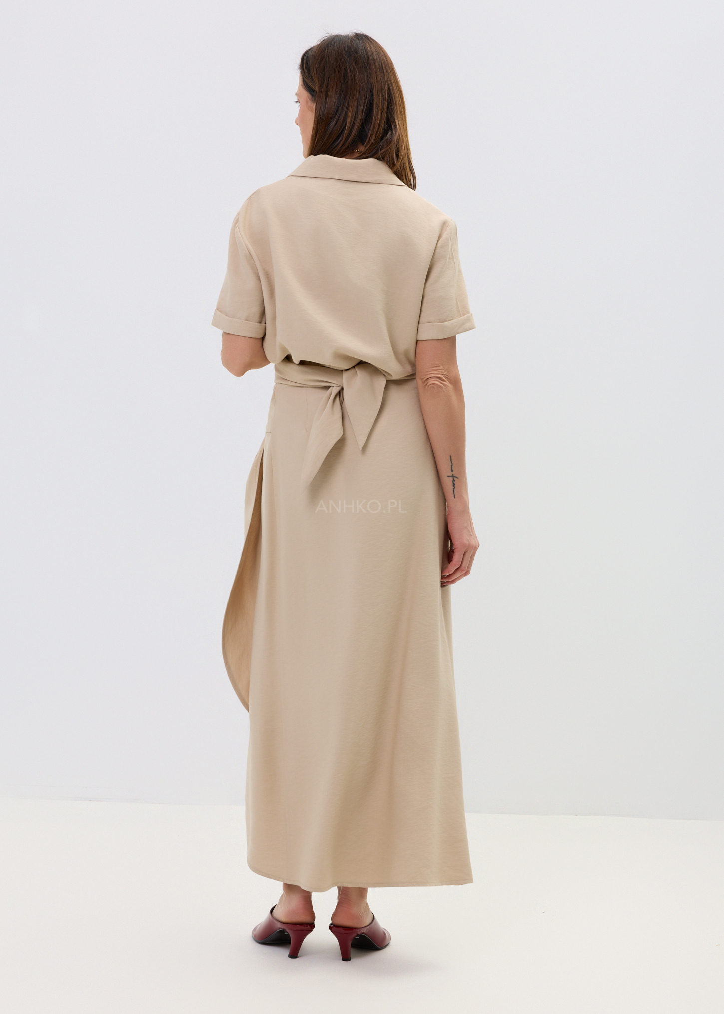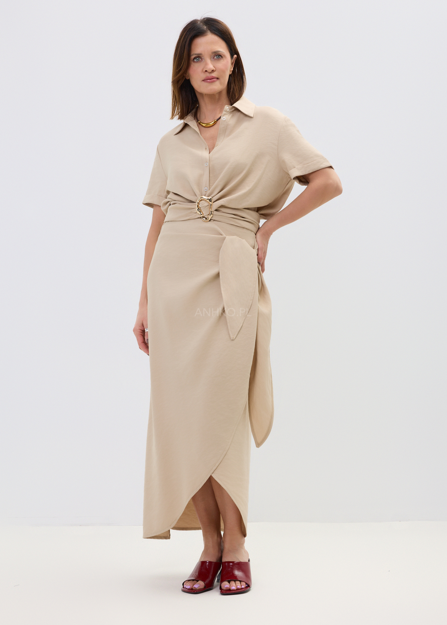Spódnica Wiązana Cielo Wrap Beżowa - Lekka, kobieca spódnica midi z kopertowym wiązaniem, która pięknie układa się w ruchu. Asymetryczny krój dodaje jej charakteru, a neutralny odcień camel pasuje do wszystkiego.