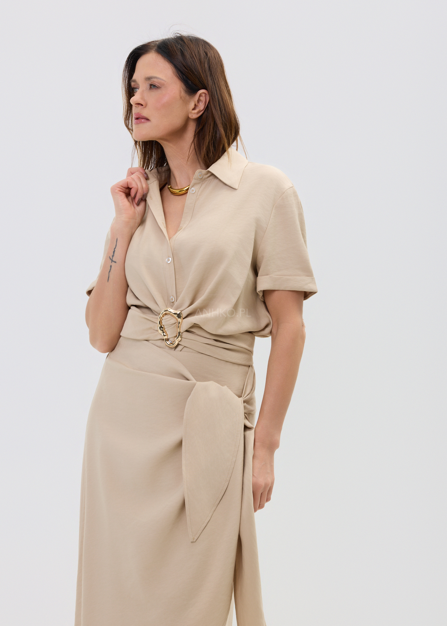 Miękki, lekko lejący materiał sprawia, że bluzka porusza się wraz z ciałem, zapewniając komfort przez cały dzień. Złoty detal przyciąga spojrzenia i dodaje stylizacji charakteru, a ponadczasowa forma pozwala łączyć ją zarówno z szerokimi spodniami, jak i dopasowaną spódnicą czy denimem.