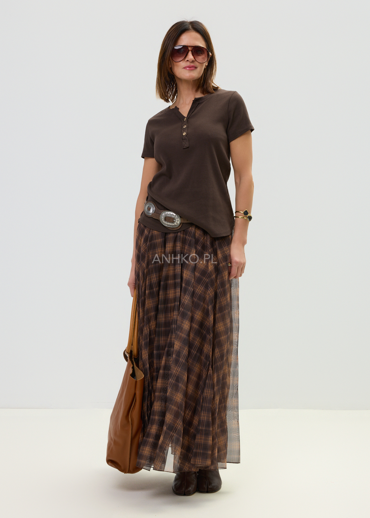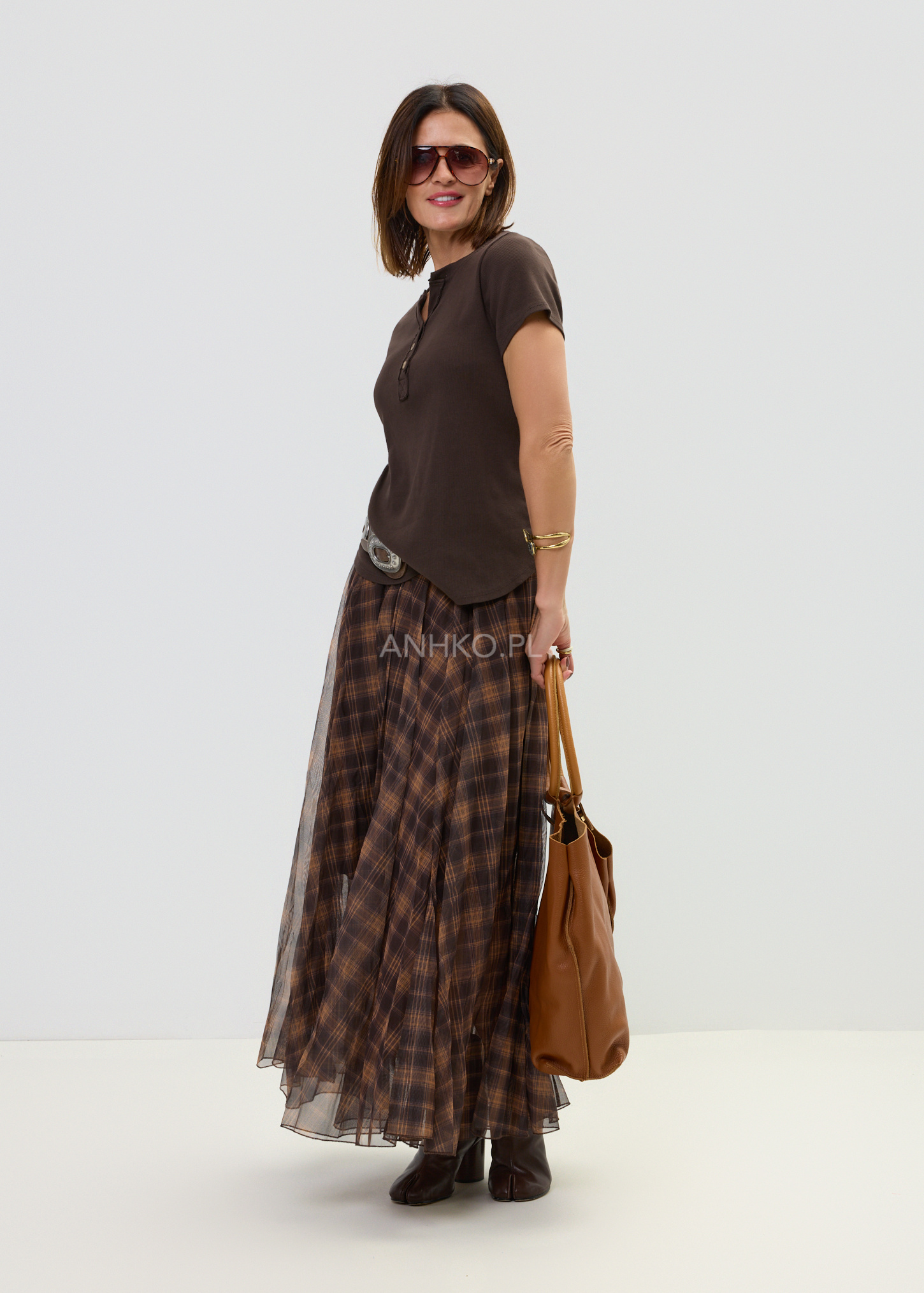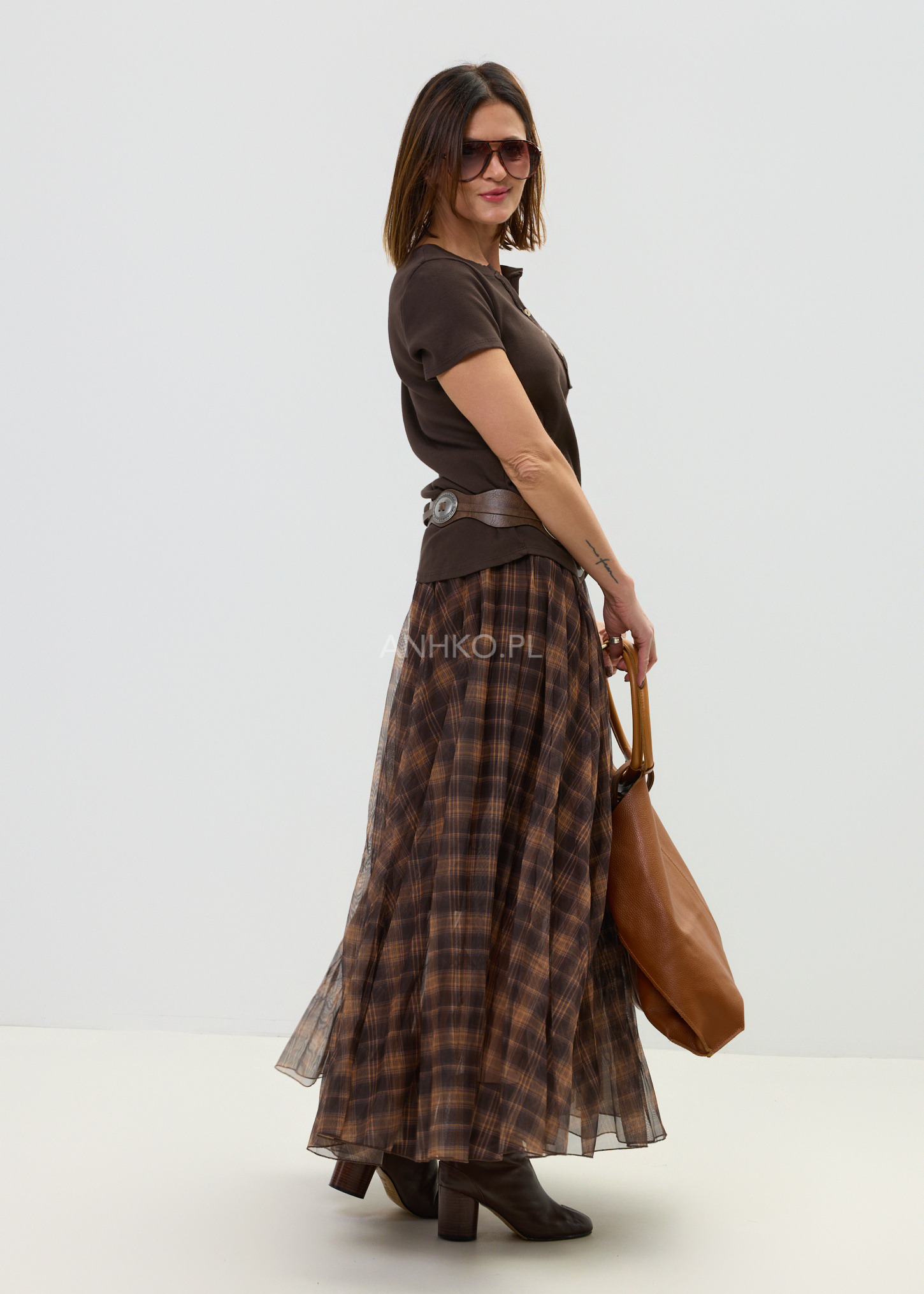 Spódnica Helia Check Brązowa w Kratę - Lekka spódnica maxi w modną kratę, która pięknie układa się w ruchu. Zwiewna warstwa zewnętrzna i podszewka zapewniają komfort noszenia, a elastyczna talia sprawia, że model świetnie dopasowuje się do sylwetki.