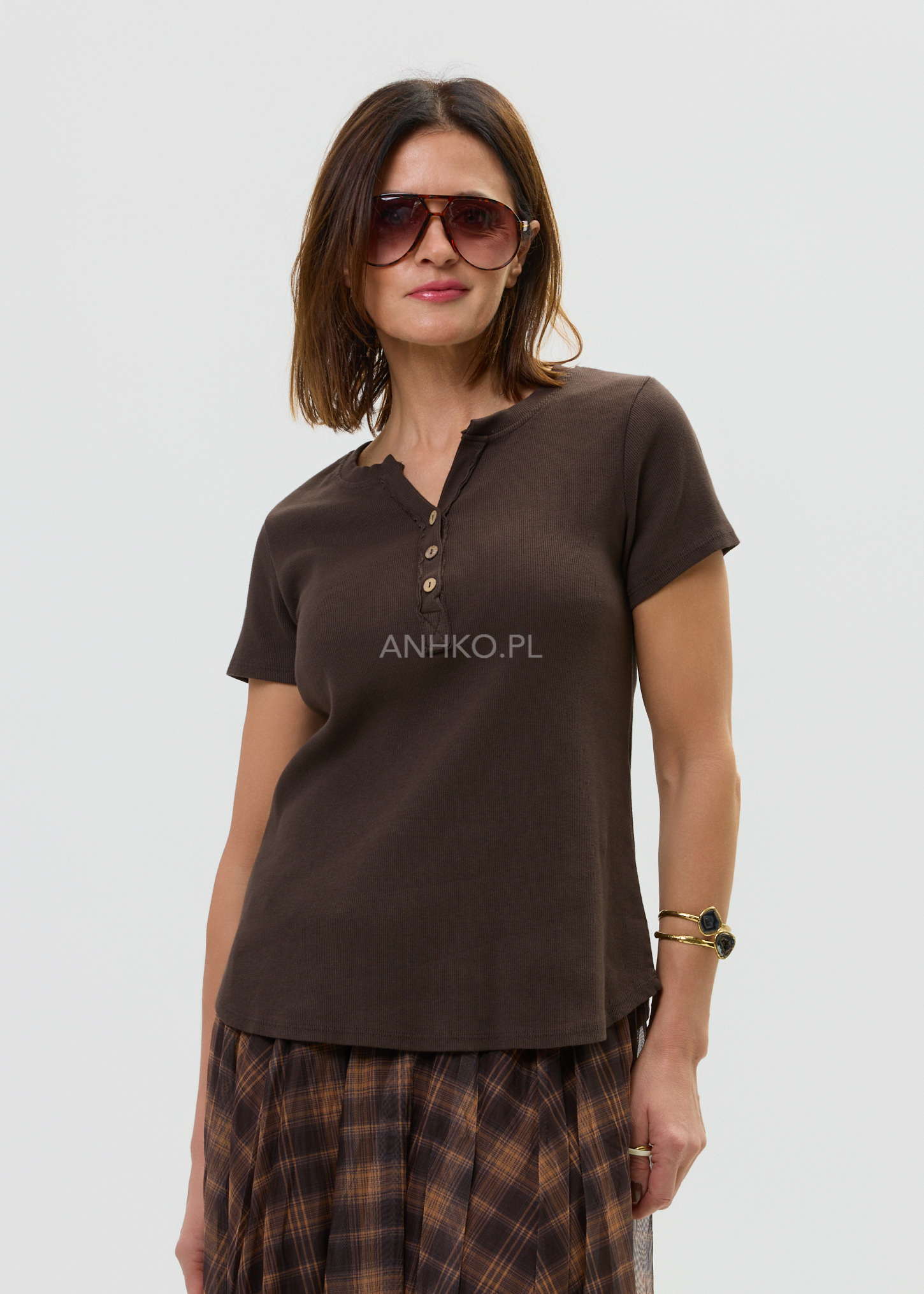 Krótki rękaw i miękka, prążkowana struktura materiału sprawiają, że bluzka świetnie sprawdza się jako element stylizacji warstwowych. Elastyczna dzianina dopasowuje się do figury, klasyczny okrągły dekolt z guzikami dodaje charakteru, a czekoladowy odcień łatwo łączy się z jeansami, spódnicami czy marynarką. To uniwersalny model, który sprawdzi się zarówno w casualowych zestawach, jak i bardziej dopracowanych stylizacjach.