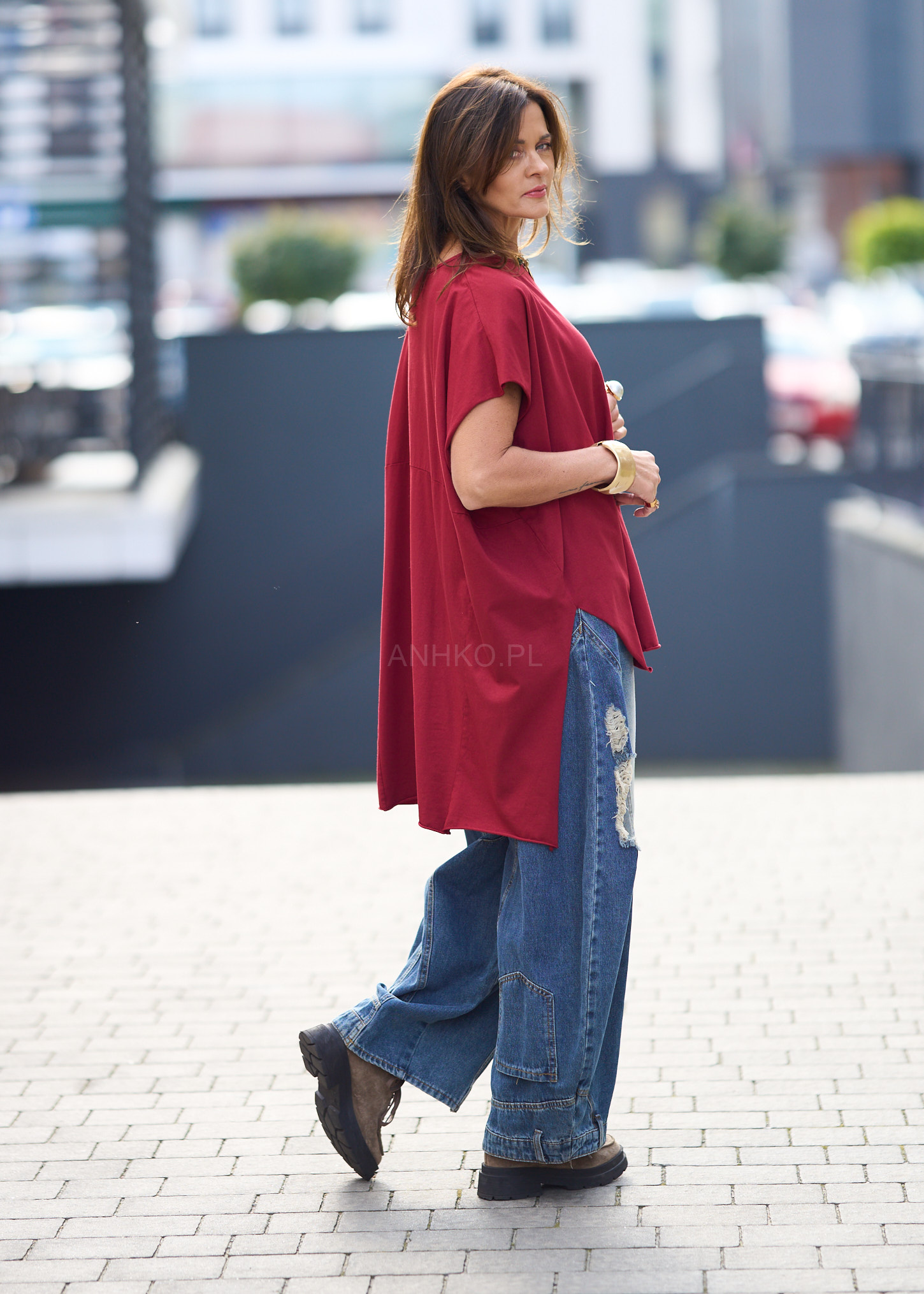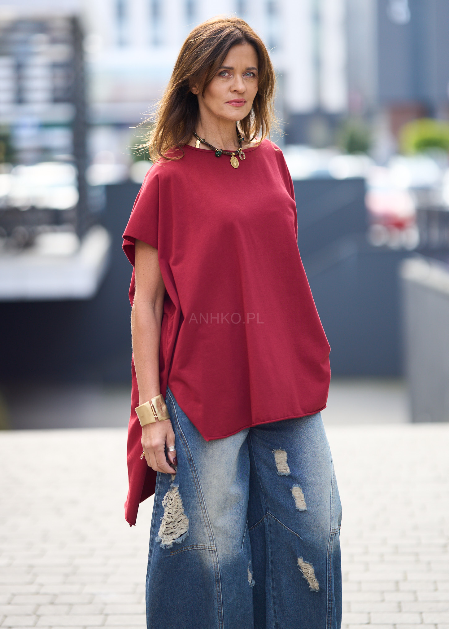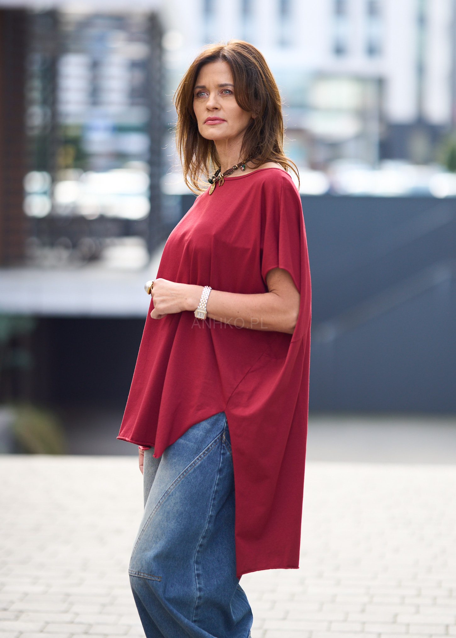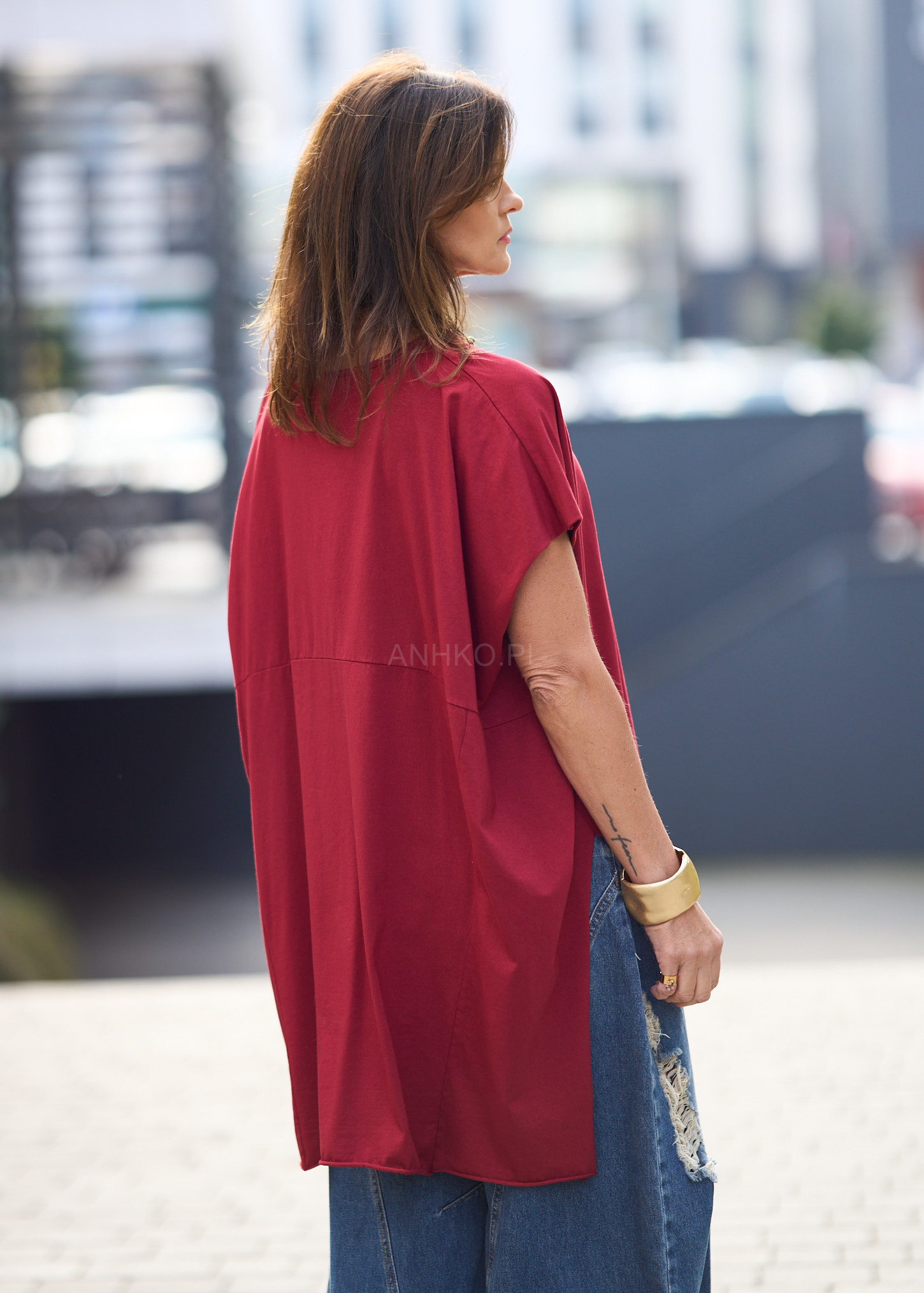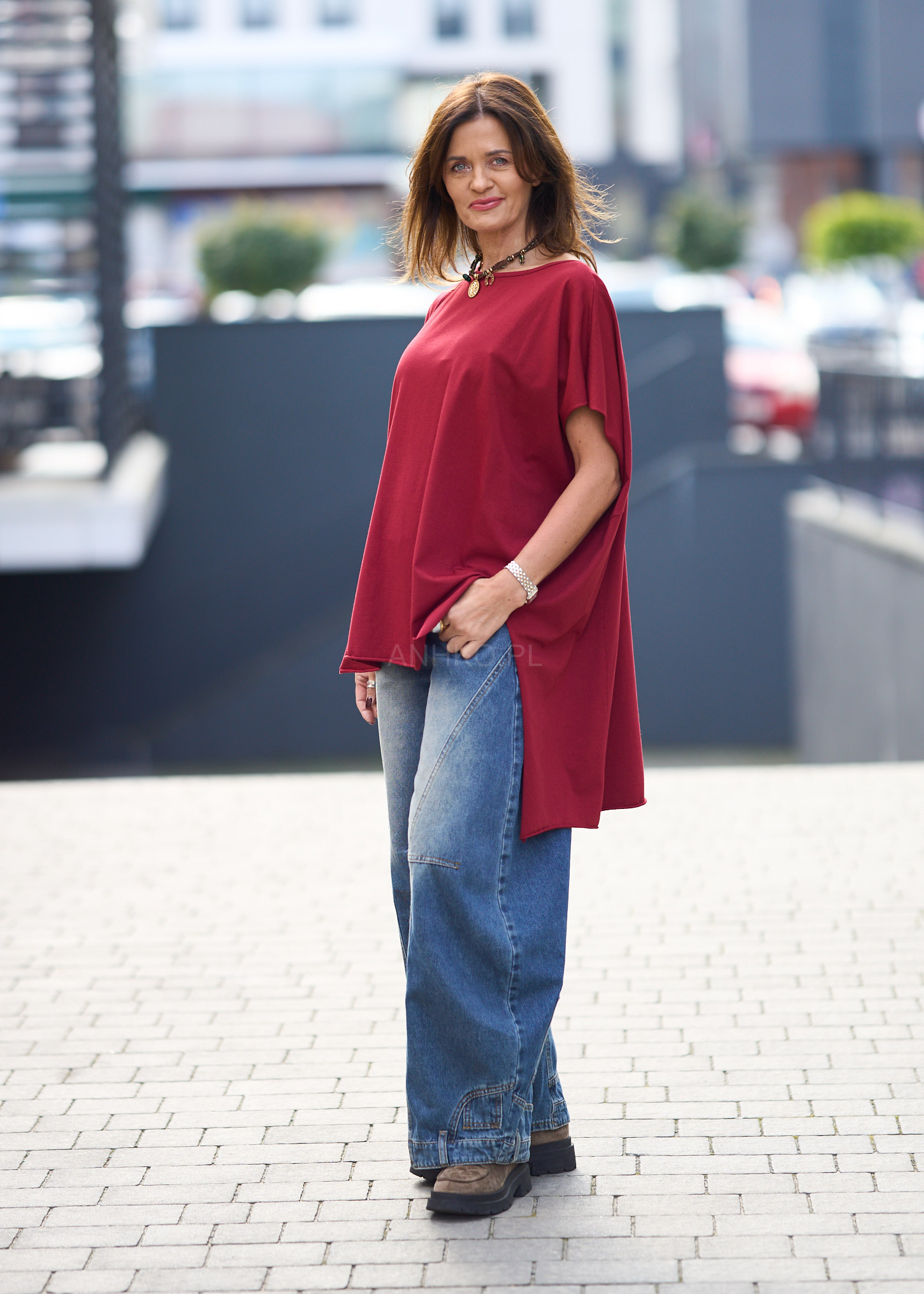 Bordowy odcień dodaje całości charakteru, a klasyczny dekolt subtelnie równoważy awangardową formę. To fason, który świetnie łączy wygodę z modowym wykończeniem i dobrze komponuje się z denimem, dopasowanym dołem albo bardziej eleganckimi elementami garderoby.