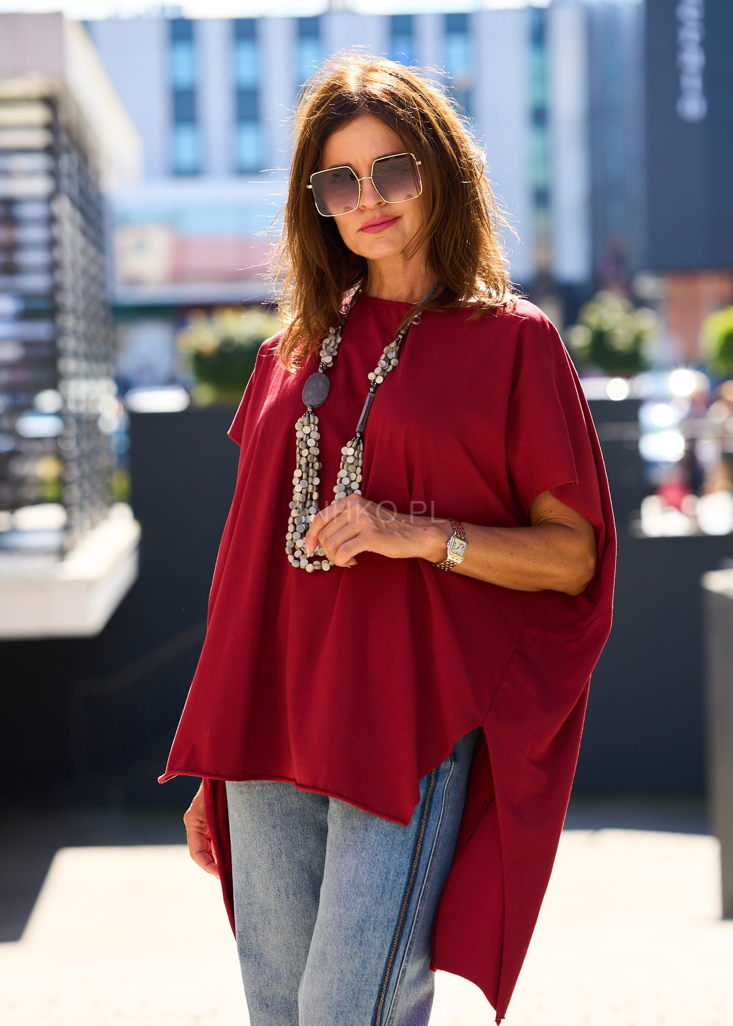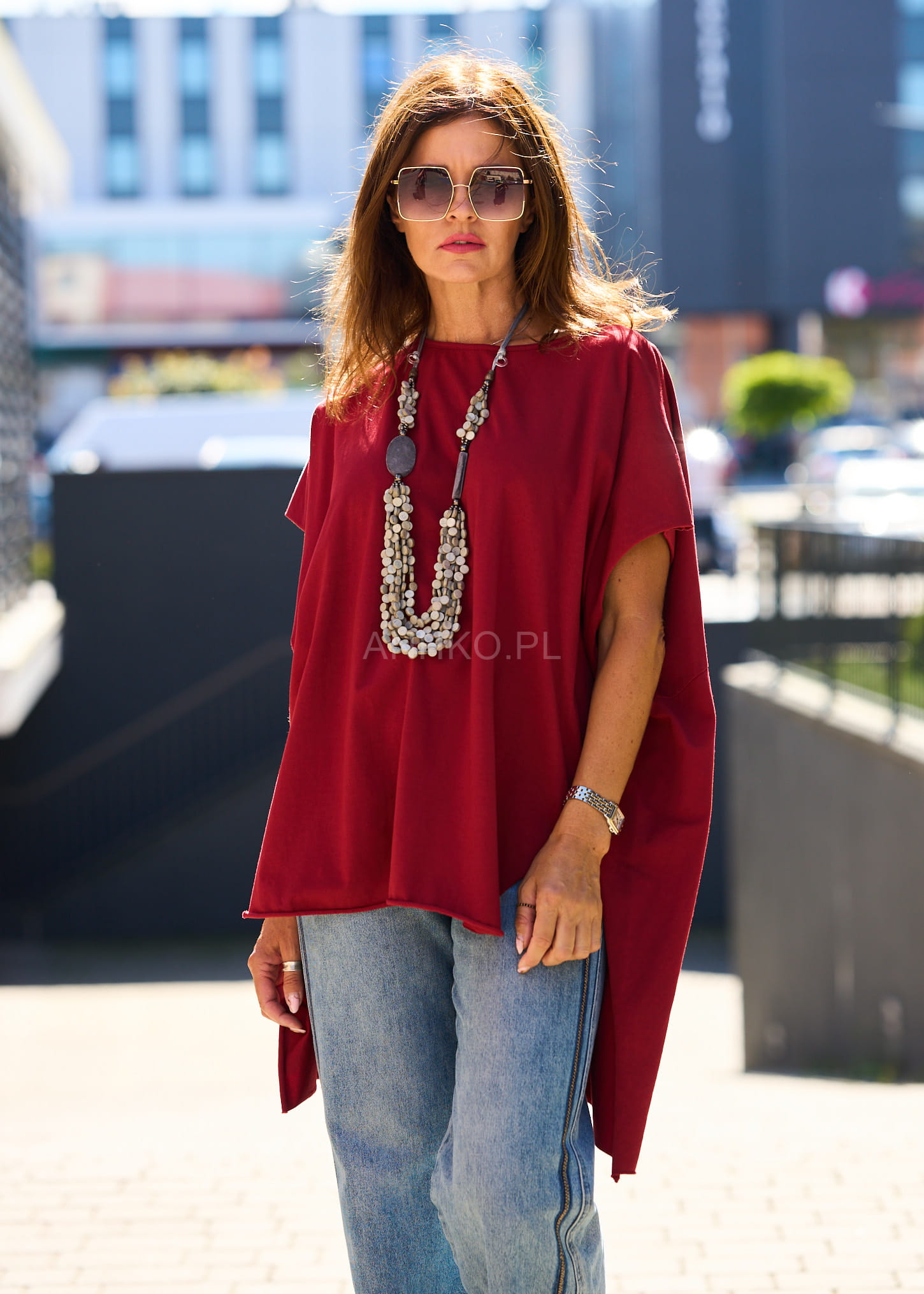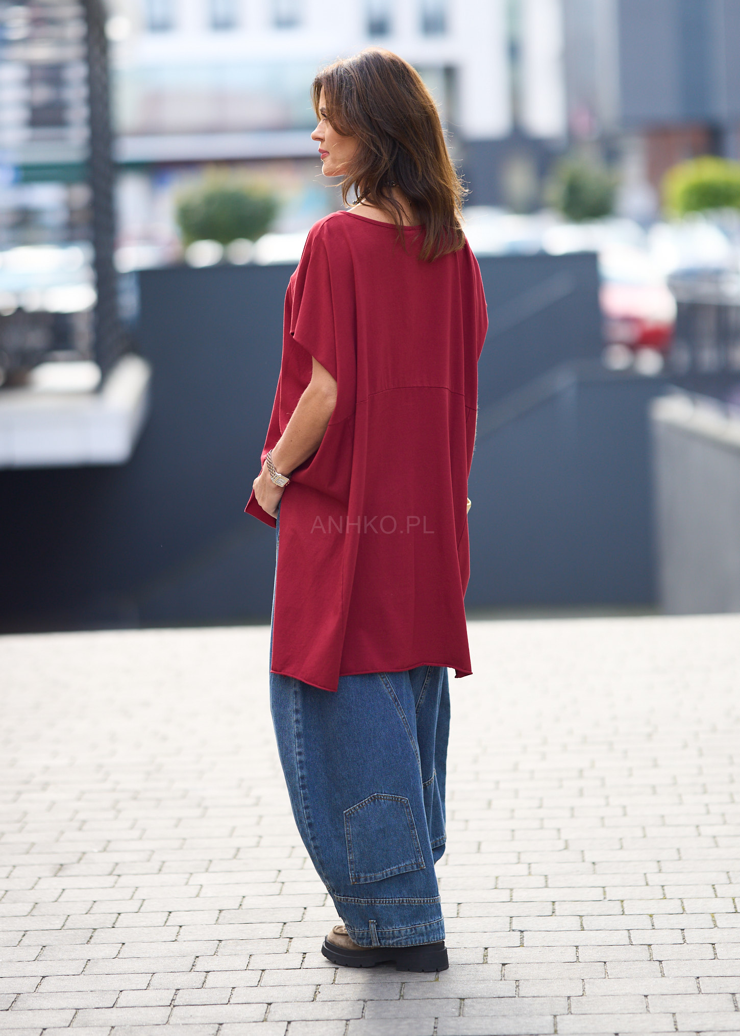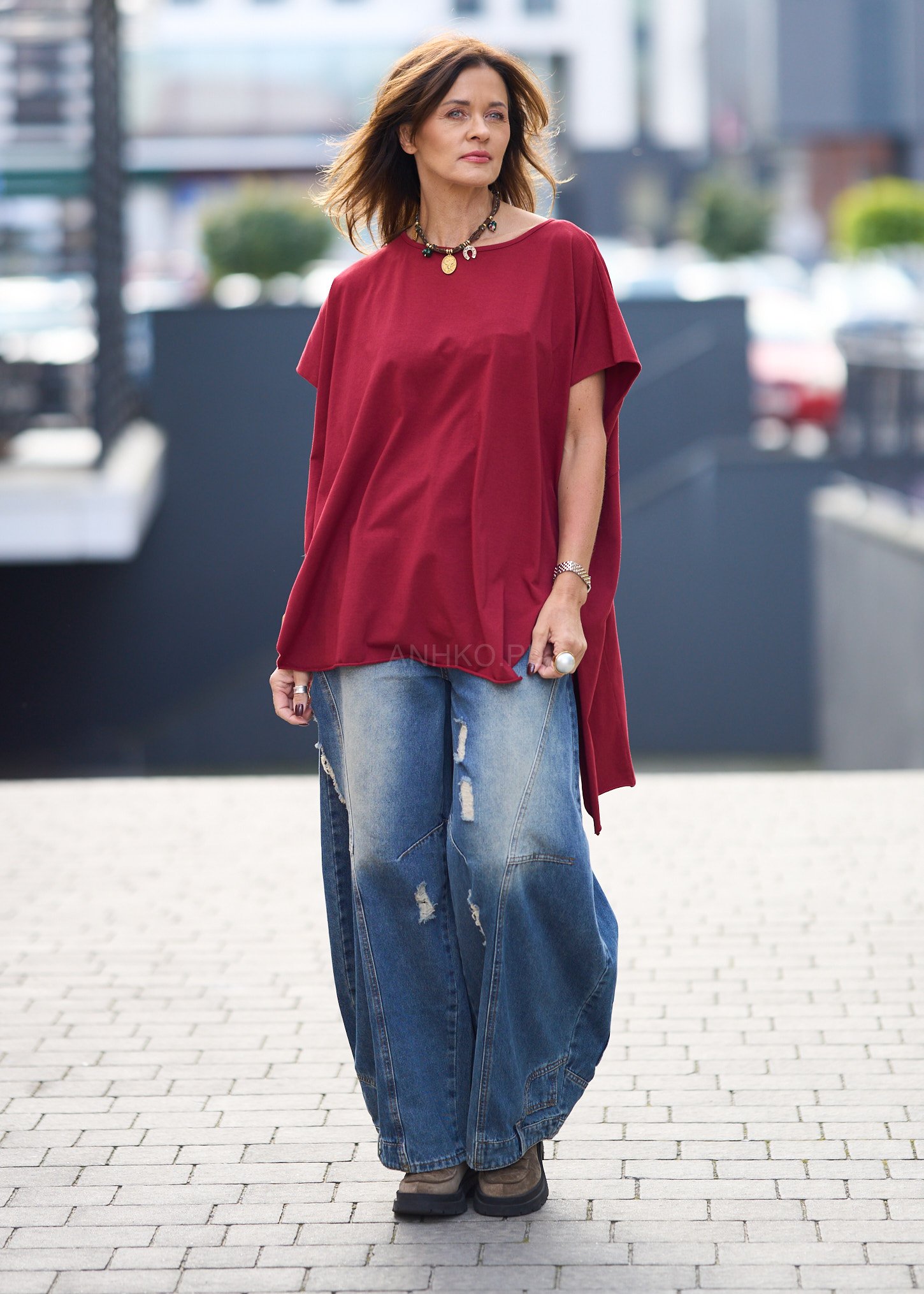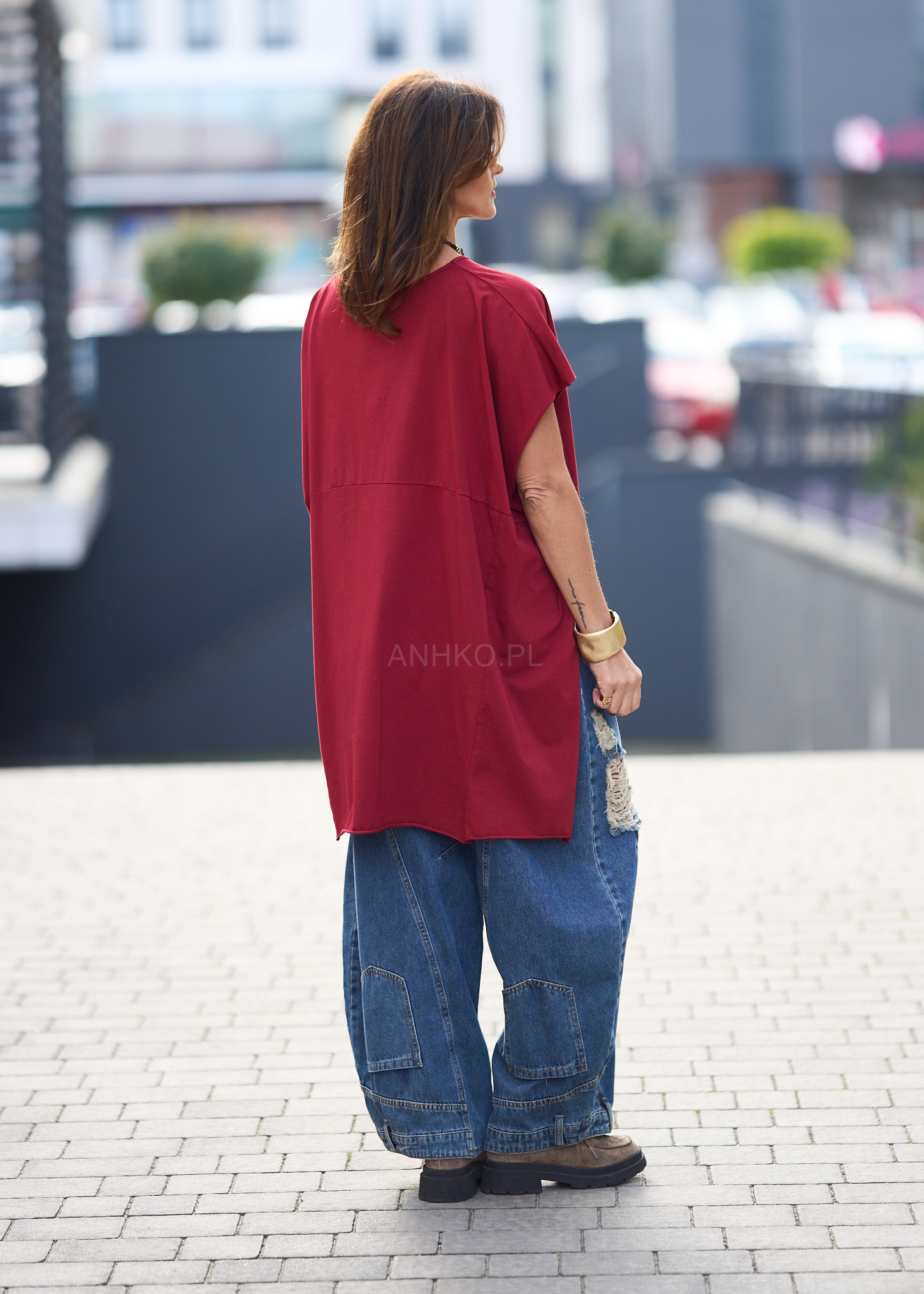 Bordowy odcień dodaje całości charakteru, a klasyczny dekolt subtelnie równoważy awangardową formę. To fason, który świetnie łączy wygodę z modowym wykończeniem i dobrze komponuje się z denimem, dopasowanym dołem albo bardziej eleganckimi elementami garderoby.