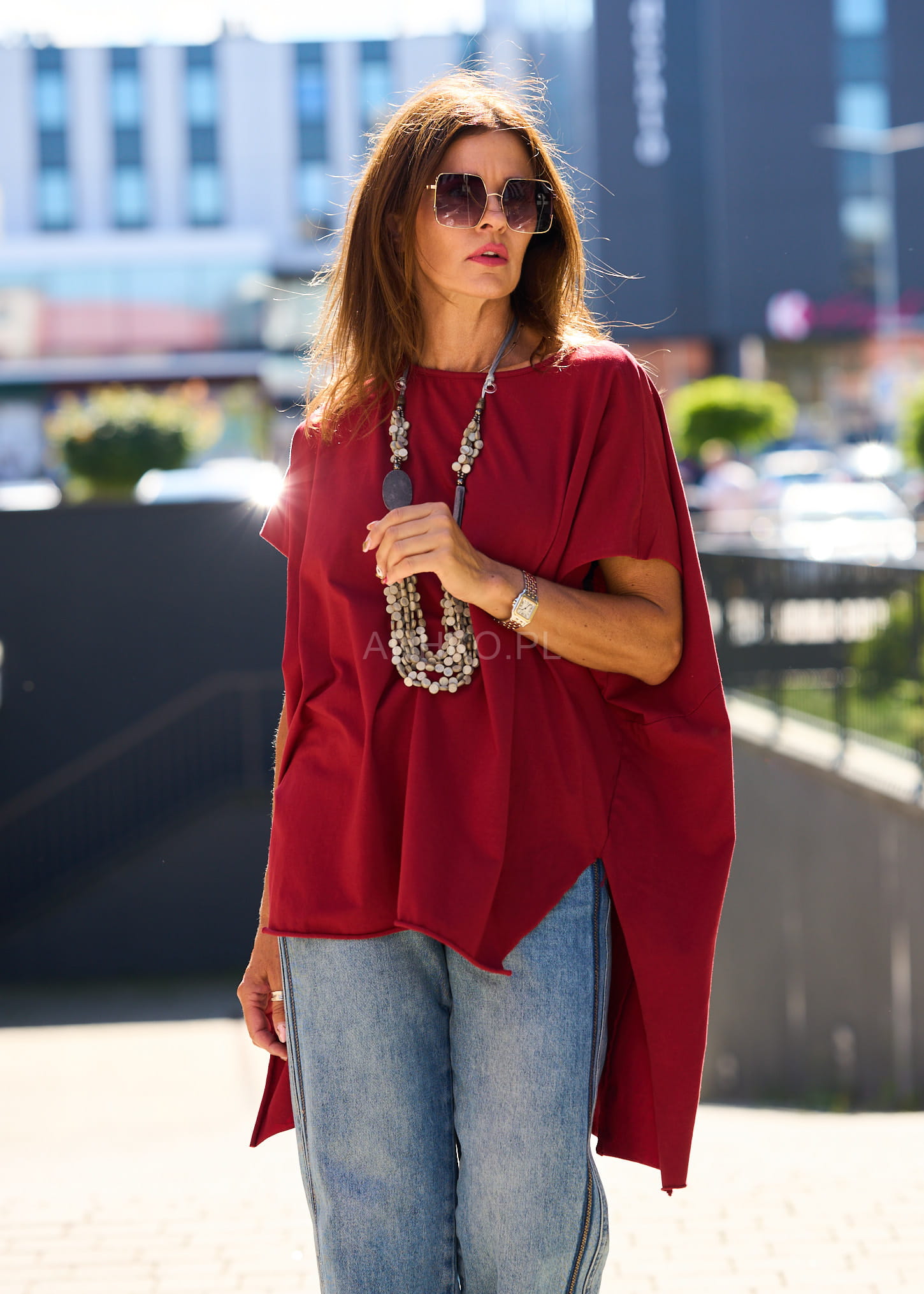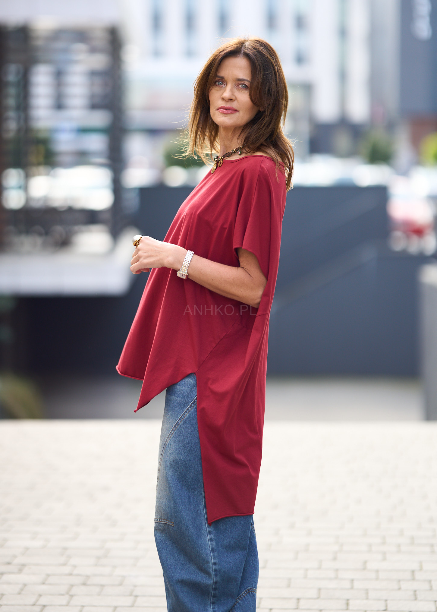 Ta bluzka oversize miękko opada na sylwetce, tworząc nowoczesną, wydłużoną linię i efekt lekkiego ruchu przy każdym kroku. Asymetryczny dół, wydłużony tył i luźny fason sprawiają, że model prezentuje się stylowo zarówno solo, jak i w warstwowym looku.