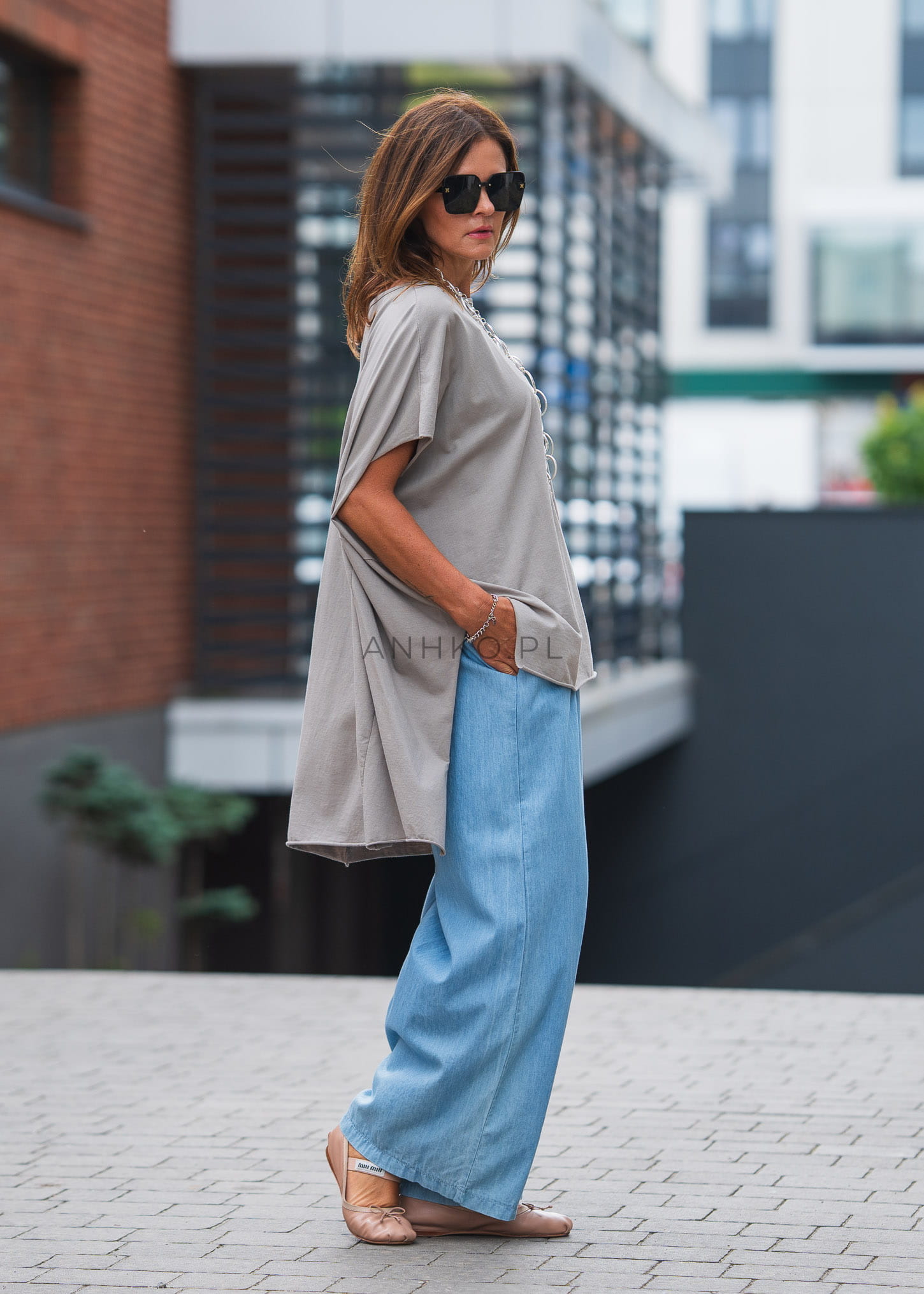 Odcień taupe podkreśla minimalistyczny styl i doskonale wpisuje się w nowoczesne stylizacje. Rozcięcia po bokach oraz klasyczny dekolt zapewniają komfort noszenia i sprawiają, że model świetnie komponuje się zarówno z jeansami, jak i bardziej eleganckimi elementami garderoby.