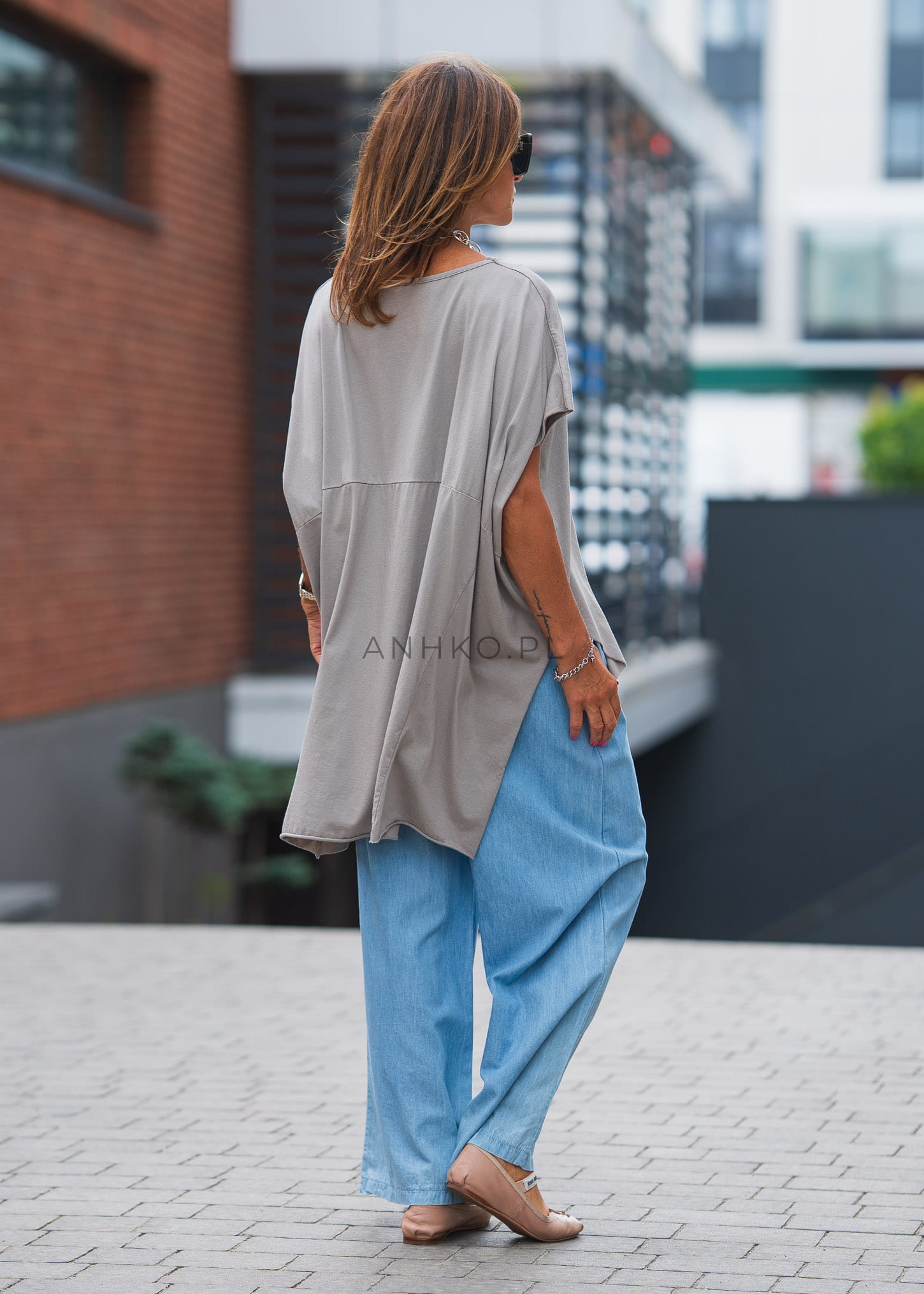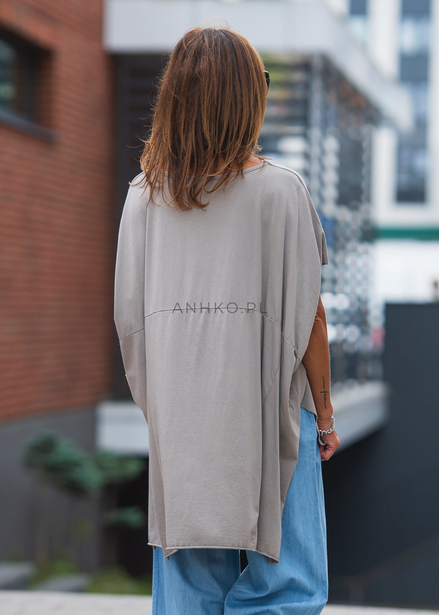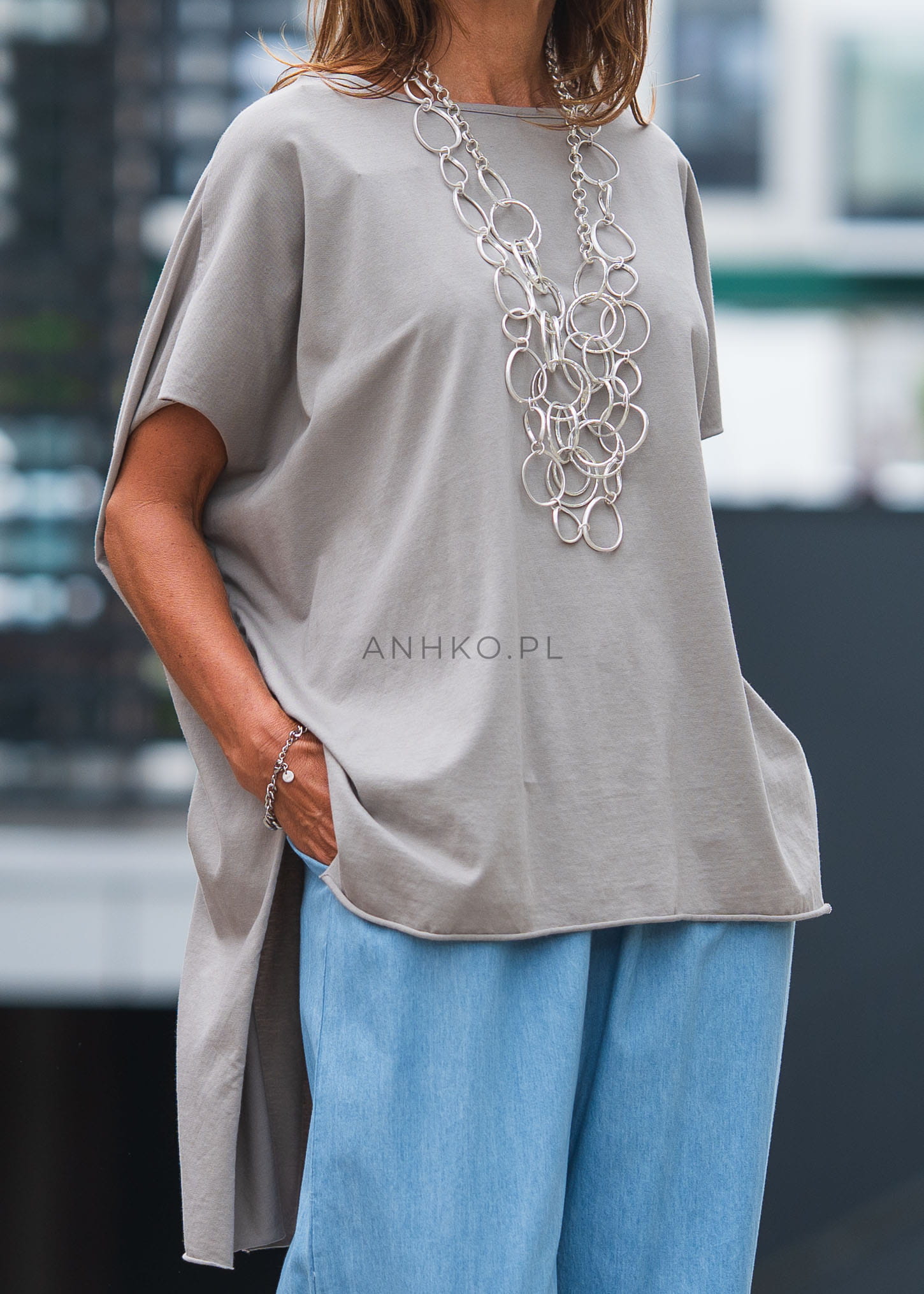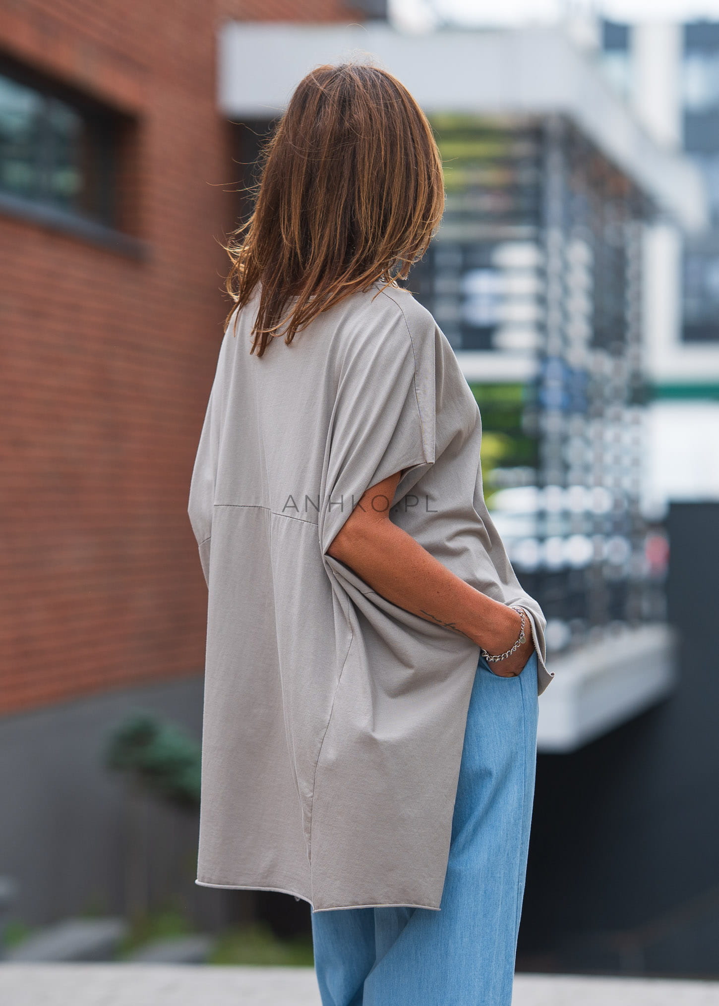 Ta bluzka oversize subtelnie opływa sylwetkę, tworząc miękką, płynną linię. Wydłużony tył i asymetryczny dół nadają jej charakteru, a luźny fason sprawia, że całość wygląda lekko i naturalnie w ruchu.