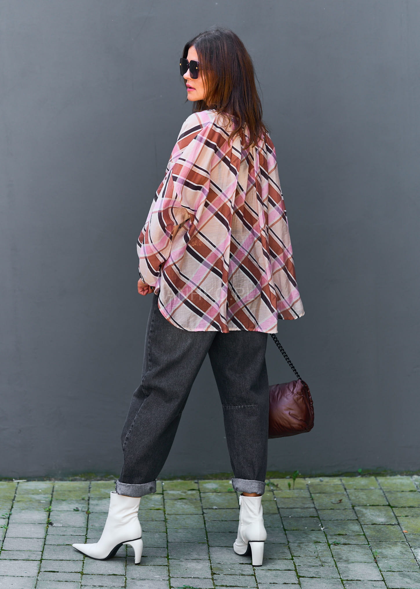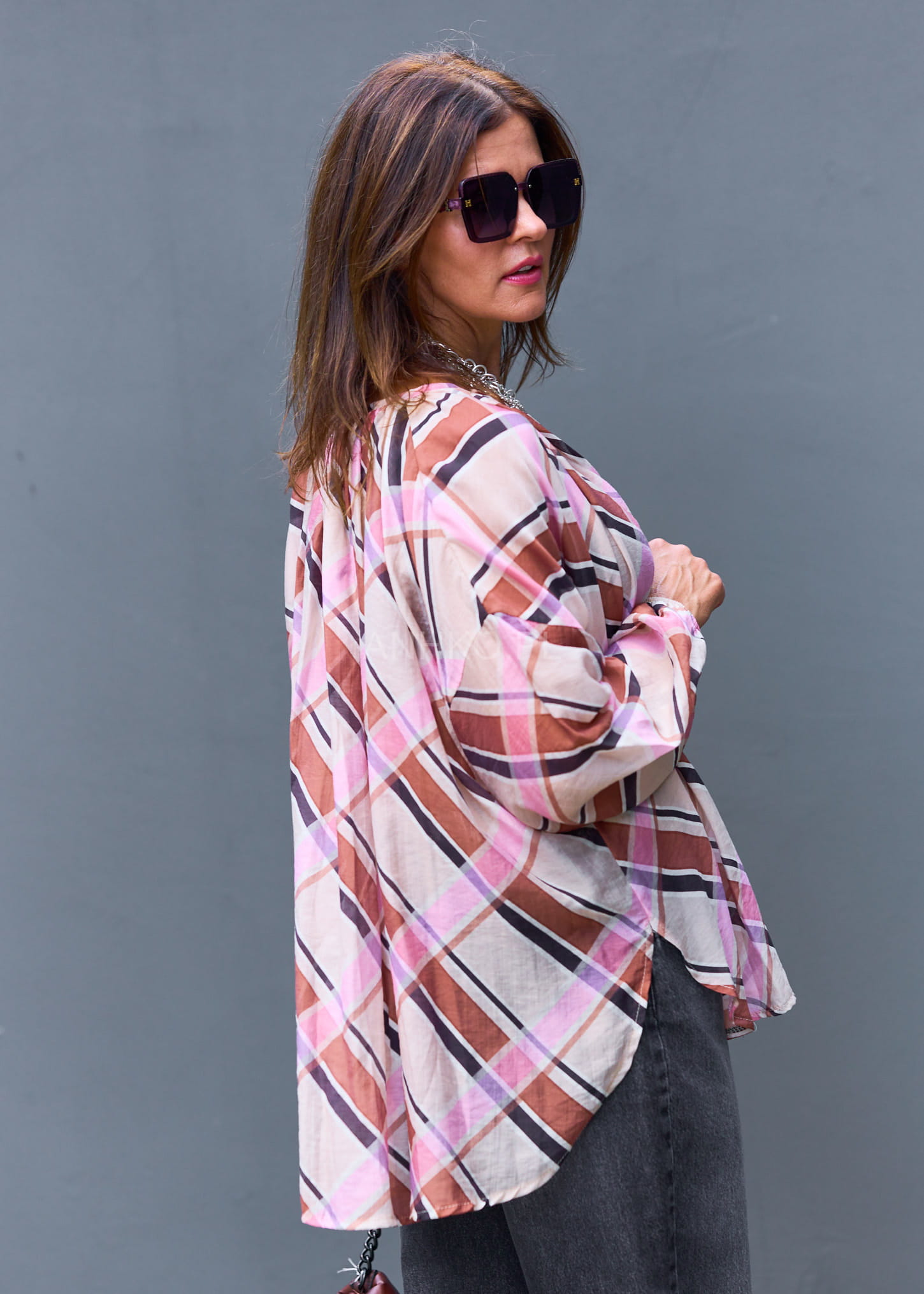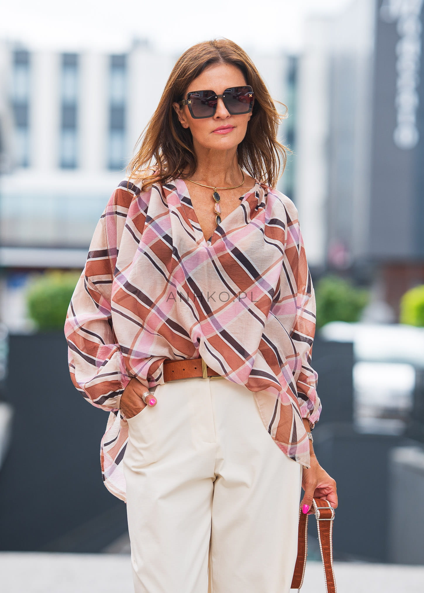 To doskonały wybór dla kobiet ceniących styl i komfort. Wykonana z przewiewnego materiału, łączy w sobie delikatność lyocellu i wytrzymałość poliestru, tworząc lekką, oddychającą tkaninę idealną na cieplejsze dni. Oversize’owy krój z marszczeniami przy dekolcie i rękawach nadaje jej luźny, swobodny charakter. Doskonale komponuje się z jeansami, szortami, lnianymi spodniami czy spódnicami. Bluzka sprawdzi się zarówno do biura w casualowym stylu, na wakacyjny spacer, jak i na spotkanie z przyjaciółmi przy kawie. Jej pastelowy wzór w kratę dodaje świeżości i delikatności każdej stylizacji.