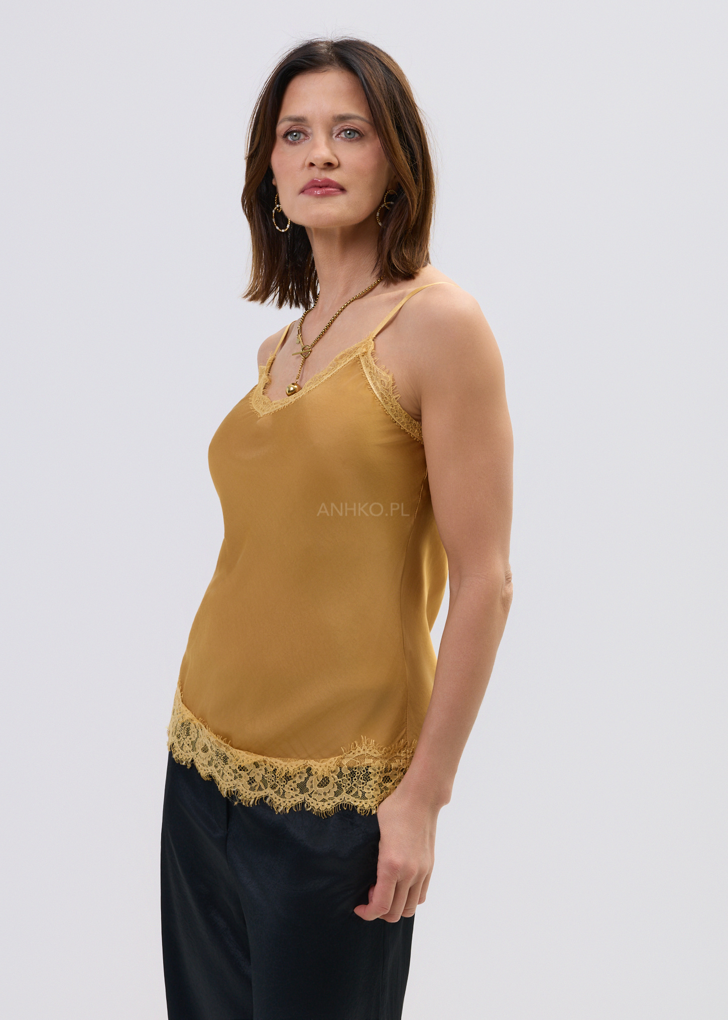 Ta bluzka na ramiączkach o lekkim, lejącym fasonie subtelnie otula sylwetkę, tworząc kobiecą i delikatną linię. Materiał miękko układa się na ciele, a koronkowe wykończenie przy dekolcie i dole dodaje całości eleganckiego, zmysłowego charakteru. Dekolt V optycznie wydłuża szyję i podkreśla górę sylwetki.