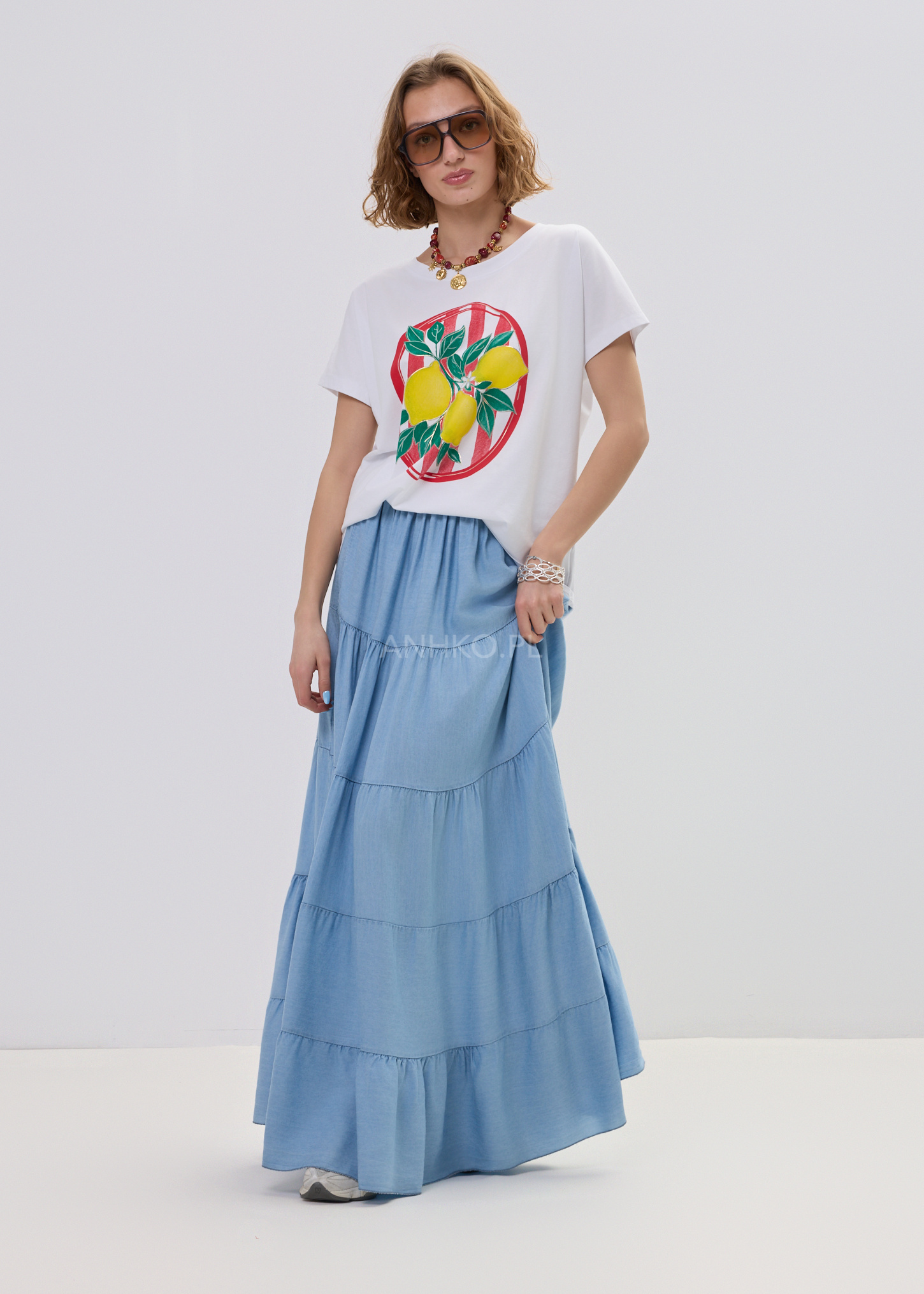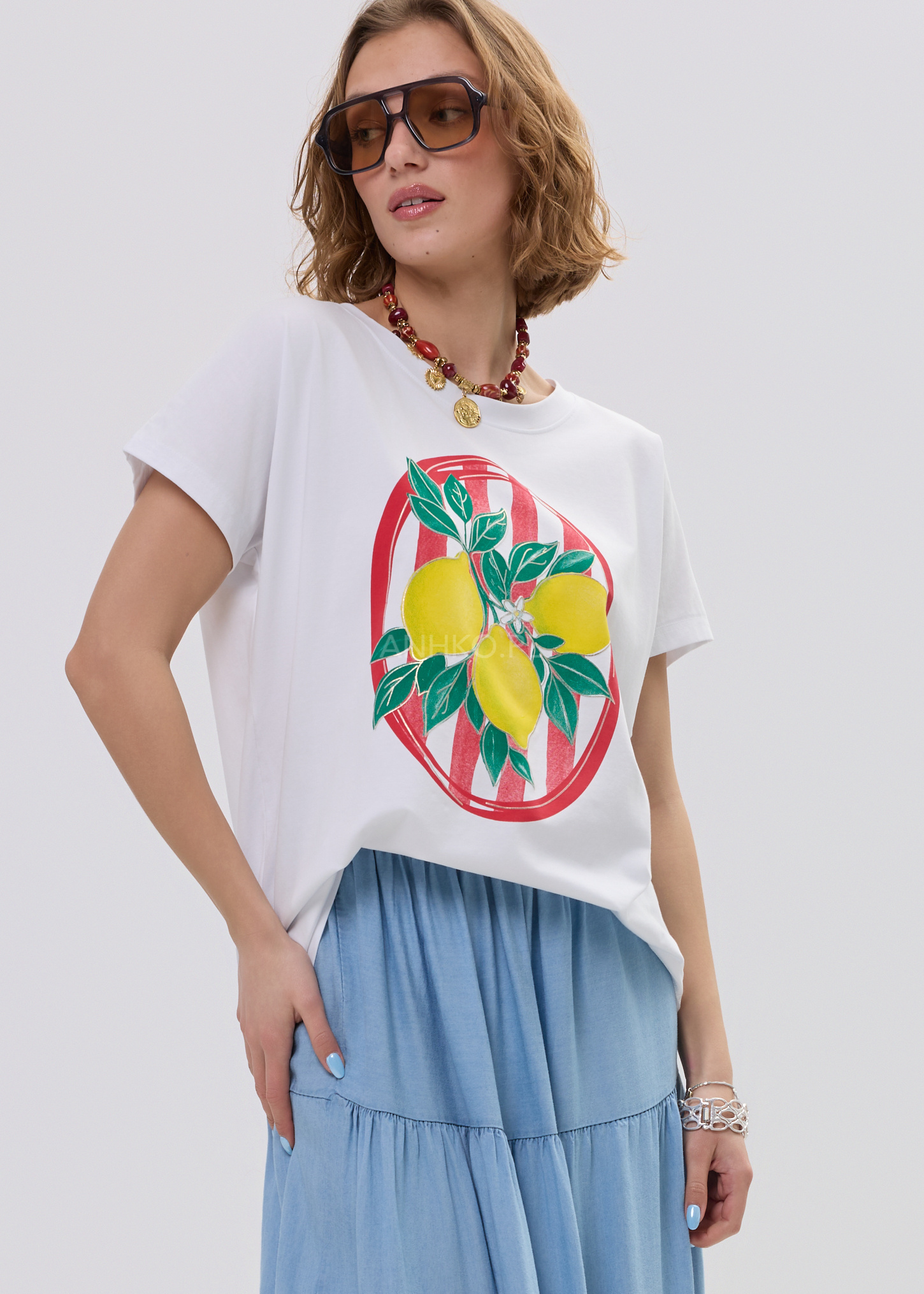 Minimalistyczna baza została przełamana wyrazistym nadrukiem w cytryny, który dodaje całości energii i świeżości. Delikatnie skrócona długość świetnie współgra zarówno z jeansami z wysokim stanem, jak i spódnicami czy spodniami materiałowymi, tworząc stylizacje na co dzień i na bardziej dopracowane wyjścia.