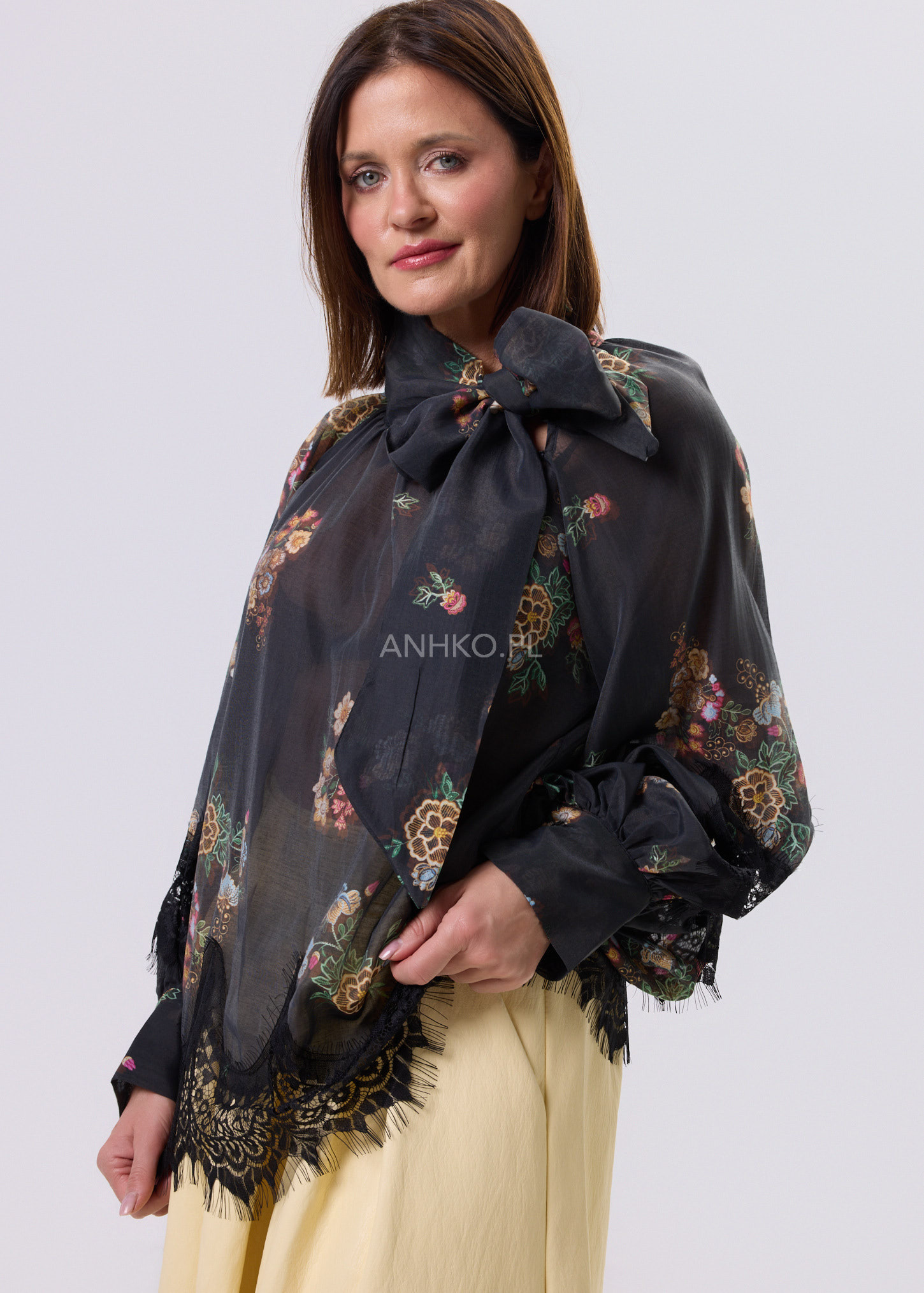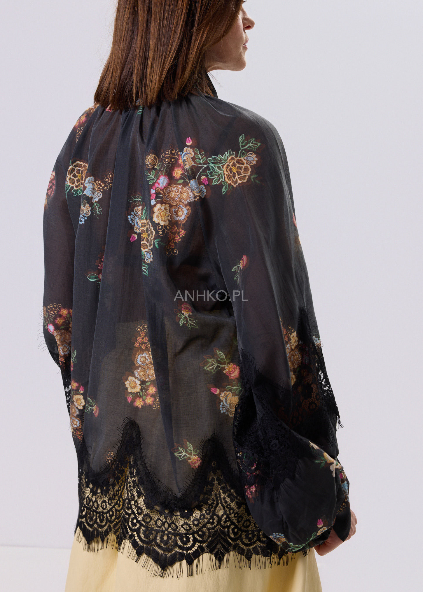 Bluzka damska w czarnym kolorze z subtelnym, kwiatowym nadrukiem utrzymanym w naturalnej palecie kolorów. Model posiada dekolt V-neck oraz luźny, swobodny krój typu relaxed, który zapewnia komfort noszenia i lekko układa się na sylwetce. Dłuższy fason sięgający za biodra sprawia, że bluzka świetnie wygląda zarówno wpuszczona w spodnie, jak i noszona luźno. Dekoracyjne, długie rękawy oraz koronkowe wykończenie przy mankietach i u dołu dodają całości romantycznego, boho charakteru. To uniwersalny model, który sprawdzi się w stylizacjach casualowych i bardziej eleganckich — do jeansów, spódnic lub materiałowych spodni.