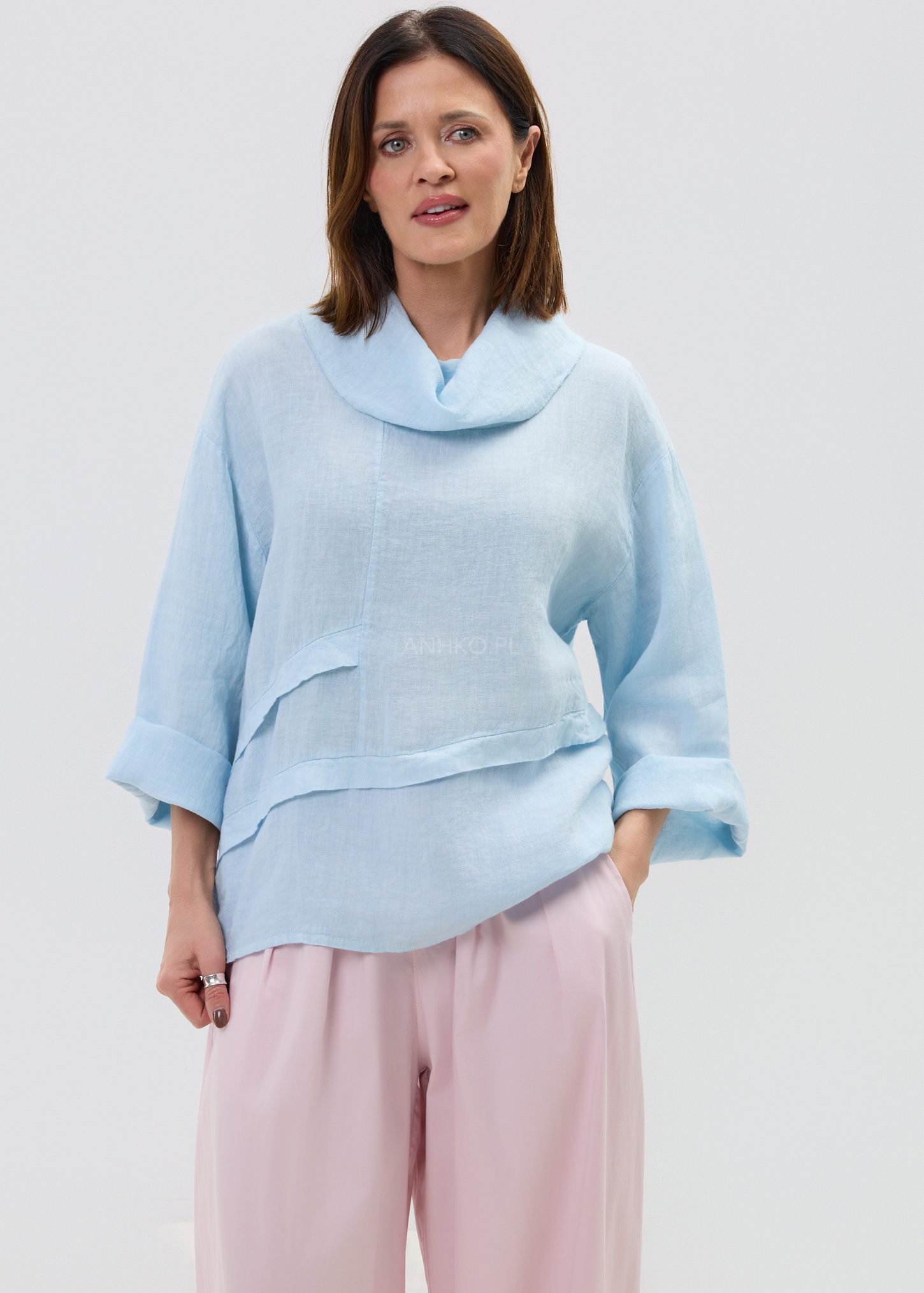 Ta bluzka lniana o luźnym, oversize’owym kroju miękko układa się na sylwetce, tworząc efekt naturalnej lekkości i niewymuszonego stylu. Delikatny, lejący komin subtelnie podkreśla linię szyi, a rozszerzane rękawy 3/4 dodają całości dynamicznego charakteru. Tkanina z lnu pracuje w ruchu, zapewniając komfort i przewiewność przez cały dzień.