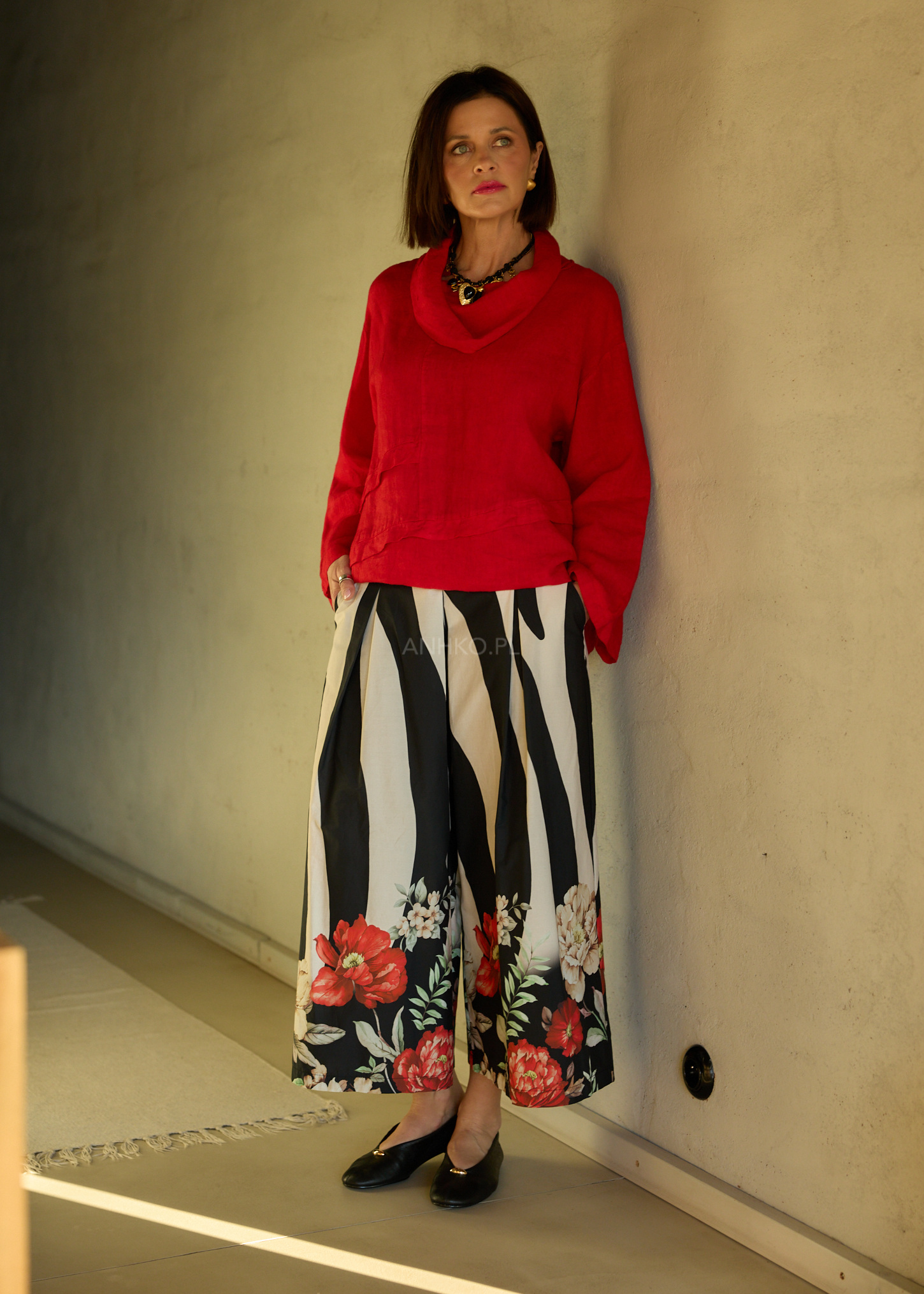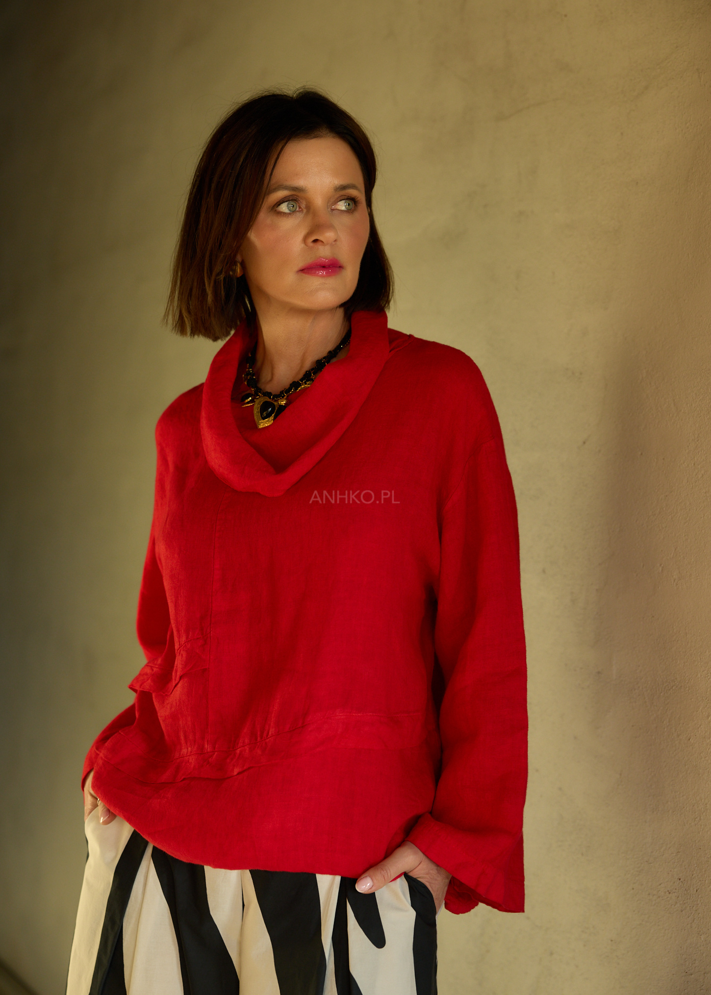 Ta bluzka lniana o luźnym, oversize’owym kroju miękko układa się na sylwetce, tworząc efekt naturalnej lekkości i niewymuszonego stylu. Delikatny, lejący komin subtelnie podkreśla linię szyi, a rozszerzane rękawy 3/4 dodają całości dynamicznego charakteru. Tkanina z lnu pracuje w ruchu, zapewniając komfort i przewiewność przez cały dzień.