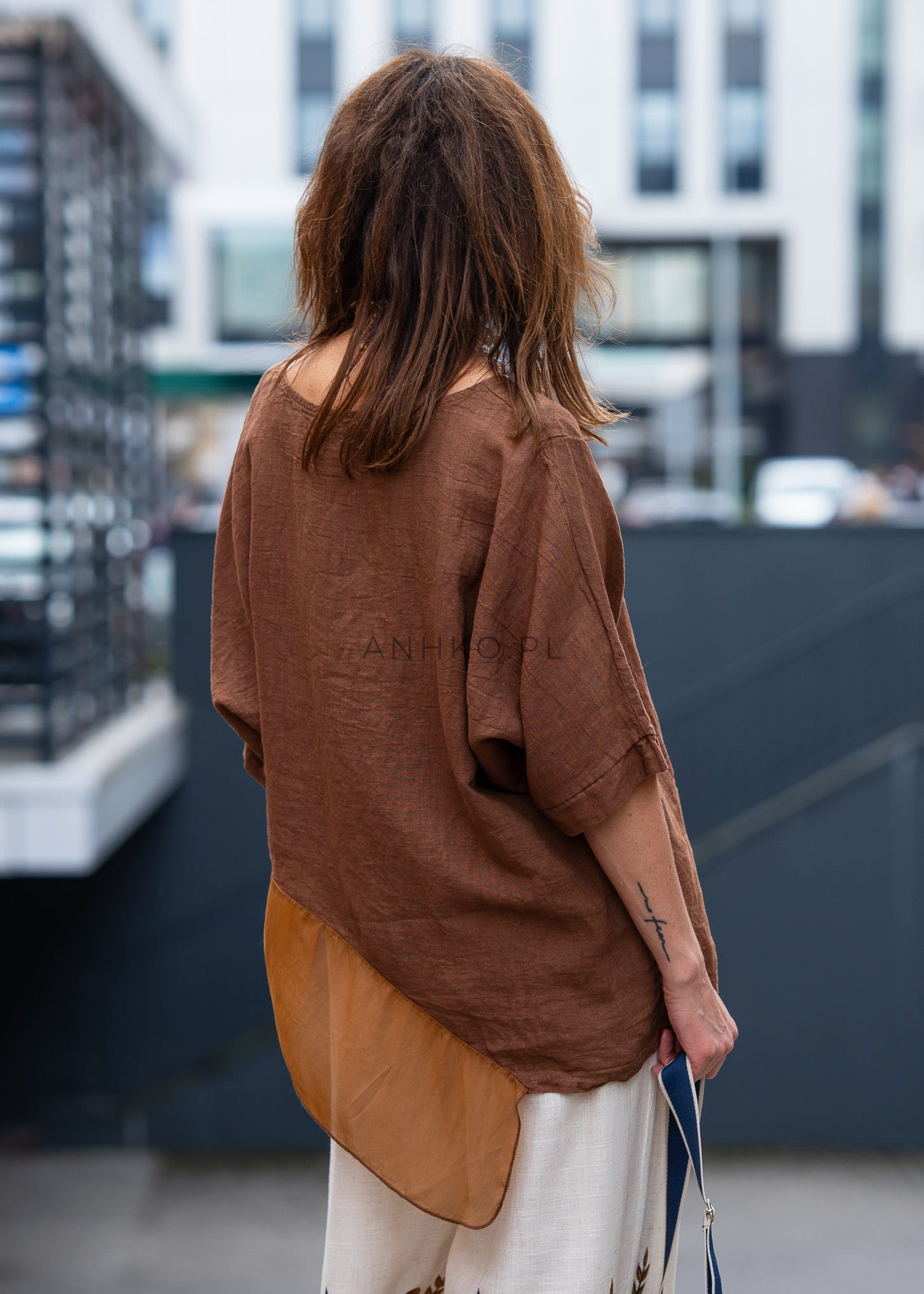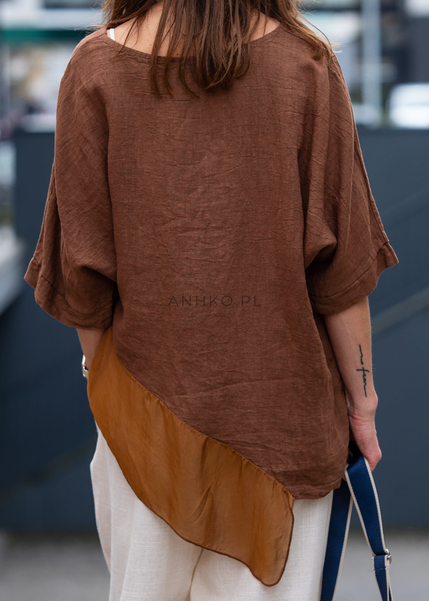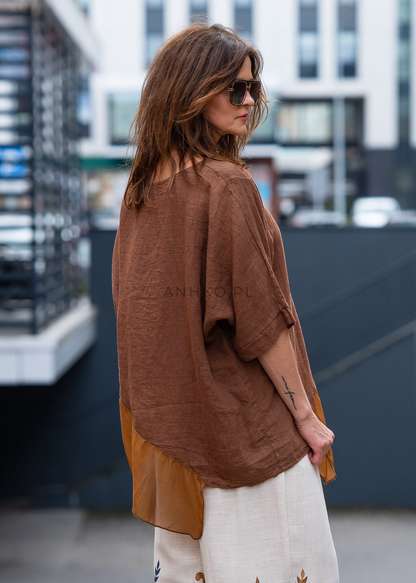 Ta bluzka lniana zachwyca swobodnym fasonem, który miękko opada na sylwetce i tworzy efekt lekkiej, niewymuszonej elegancji. Luźny krój zapewnia pełną swobodę ruchów, a asymetryczny dół z delikatną, półtransparentną wstawką dodaje całości nowoczesnego charakteru. Tkanina subtelnie pracuje w ruchu, podkreślając lekkość stylizacji.