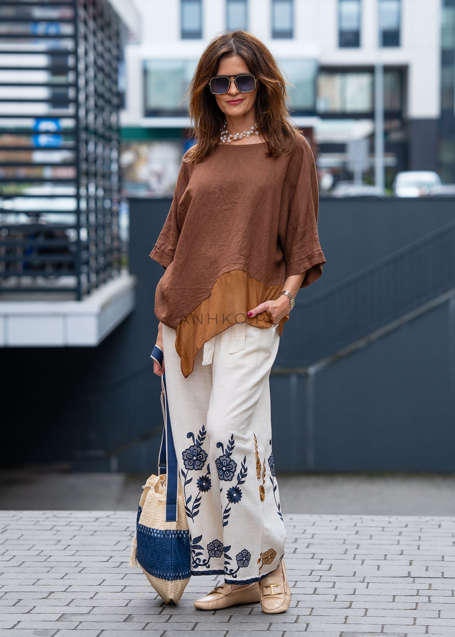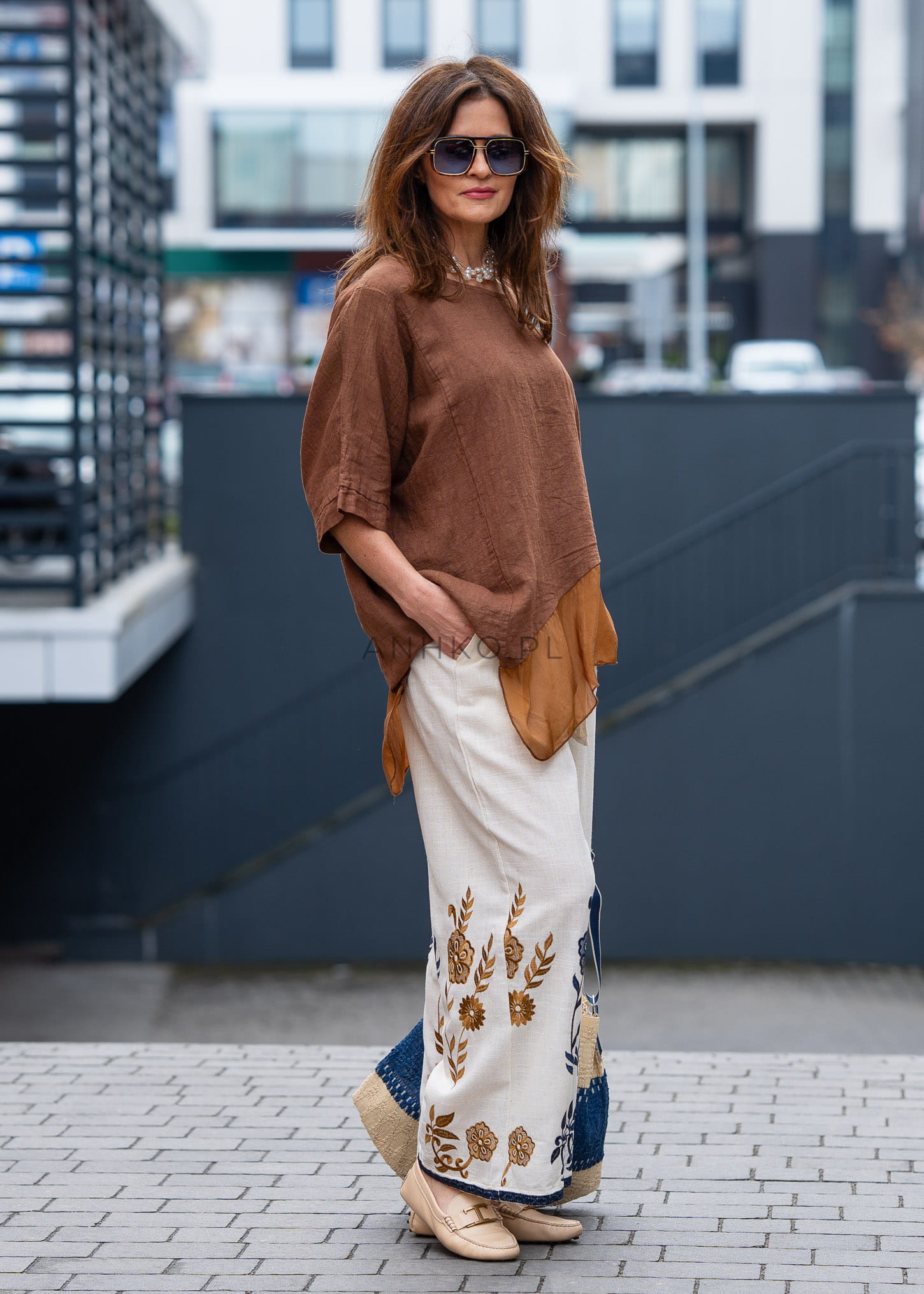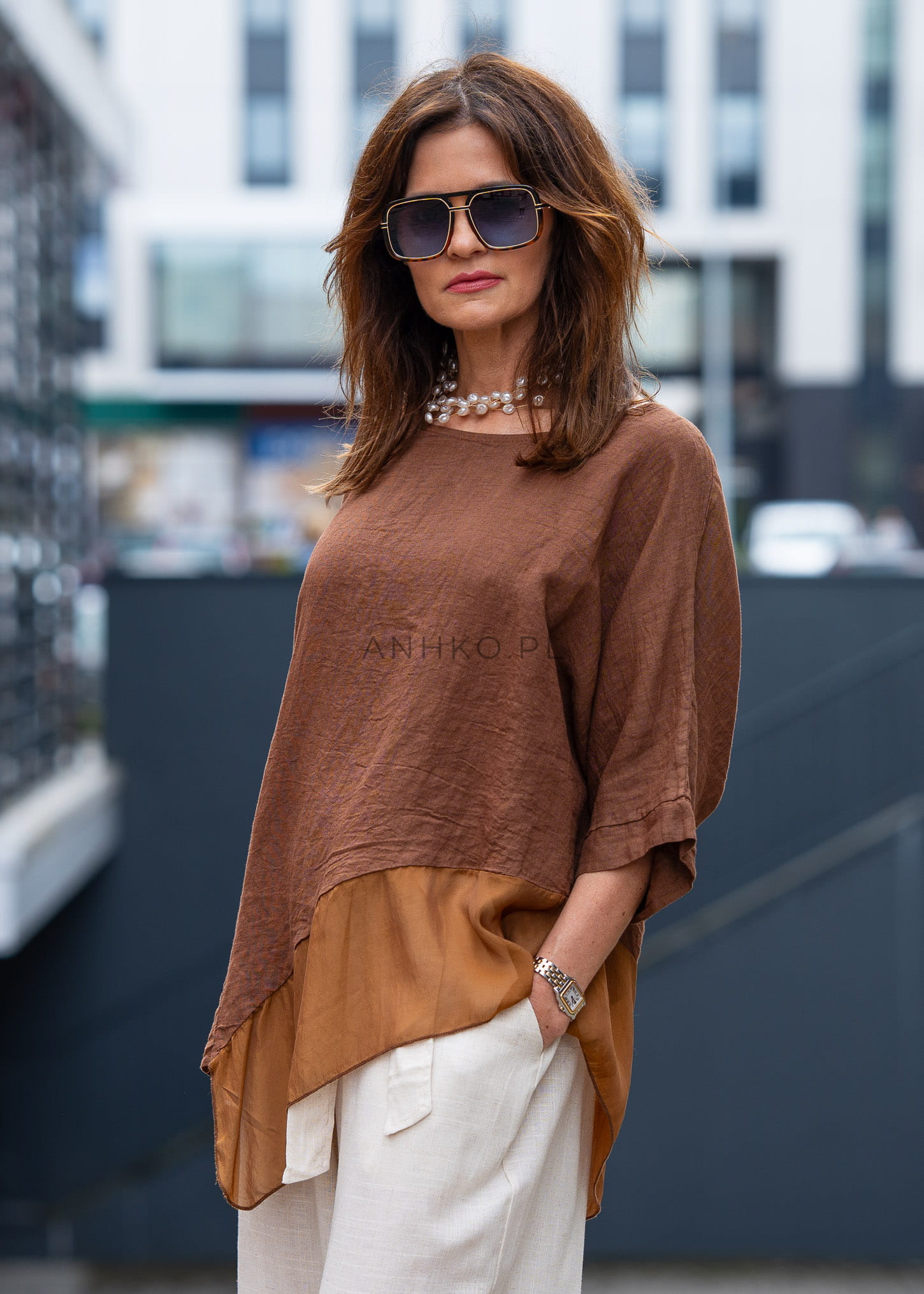 Naturalna struktura materiału w połączeniu z lnem i jedwabiem sprawia, że model jest przyjemny dla skóry i wygląda niezwykle szlachetnie. Ciepły, brązowy odcień doskonale wpisuje się w ponadczasowe stylizacje – świetnie komponuje się zarówno z jasnymi spodniami, jak i wzorzystymi dołami.