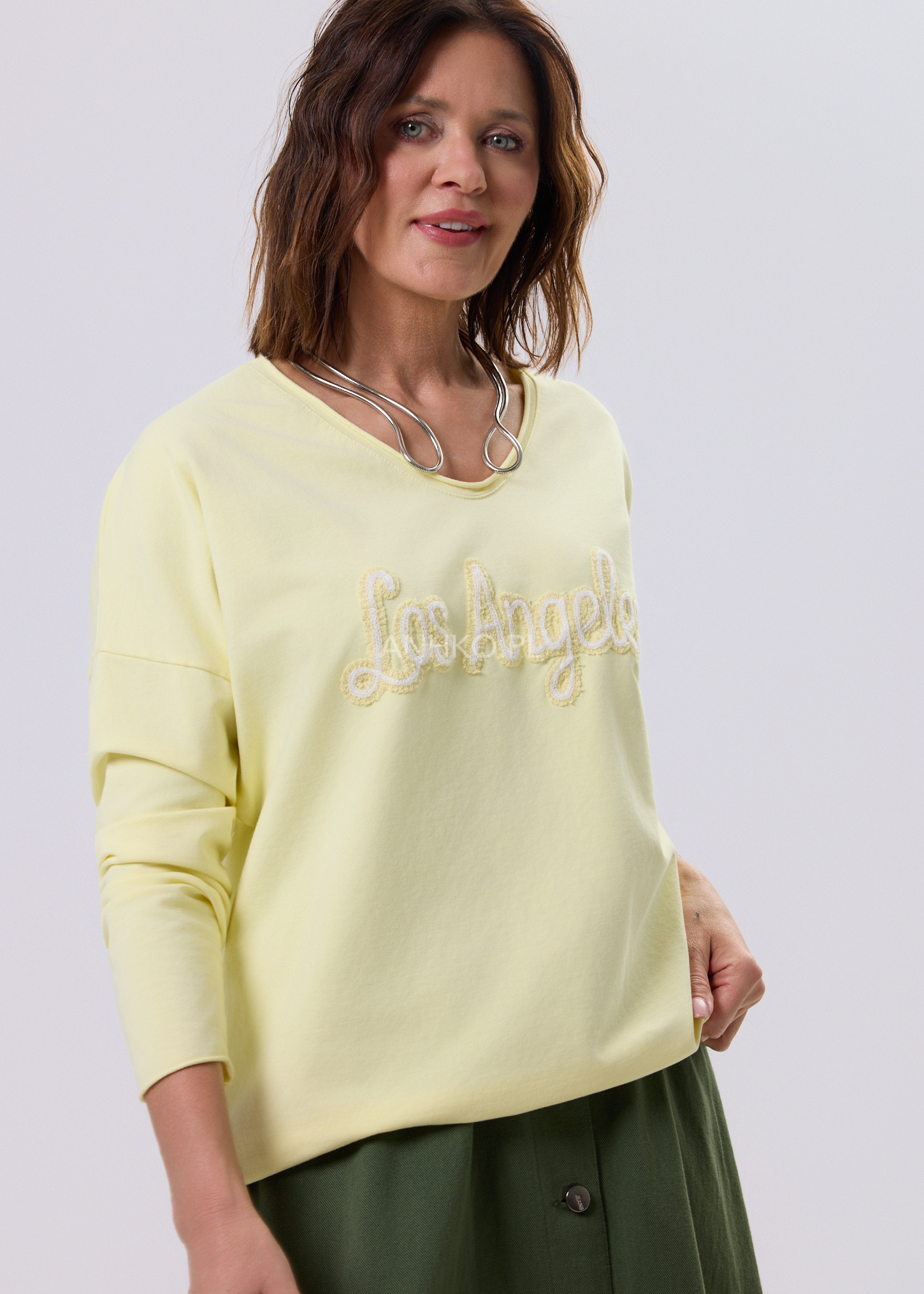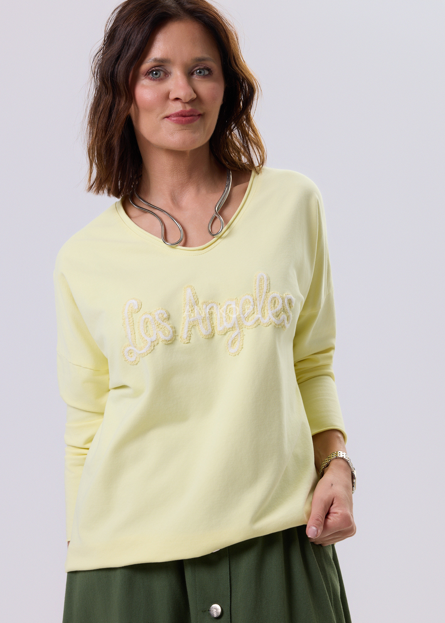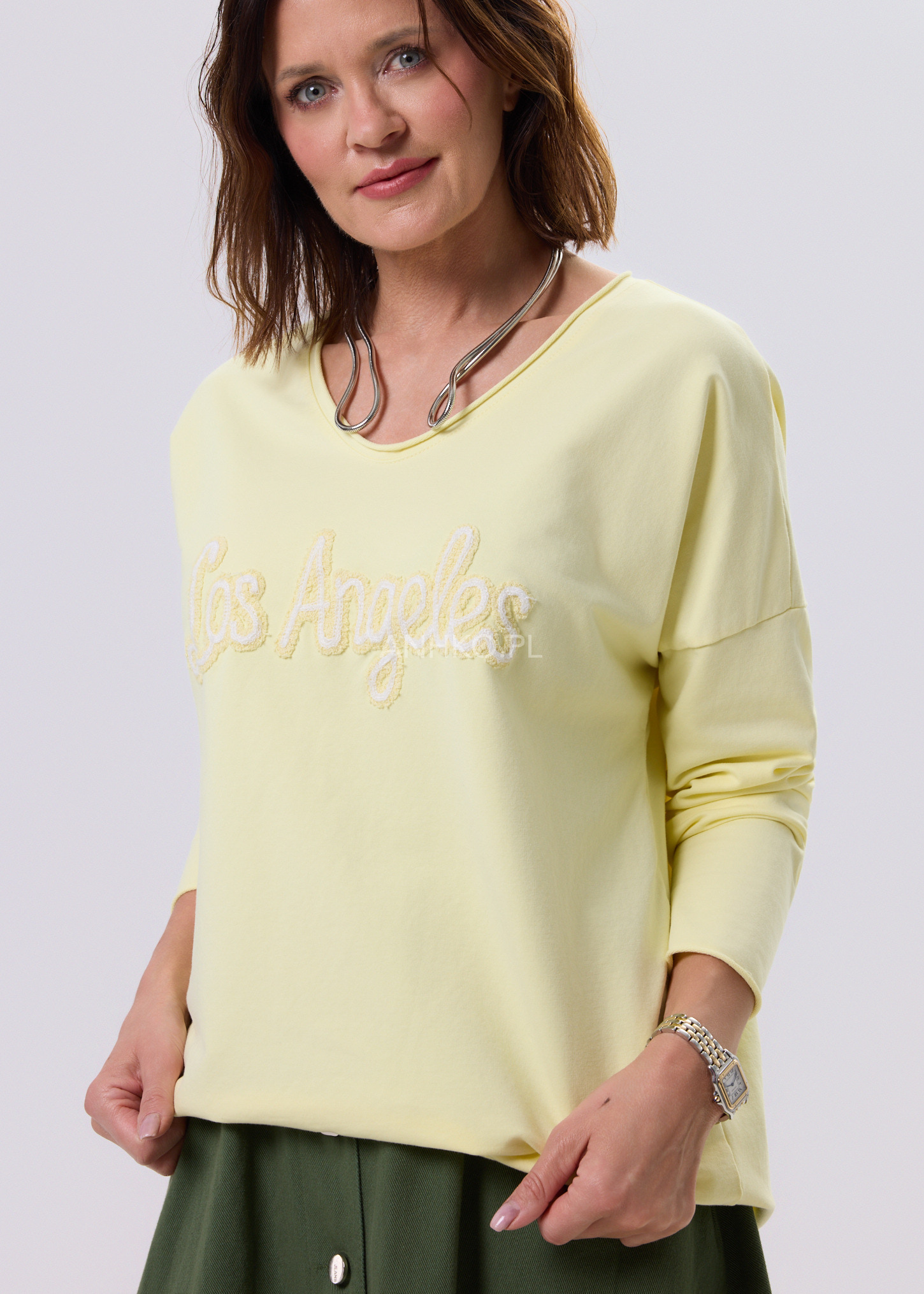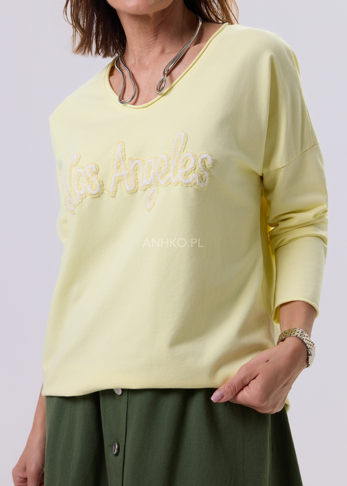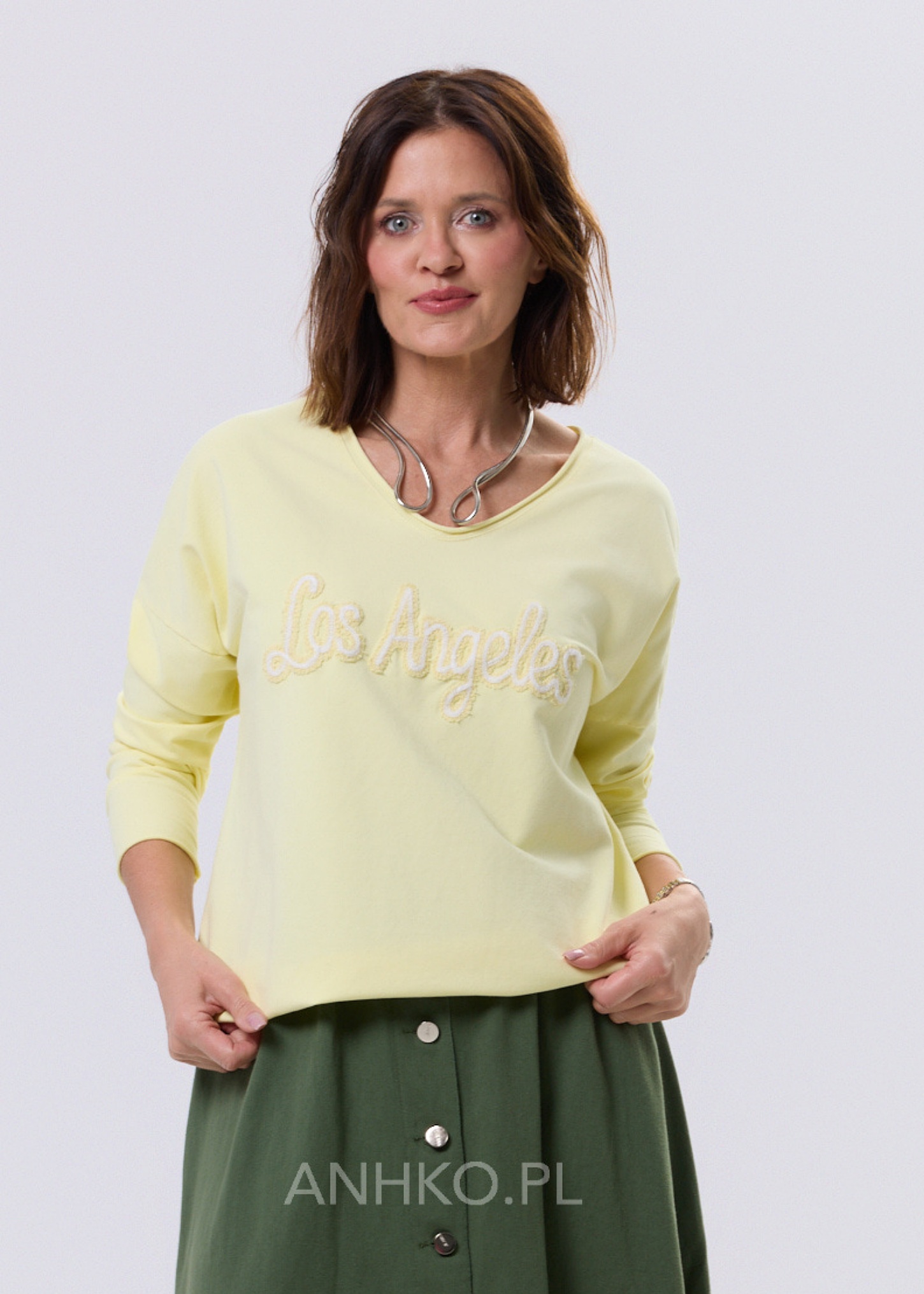 Bluzka o nowoczesnym, luźnym fasonie, zaprojektowana z myślą o codziennym komforcie i uniwersalnym stylu. Delikatnie opadająca linia ramion oraz długie rękawy nadają jej swobodny, miejski charakter. Na przodzie znajduje się dekoracyjny haft, który stanowi subtelny akcent i przyciąga uwagę bez efektu przesady. Doskonale sprawdzi się w stylizacjach casualowych – z jeansami, spodniami materiałowymi lub spódnicą. Idealna na co dzień, do pracy w trybie smart casual, na spotkania, zakupy czy wyjazdy.