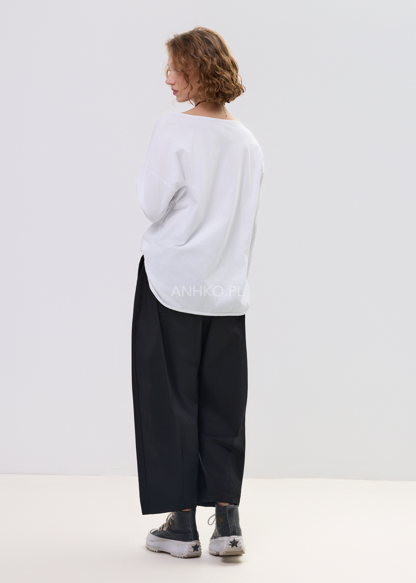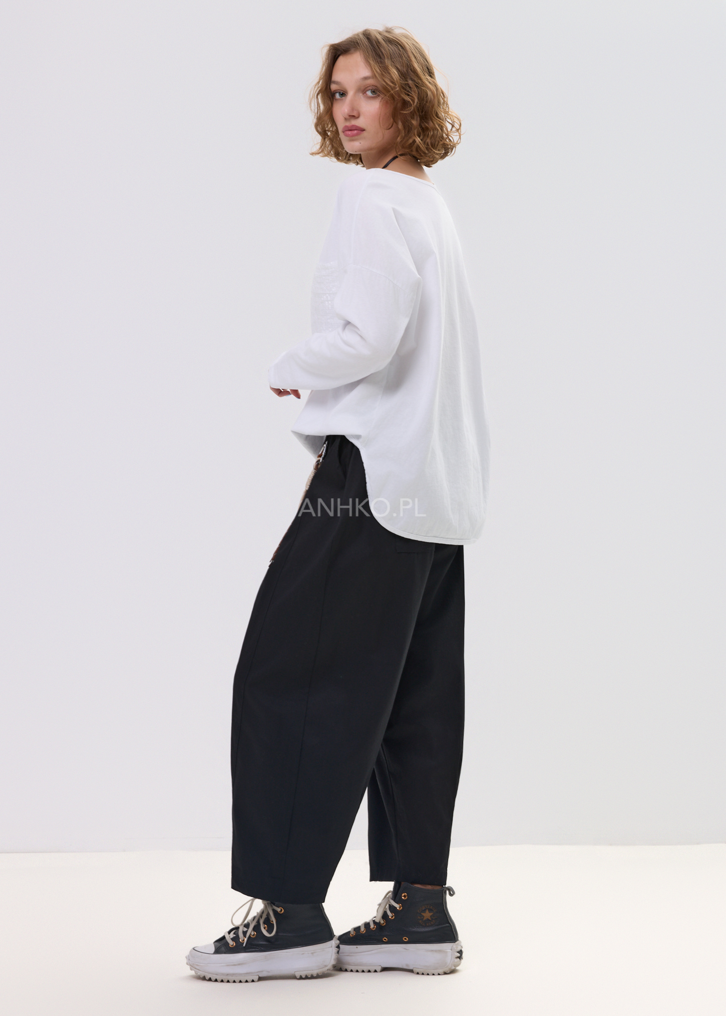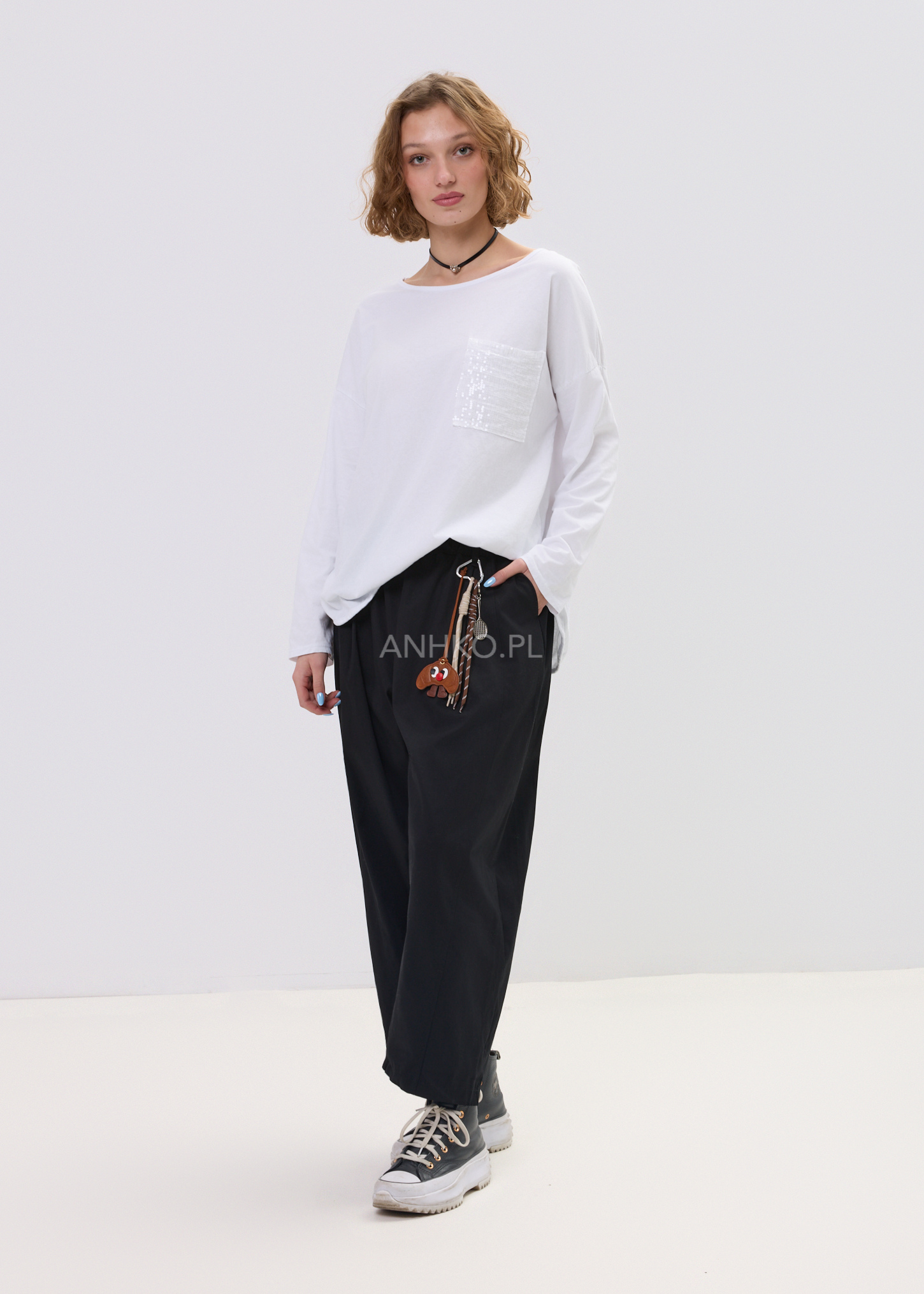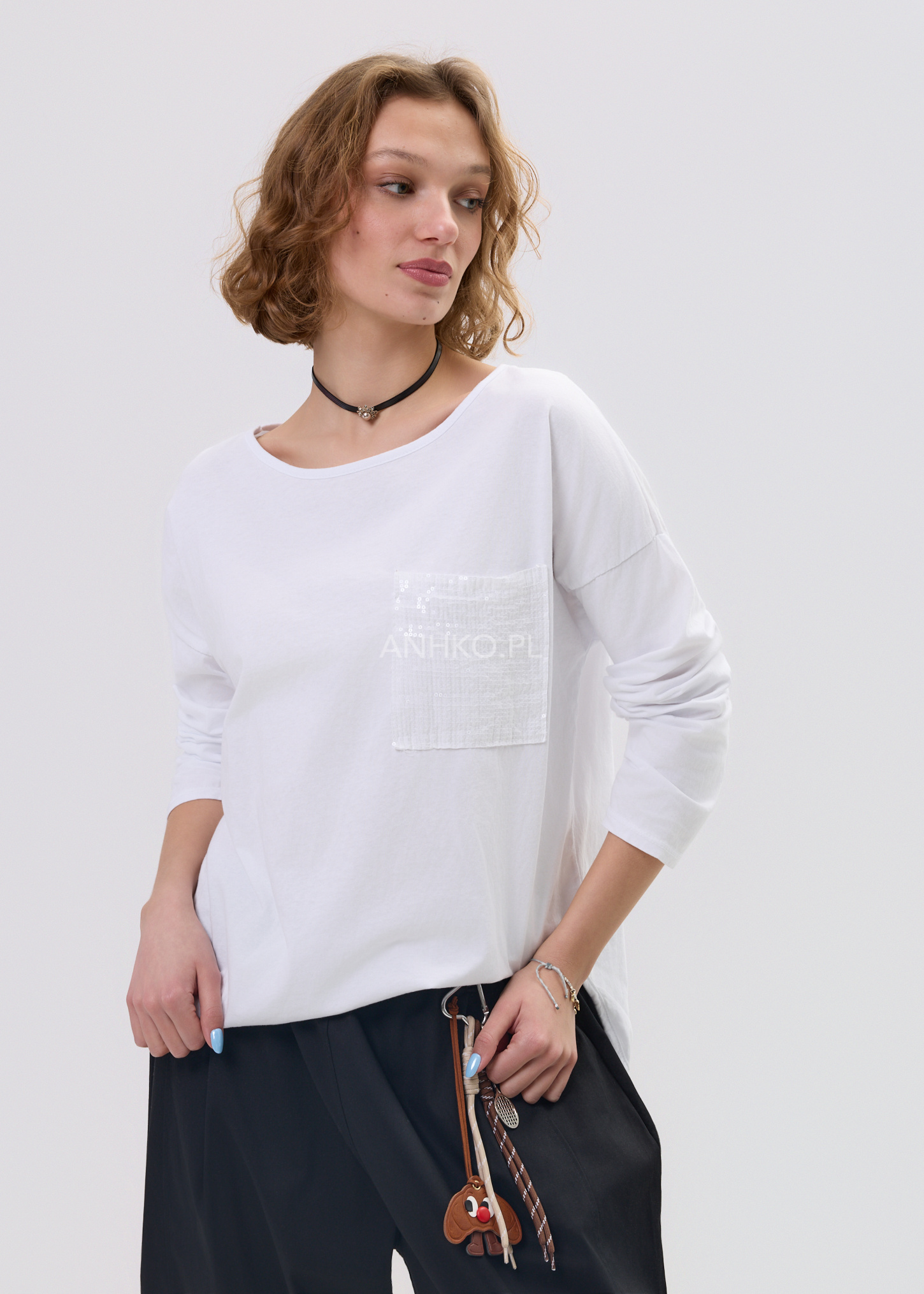 Największą ozdobą modelu jest dekoracyjna kieszonka z cekinów, która delikatnie odbija światło i nadaje całości charakteru. Luźny krój, klasyczny okrągły dekolt oraz dłuższy, lekko zaokrąglony dół sprawiają, że bluzka dobrze prezentuje się zarówno z jeansami, legginsami, jak i spodniami materiałowymi, tworząc wygodny, miejski look.