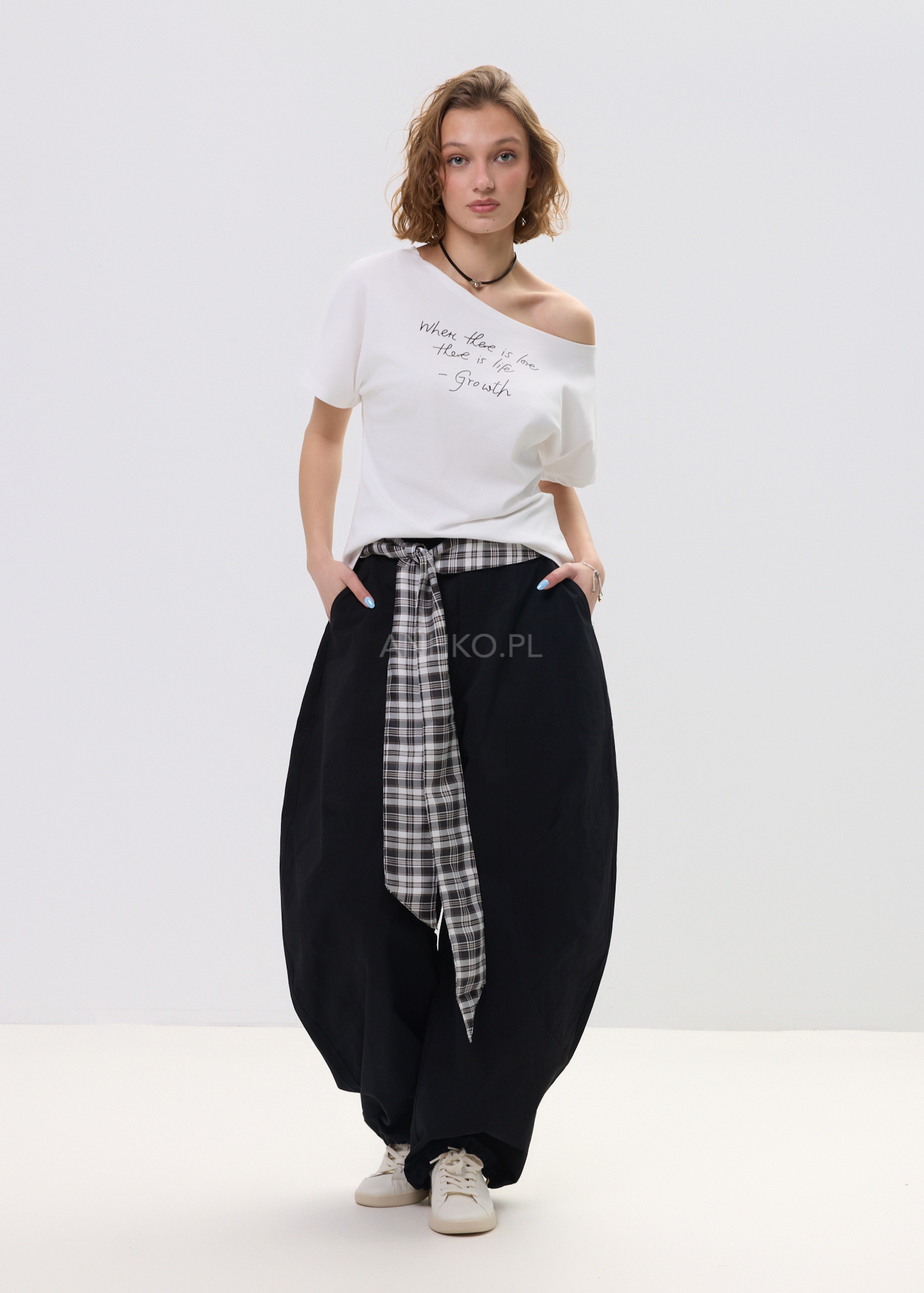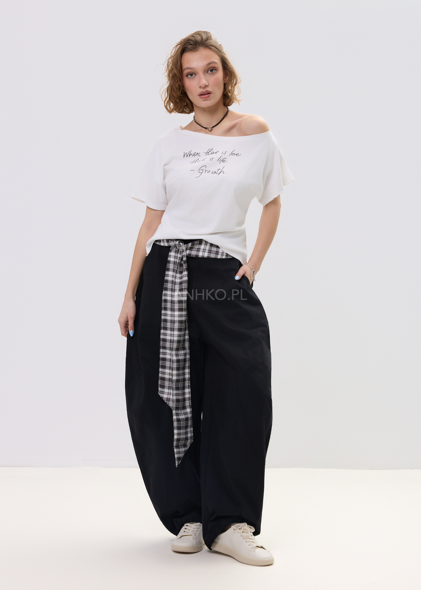 Spodnie Tie Mood Czarne - Czarne spodnie z charakterem – luźny krój, wysoki stan i wiązanie w kratę robią cały look. Wygodne, stylowe i totalnie w klimacie effortless.