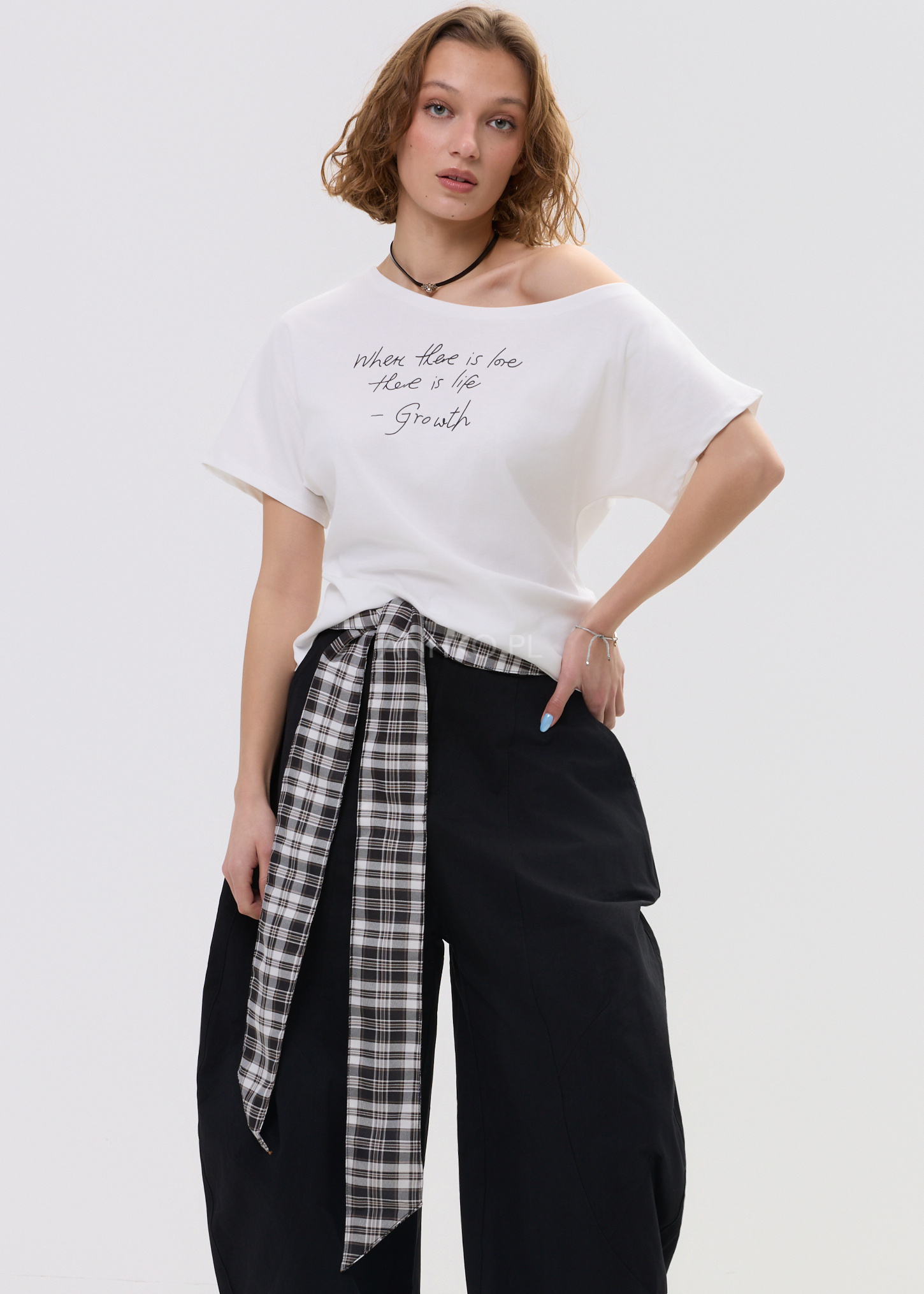 - Nadruk: Kontrastowy, czarny cytat nadający bluzce charakteru.