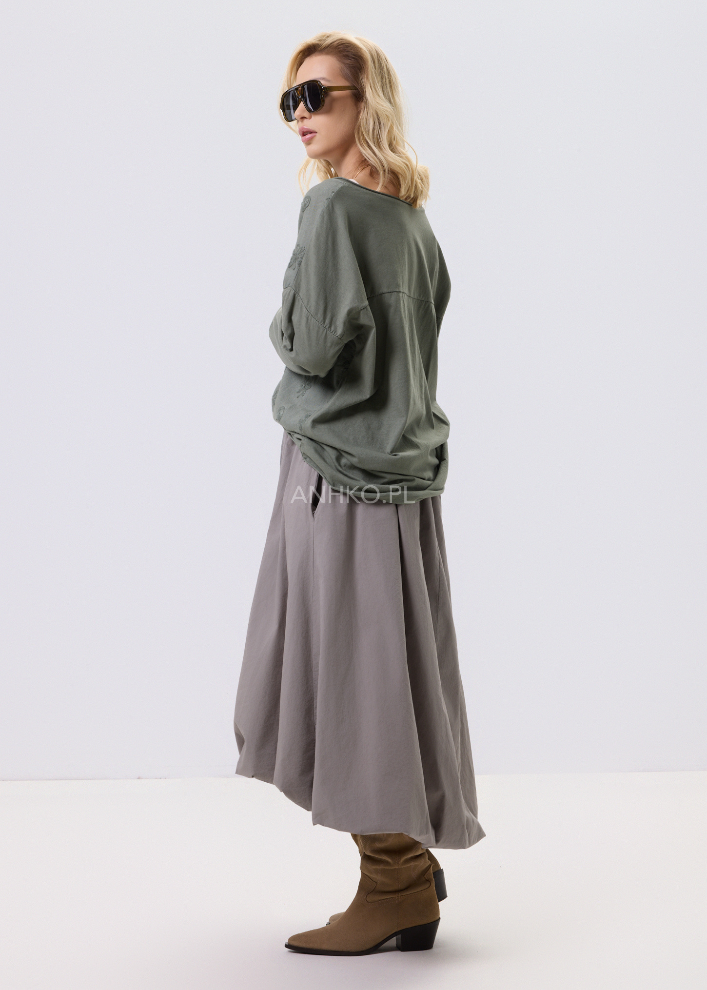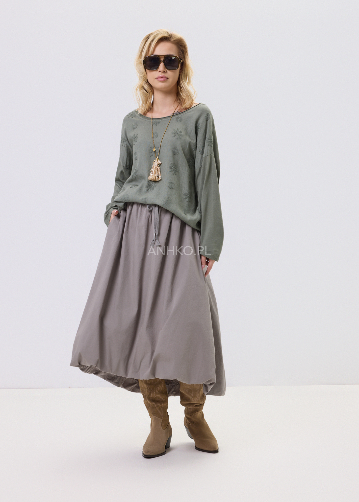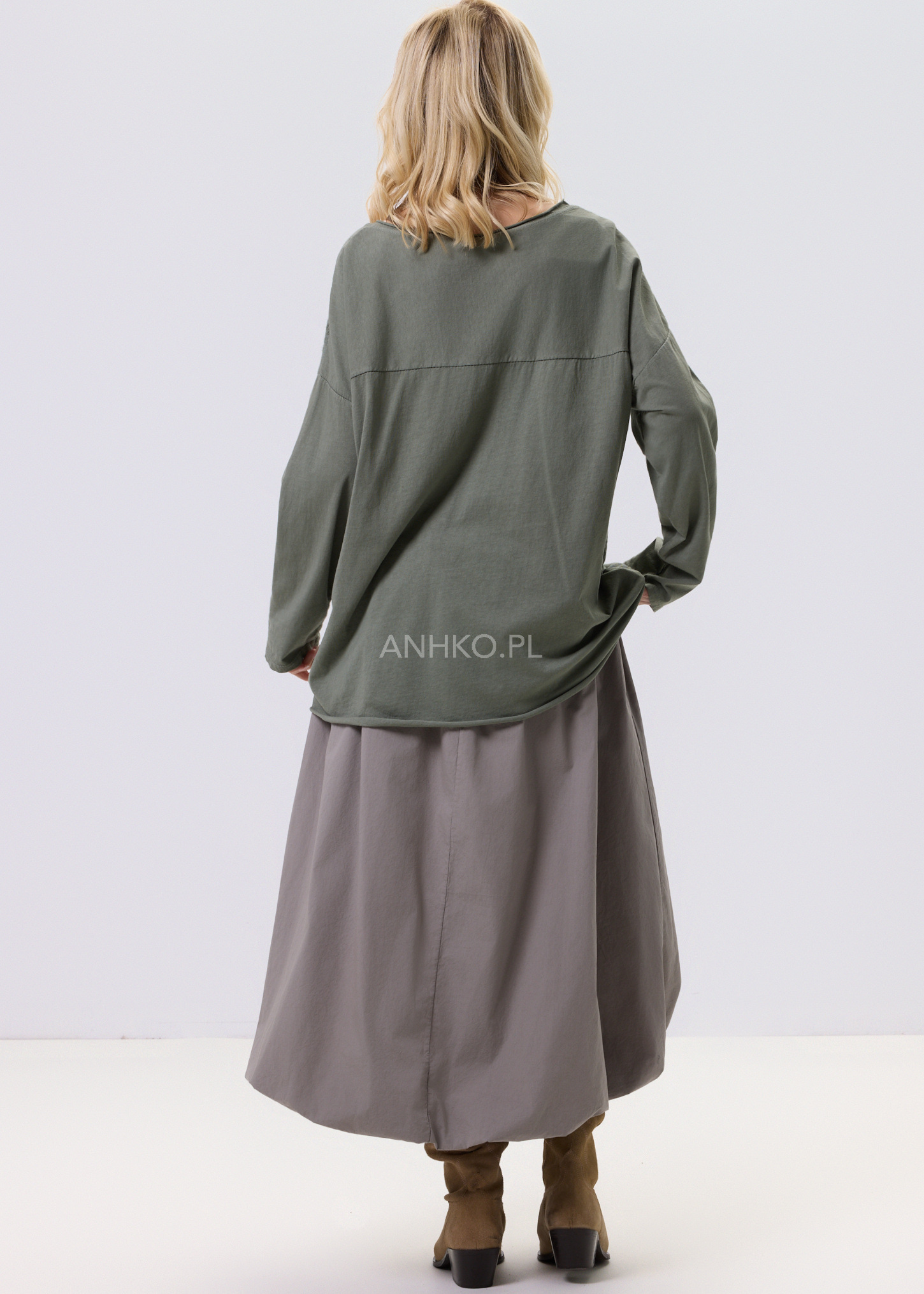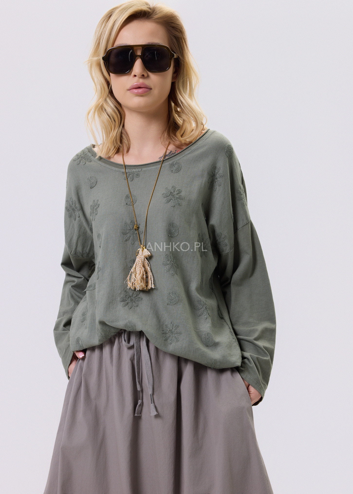 Ta bluzka to połączenie swobodnego kroju z dopracowanymi detalami, które nadają jej wyjątkowego charakteru. Delikatna, lekko strukturalna tkanina z subtelnym, wytłaczanym wzorem sprawia, że model prezentuje się interesująco, a jednocześnie pozostaje uniwersalny. Okrągły dekolt oraz długie rękawy zapewniają wygodę noszenia przez cały dzień. Bluzka świetnie sprawdzi się w zestawieniu z jeansami, spodniami materiałowymi lub spódnicą. To doskonały wybór na co dzień, do pracy, na spotkania czy spokojne wyjścia, kiedy liczy się komfort połączony z estetyką.