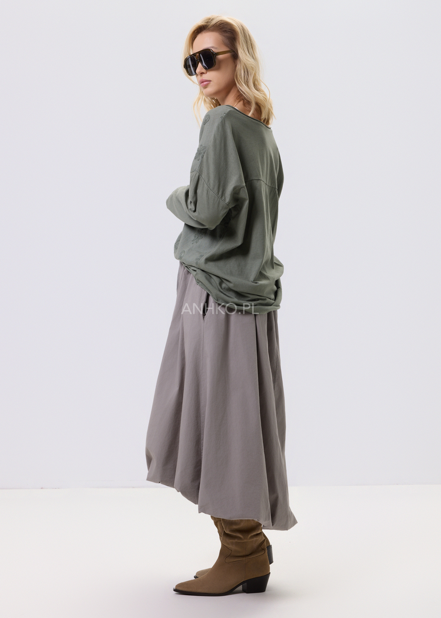 Spódnica Terra Taupe - Stylowa spódnica midi o miękko układającym się, lekko bombkowym fasonie. Naturalna kolorystyka i elastyczna talia zapewniają komfort noszenia oraz ponadczasowy, miejski charakter.