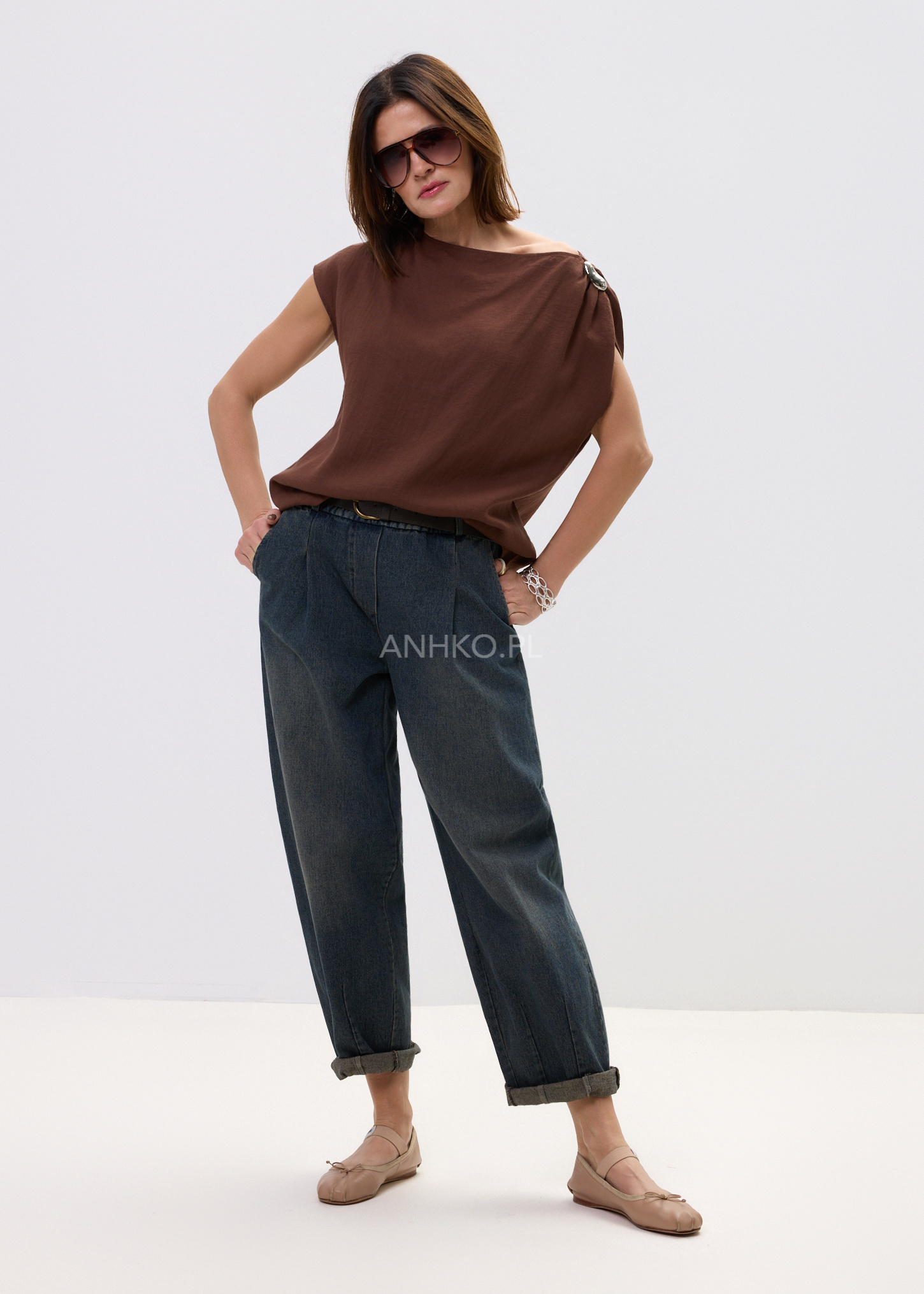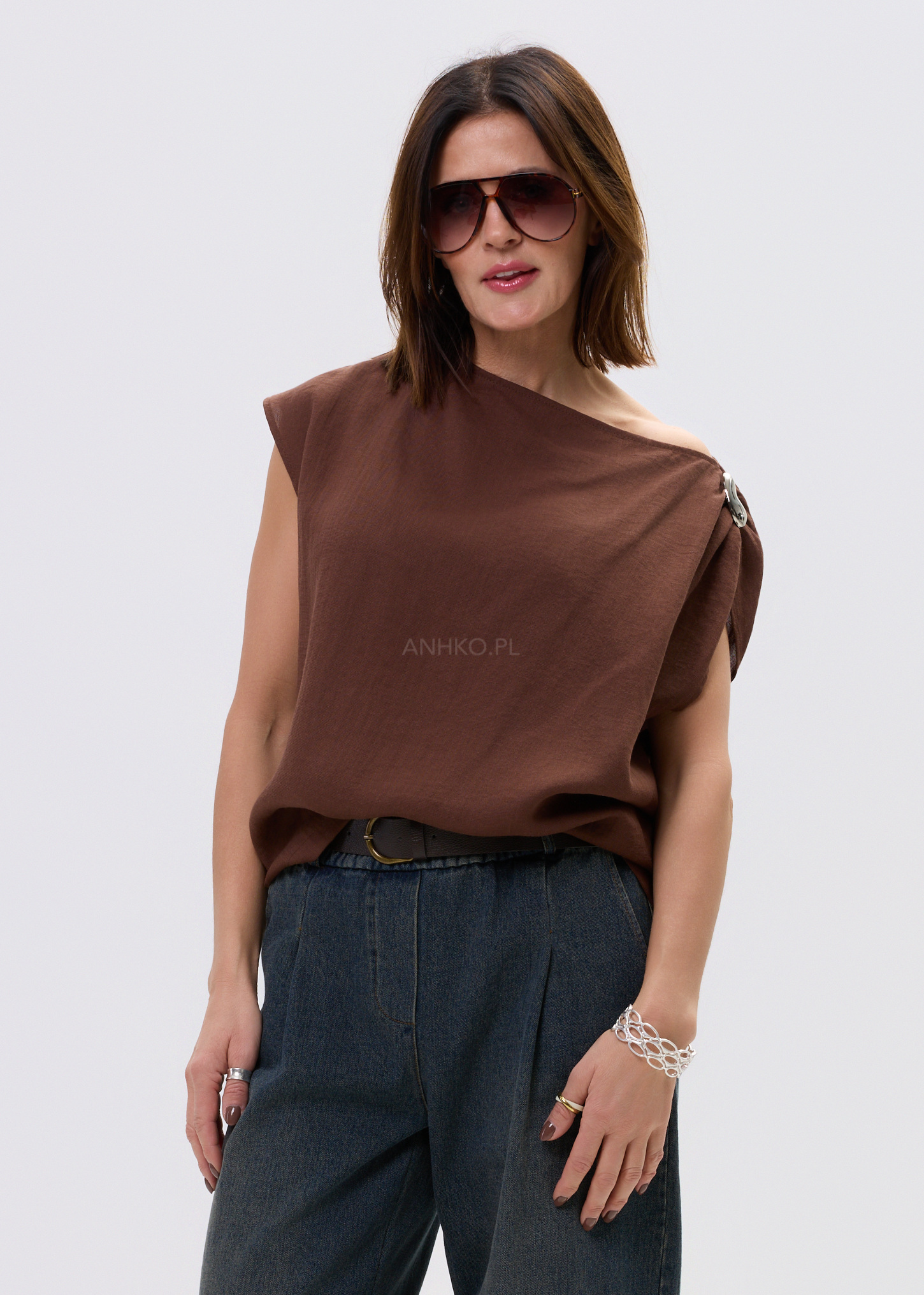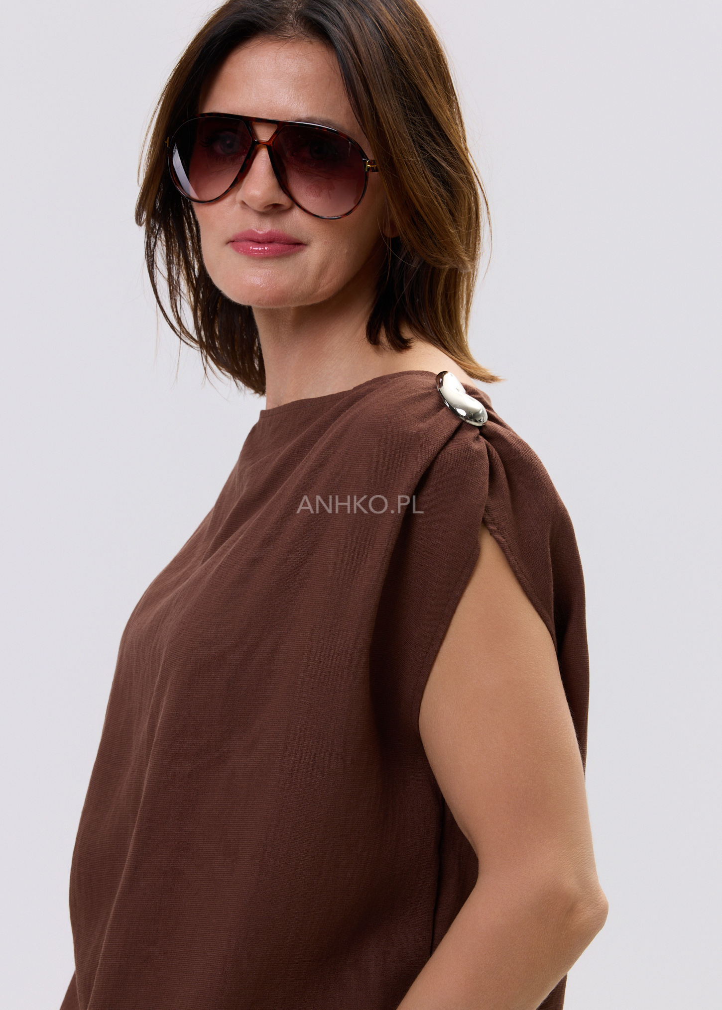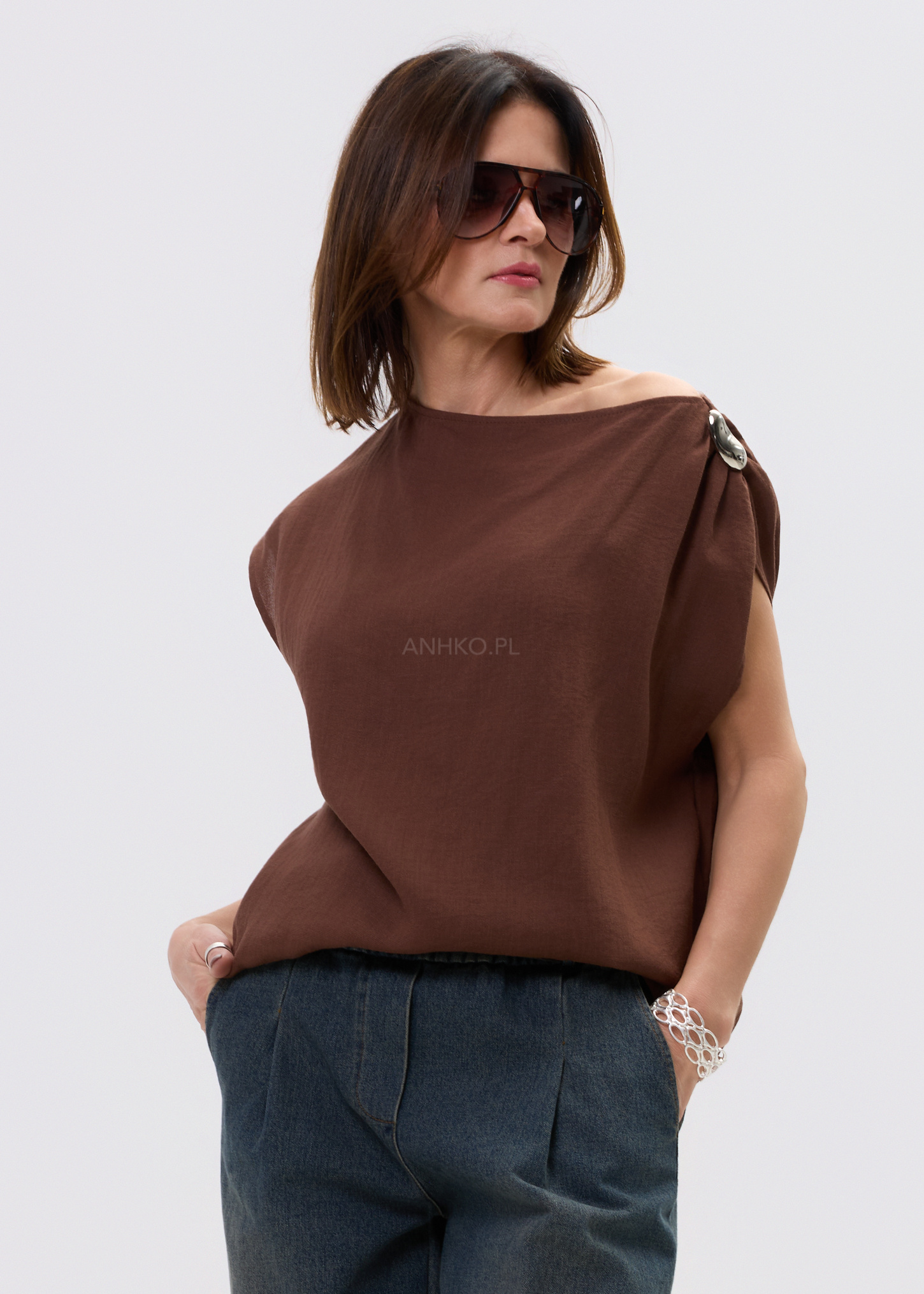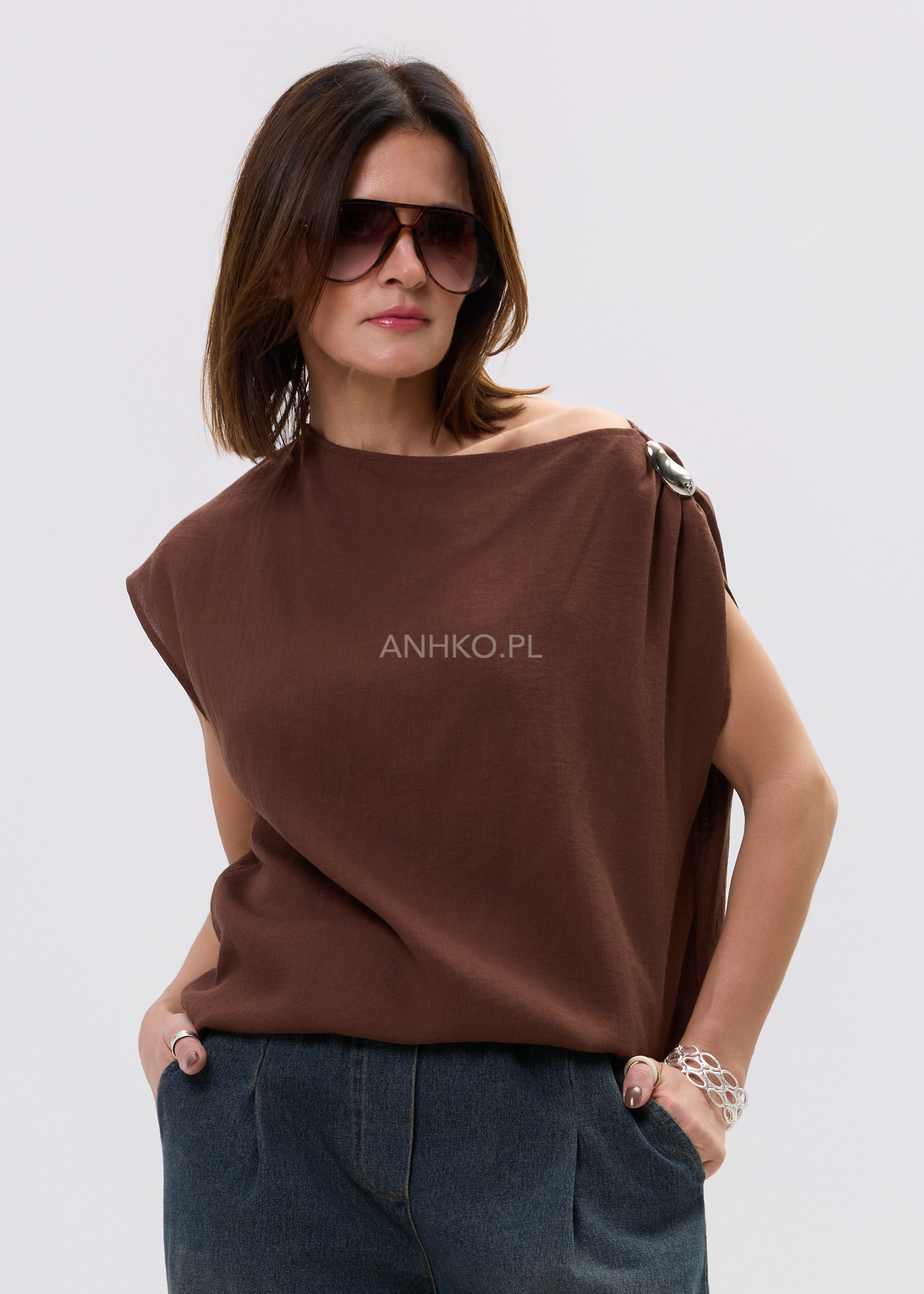 Ta bluzka damska w czekoladowym odcieniu to połączenie swobody i subtelnej elegancji. Luźny krój sprawia, że model lekko układa się na sylwetce, zapewniając komfort noszenia i naturalny, niewymuszony look. Szeroki dekolt typu łódka delikatnie podkreśla linię ramion, dzięki czemu całość wygląda kobieco i stylowo.