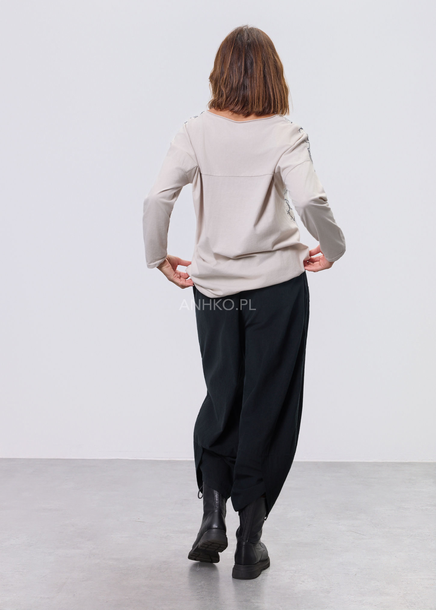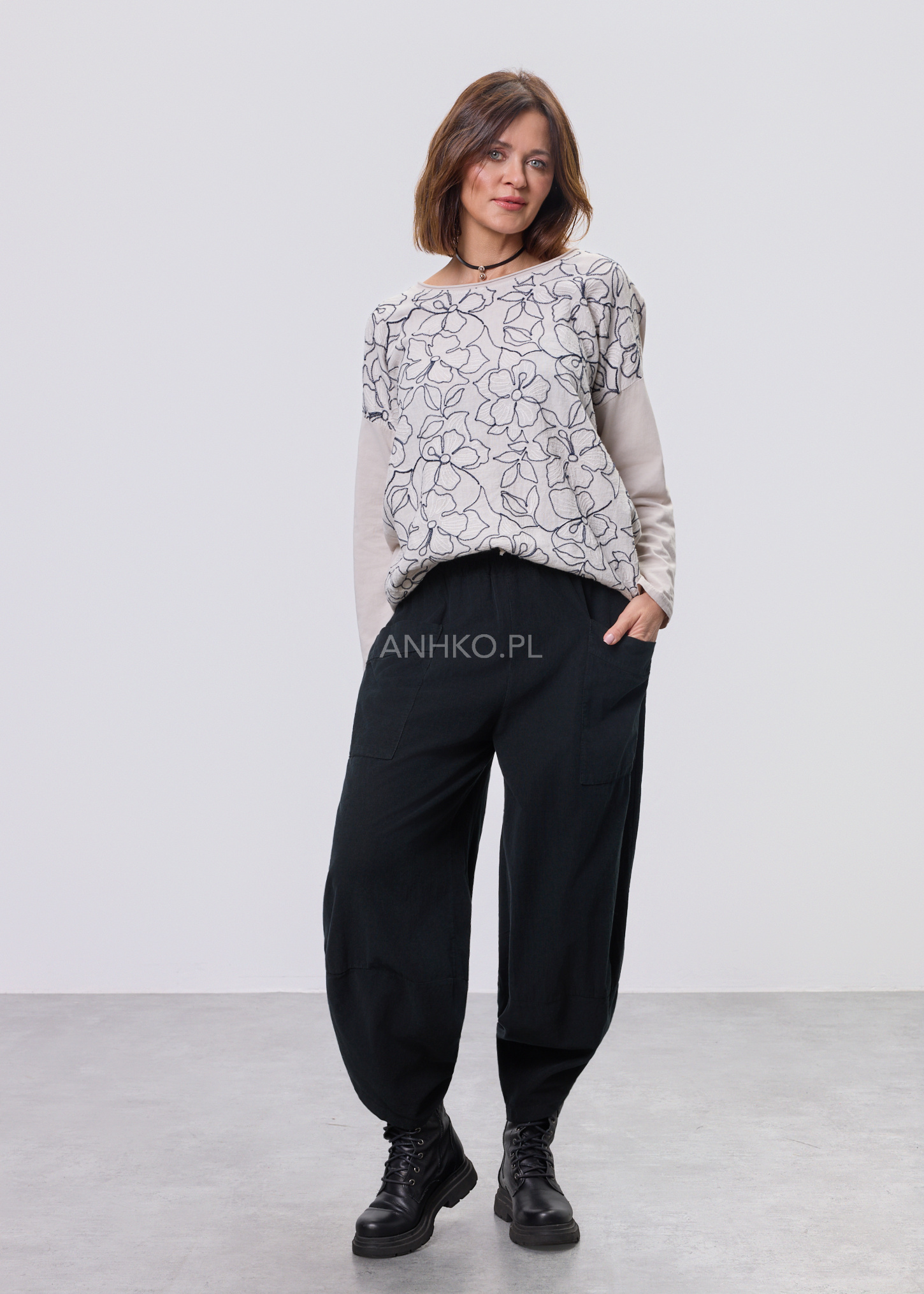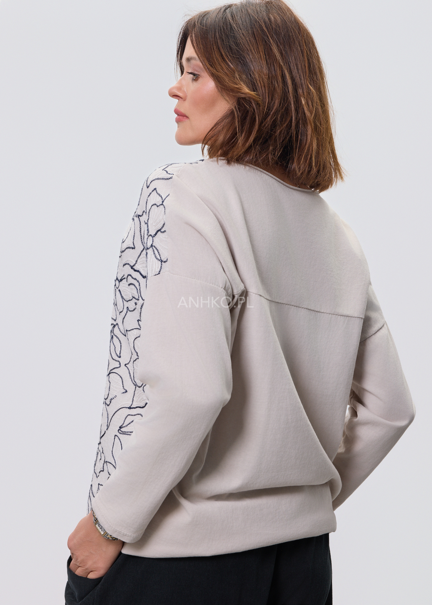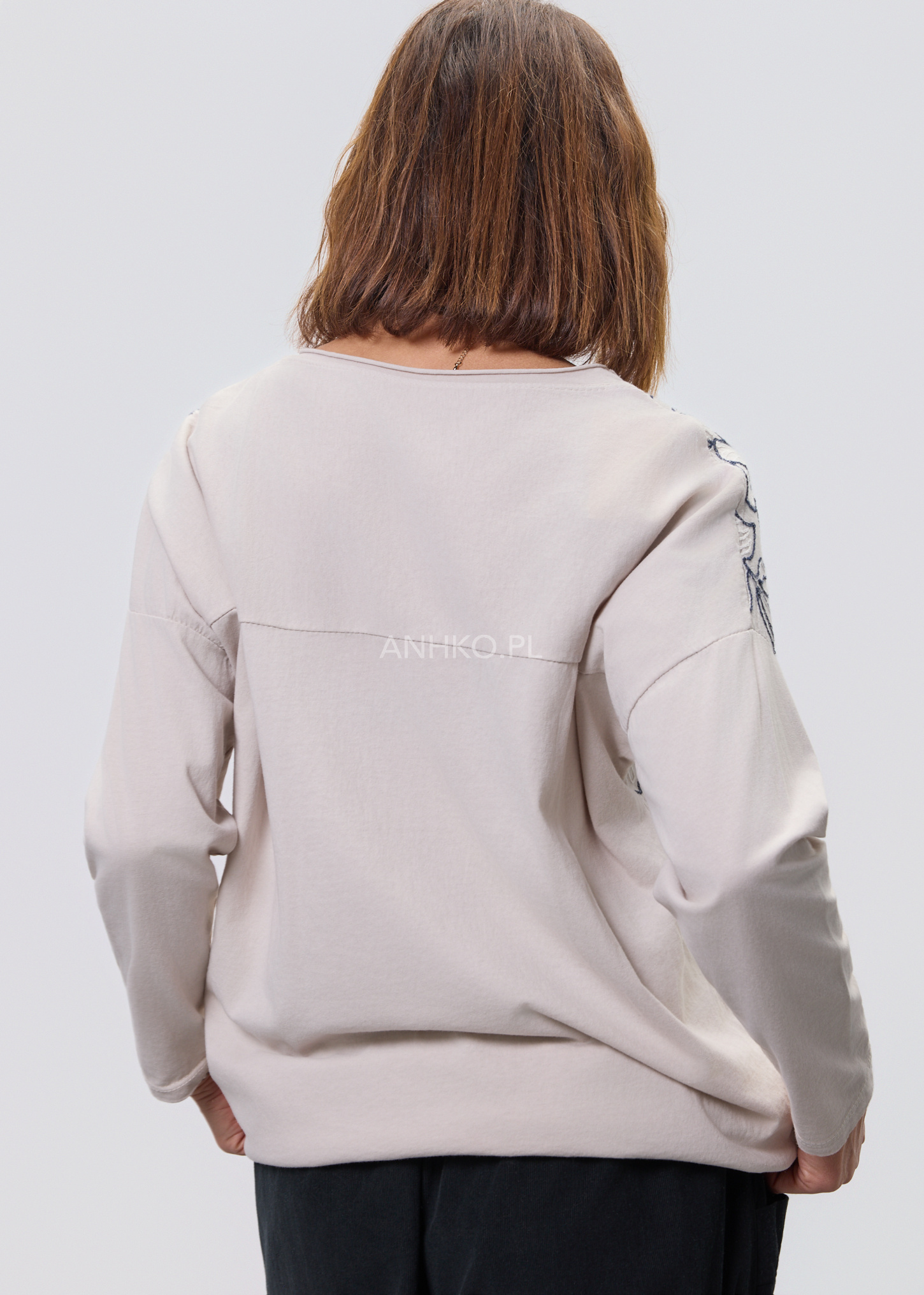 To połączenie komfortu i dopracowanego detalu. Model wyróżnia się ozdobnym haftem na przodzie, który nadaje całości wyrazistego, ale nienachalnego charakteru. Luźny krój oraz długie rękawy zapewniają swobodę ruchów i sprawiają, że bluzka doskonale układa się na sylwetce. Dół został wyposażony w regulowane wiązanie, pozwalające dopasować długość i objętość do indywidualnych preferencji. Model nie posiada kieszeni ani podszewki, dzięki czemu pozostaje lekki i przewiewny. Świetnie sprawdzi się zarówno w codziennych stylizacjach z jeansami lub spodniami materiałowymi, jak i w bardziej eleganckich zestawach do pracy, na spotkania czy wyjścia rodzinne.