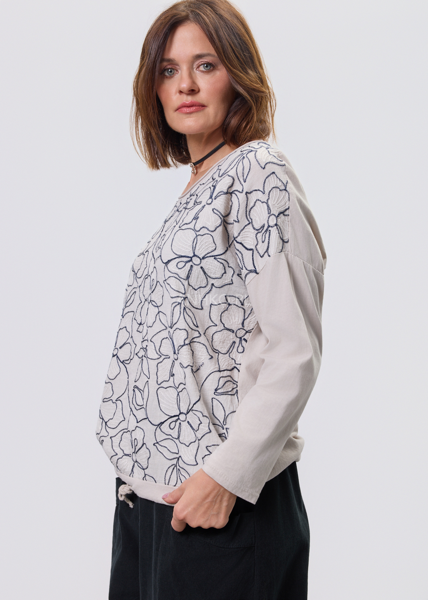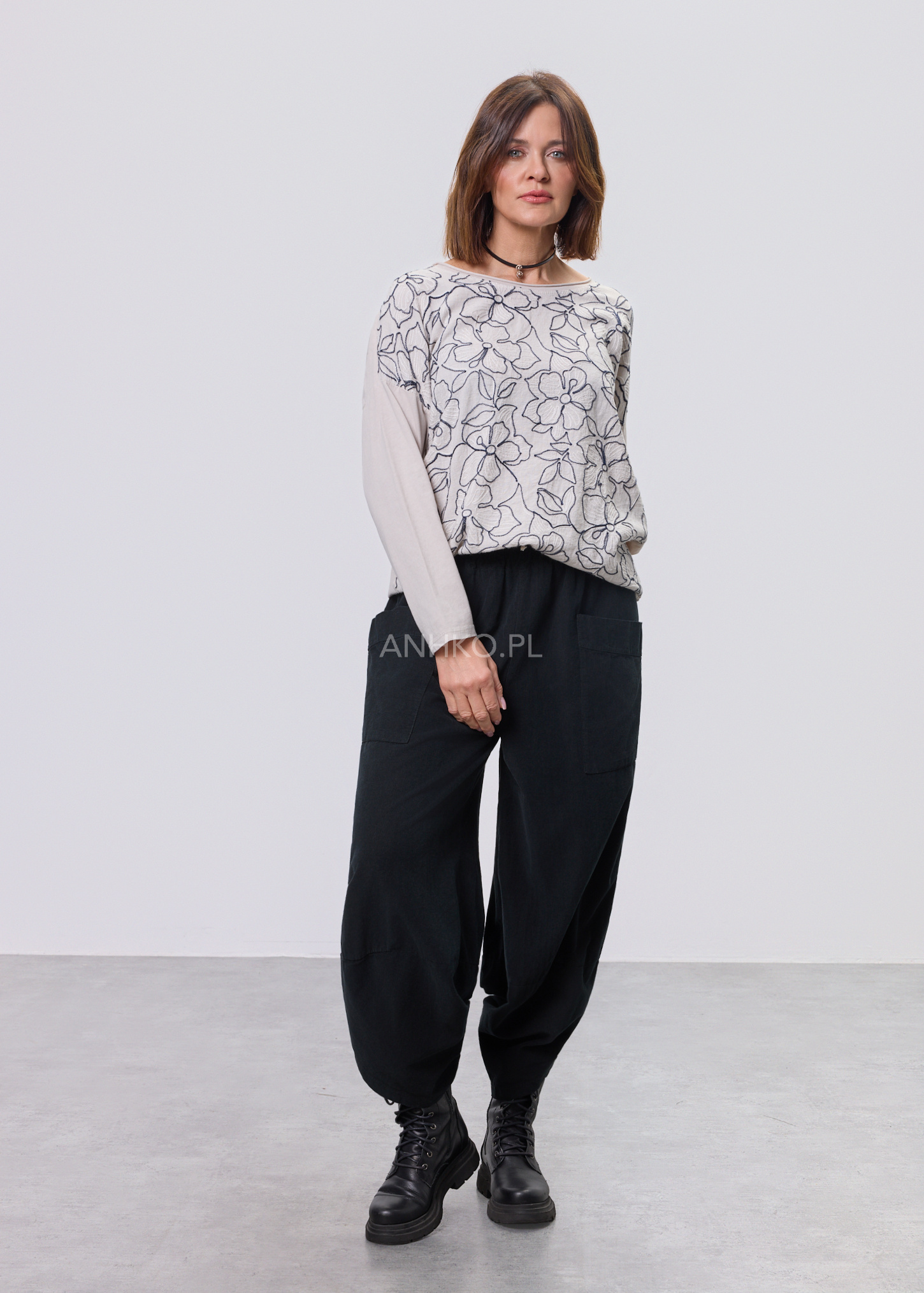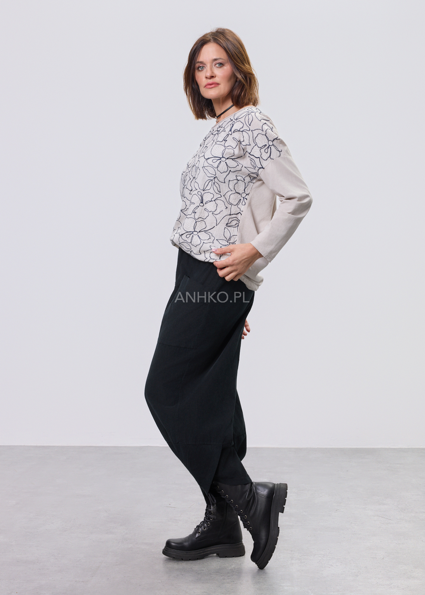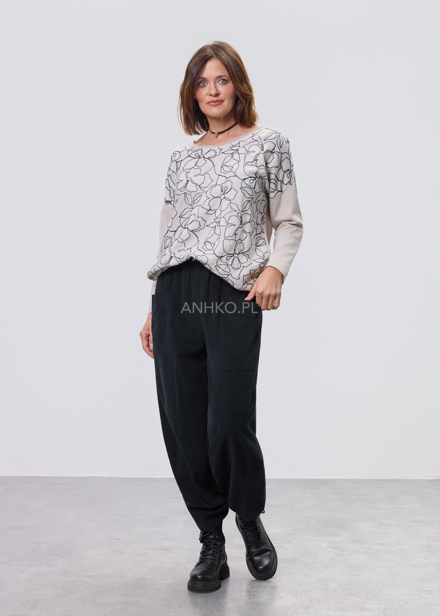 To połączenie komfortu i dopracowanego detalu. Model wyróżnia się ozdobnym haftem na przodzie, który nadaje całości wyrazistego, ale nienachalnego charakteru. Luźny krój oraz długie rękawy zapewniają swobodę ruchów i sprawiają, że bluzka doskonale układa się na sylwetce. Dół został wyposażony w regulowane wiązanie, pozwalające dopasować długość i objętość do indywidualnych preferencji. Model nie posiada kieszeni ani podszewki, dzięki czemu pozostaje lekki i przewiewny. Świetnie sprawdzi się zarówno w codziennych stylizacjach z jeansami lub spodniami materiałowymi, jak i w bardziej eleganckich zestawach do pracy, na spotkania czy wyjścia rodzinne.