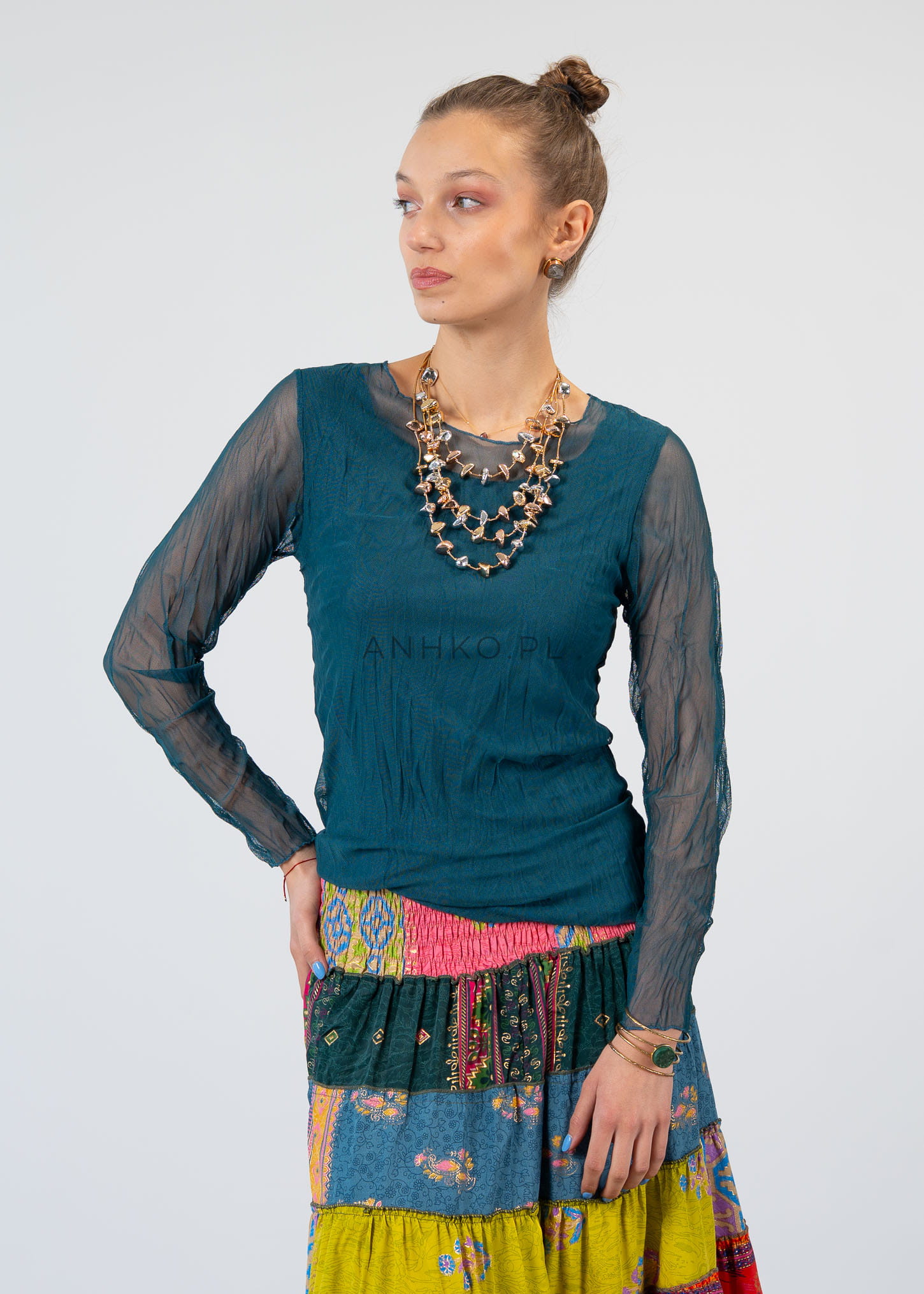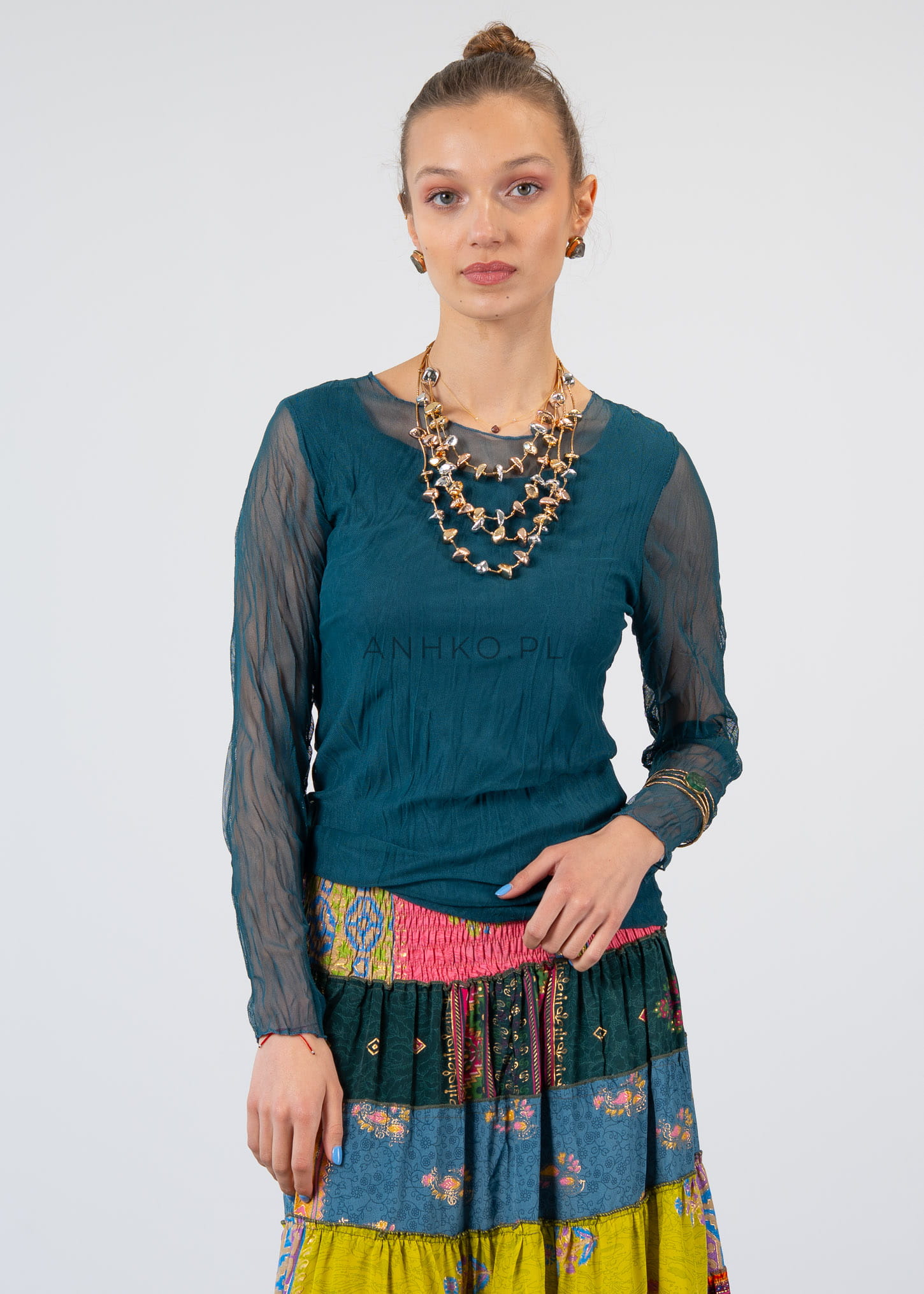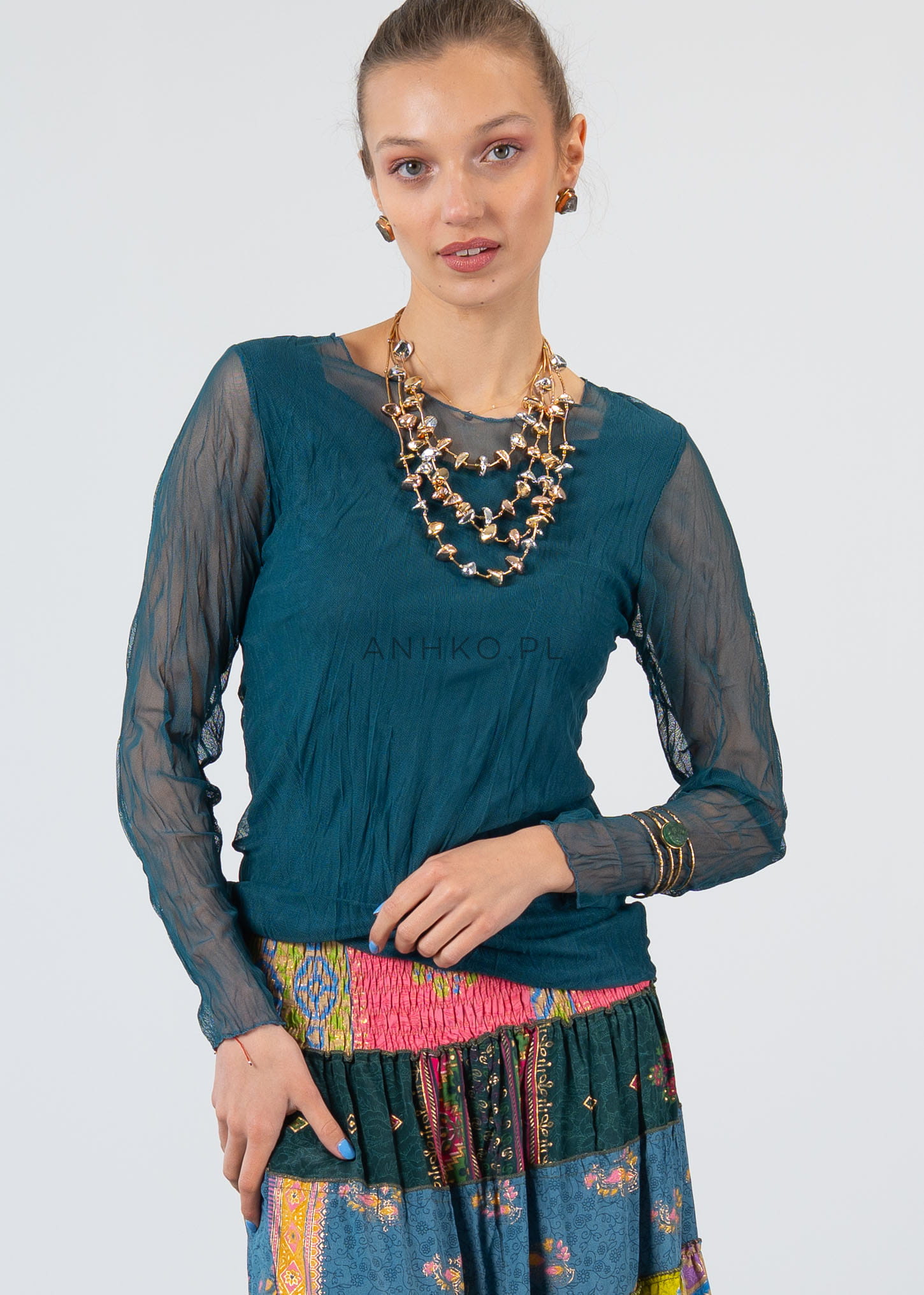 Ta bluzka z długim rękawem doskonale układa się na sylwetce, podkreślając jej linię dzięki dopasowanemu, ale komfortowemu krojowi. Delikatna, półtransparentna tkanina na rękawach i górnej części tworzy efekt lekkości, a dwuwarstwowa konstrukcja zapewnia wygodę i poczucie swobody.
