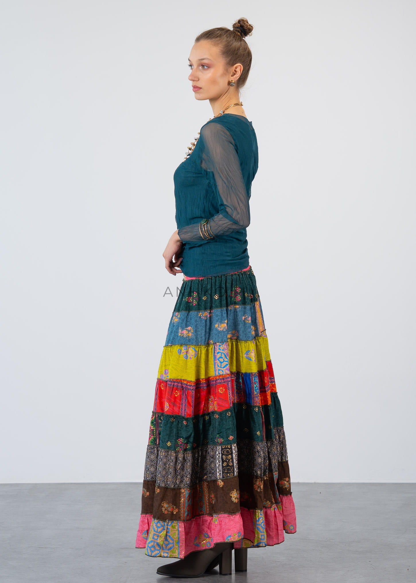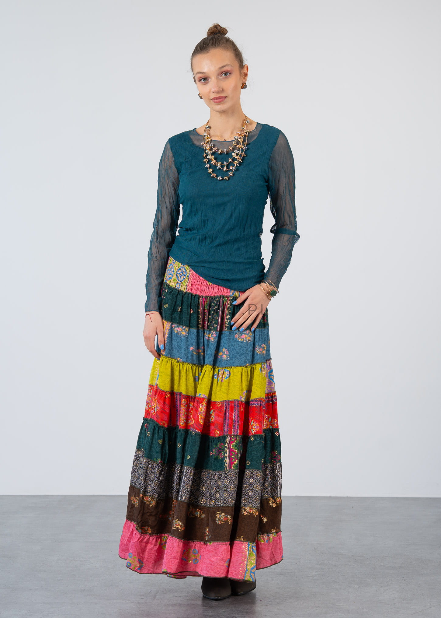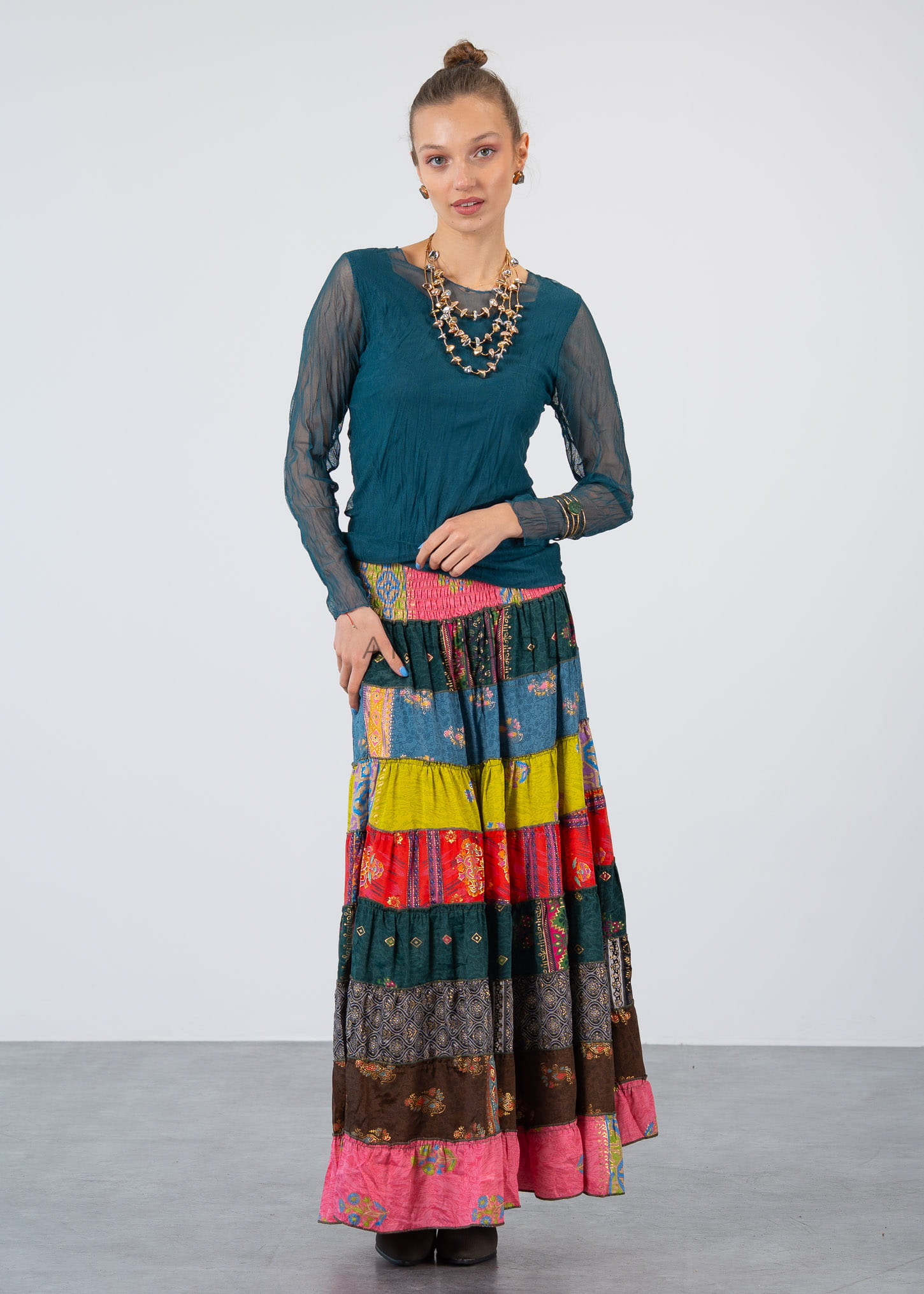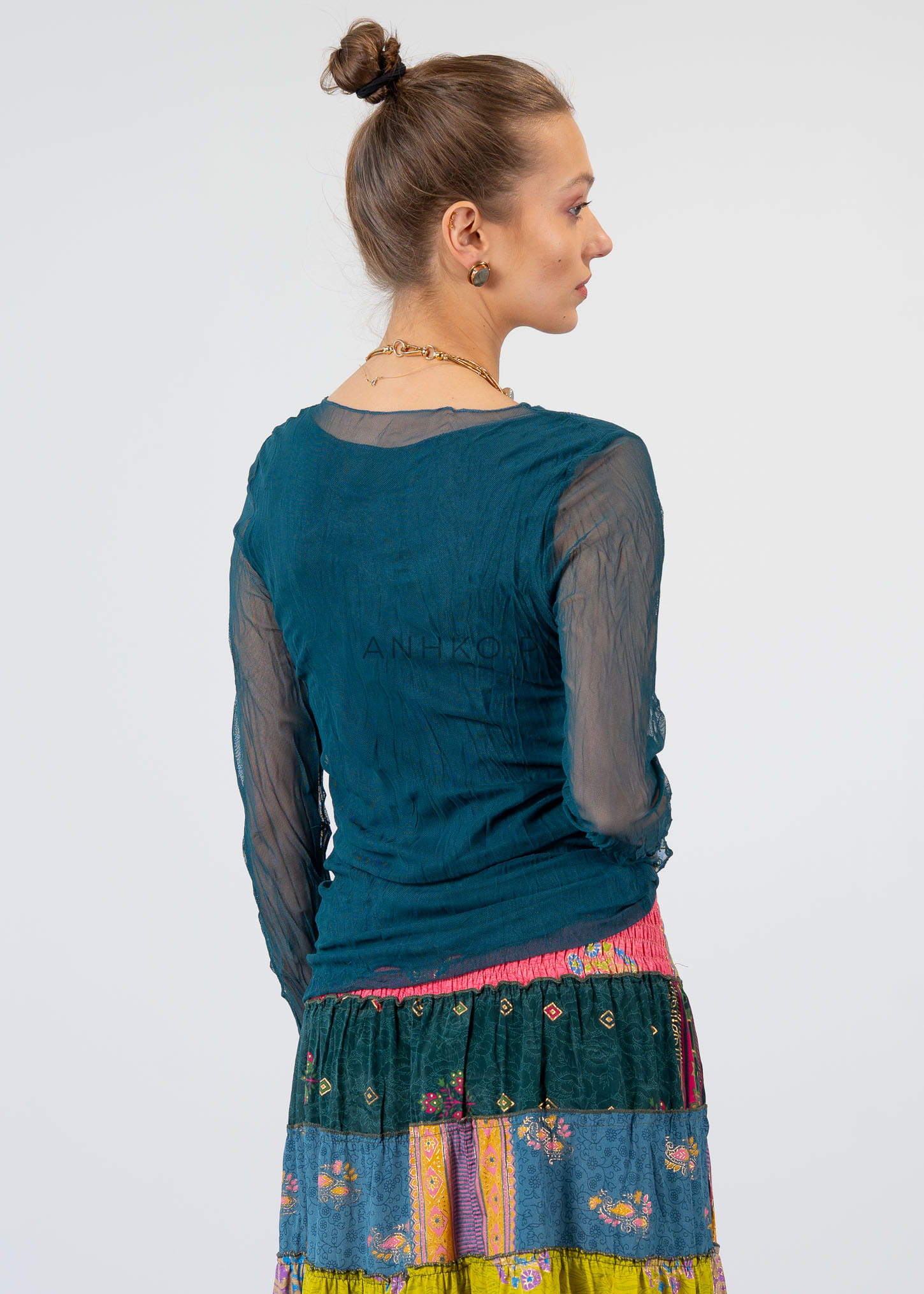 Ta bluzka z długim rękawem doskonale układa się na sylwetce, podkreślając jej linię dzięki dopasowanemu, ale komfortowemu krojowi. Delikatna, półtransparentna tkanina na rękawach i górnej części tworzy efekt lekkości, a dwuwarstwowa konstrukcja zapewnia wygodę i poczucie swobody.