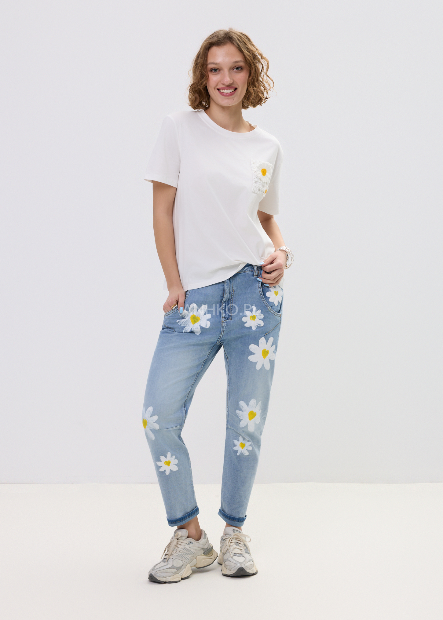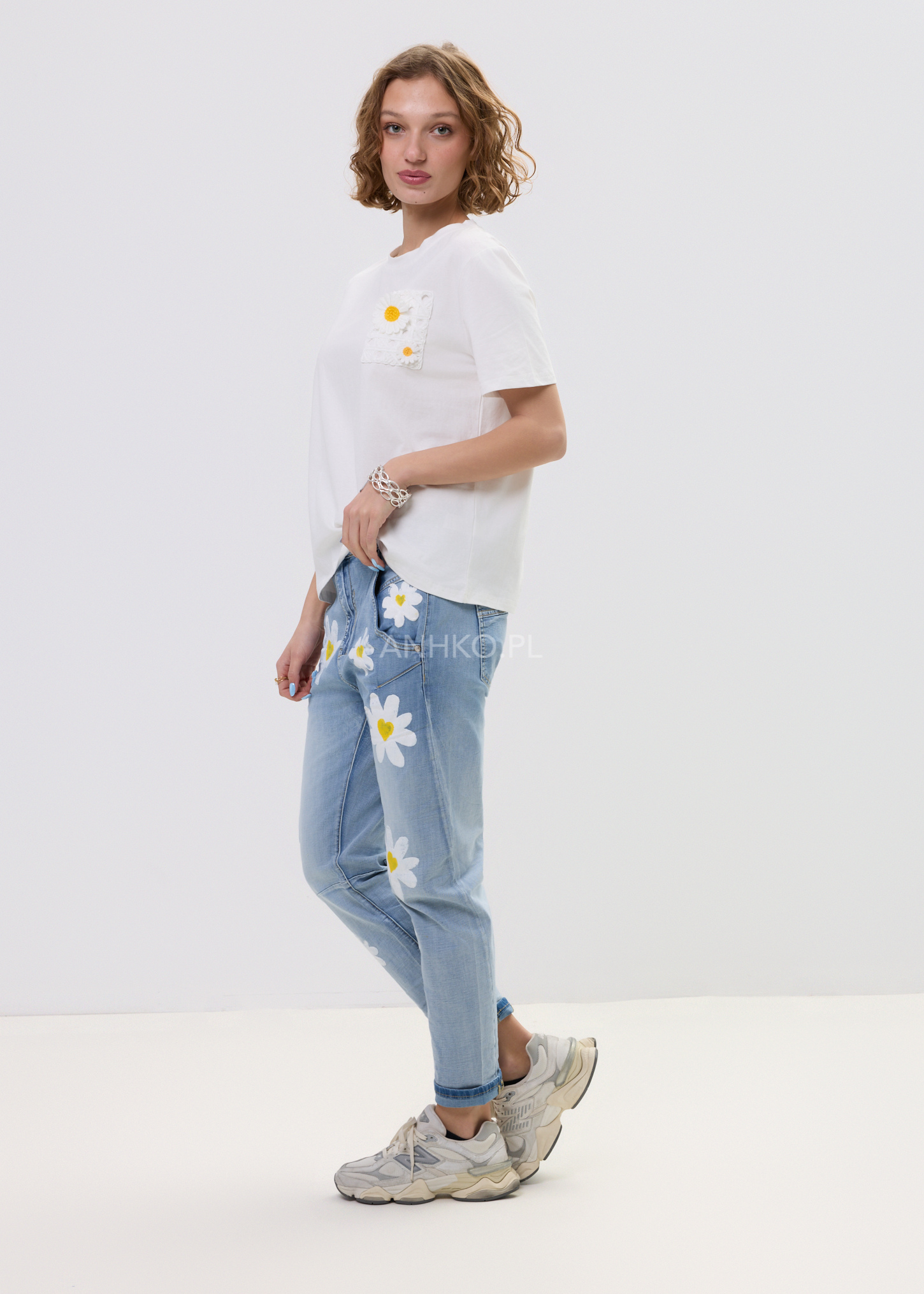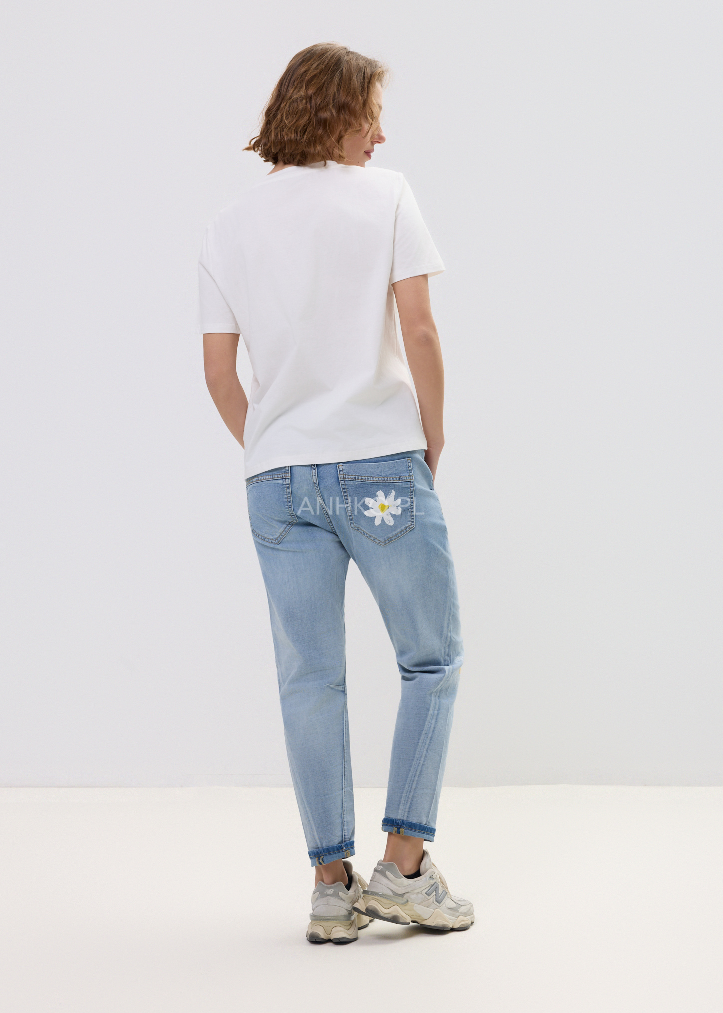 Jeansy Stocrod Denim - Luźne jeansy z uroczym printem stokrotek, które od razu przyciągają uwagę. Jasny denim, wygodny krój i podwinięte nogawki tworzą idealne połączenie stylu i komfortu. Spodnie, które dodają stylizacji lekkości i wakacyjnego klimatu.