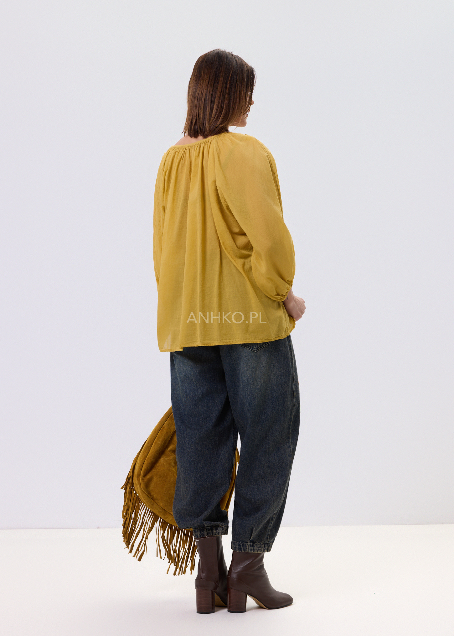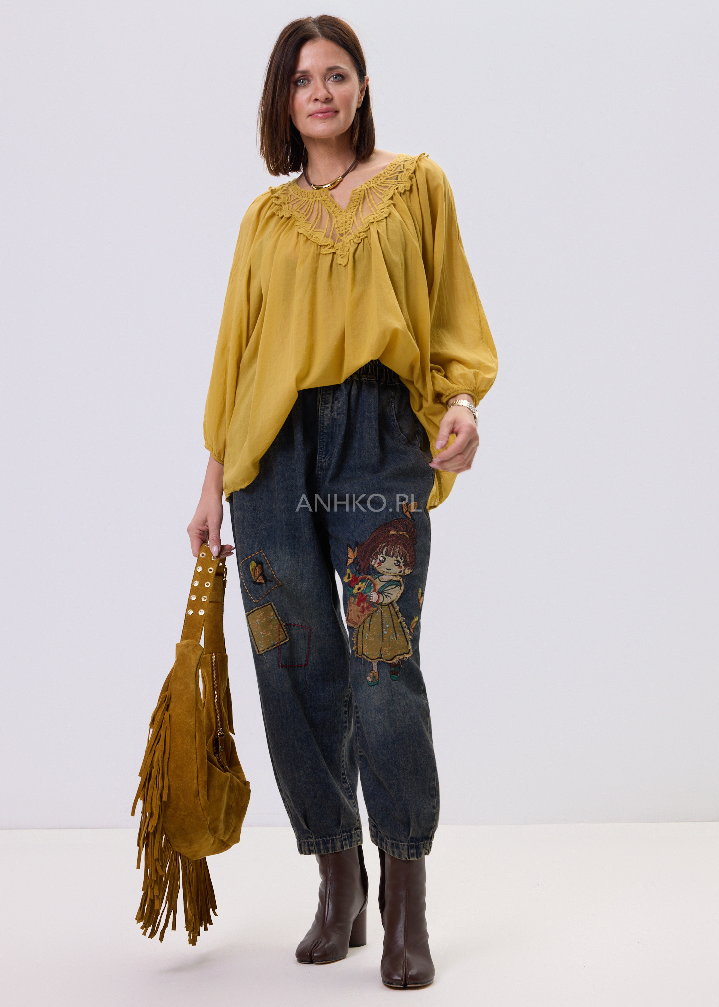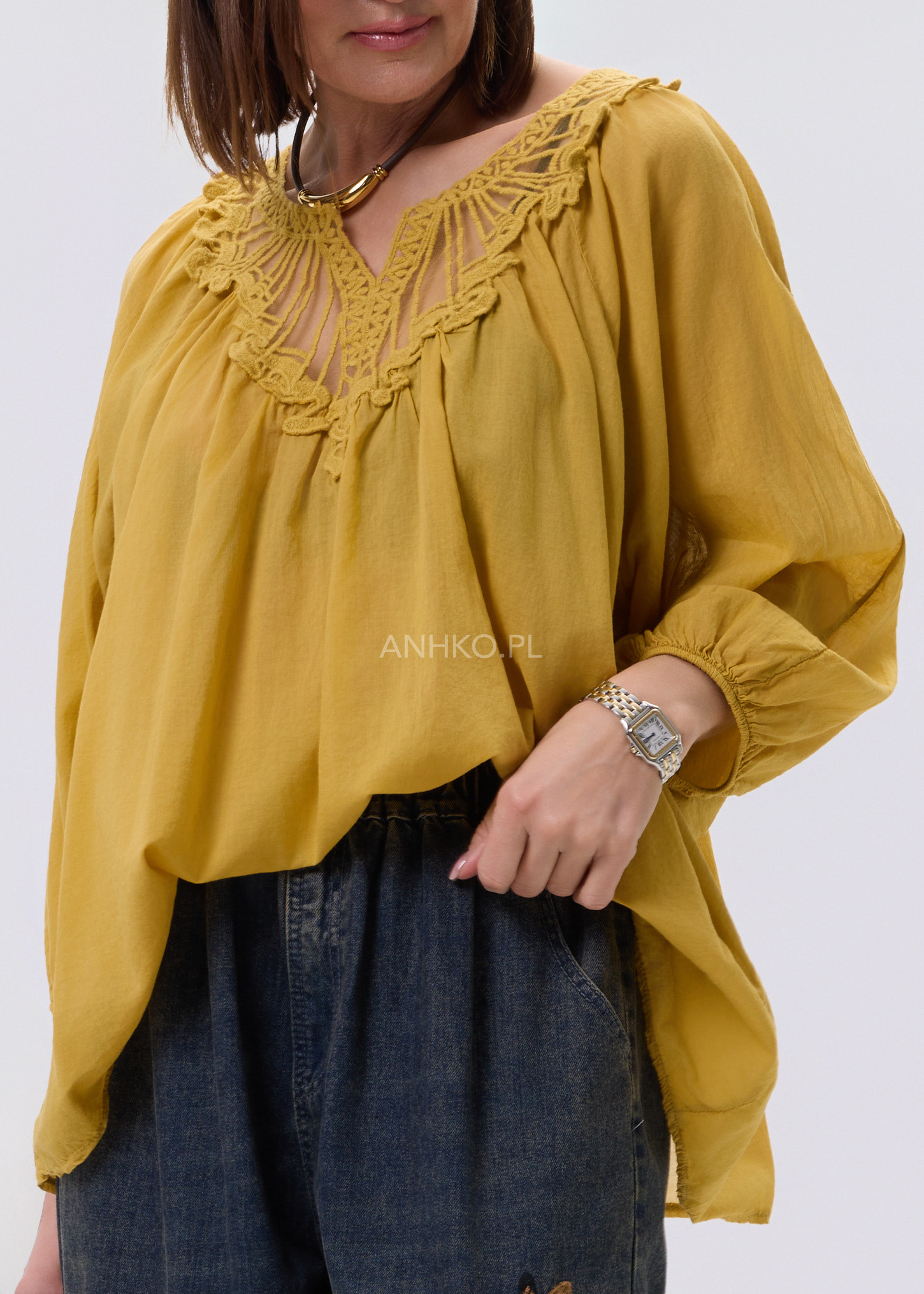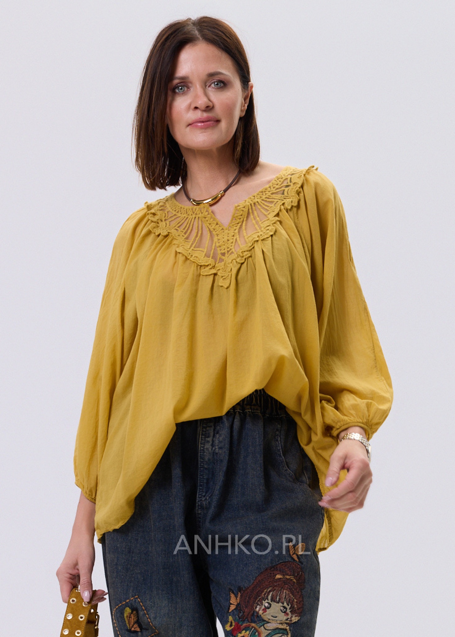 Bluzka o luźnym, swobodnym kroju, która łączy w sobie komfort noszenia i dekoracyjny charakter. Model wyróżnia się efektownym haftem przy dekolcie w kształcie litery V, który przyciąga uwagę i nadaje całości unikalnego wyglądu. Długie rękawy zakończone delikatnym marszczeniem dodają lekkości i subtelnej objętości. Brak kieszeni i podszewki sprawia, że fason pozostaje lekki i zwiewny, idealny do stylizacji warstwowych. Doskonale sprawdzi się w codziennych zestawach z jeansami lub spodniami materiałowymi, a także w bardziej eleganckich stylizacjach z spódnicą. Odpowiednia na spotkania, spacery, wyjazdy oraz casualowe uroczystości.