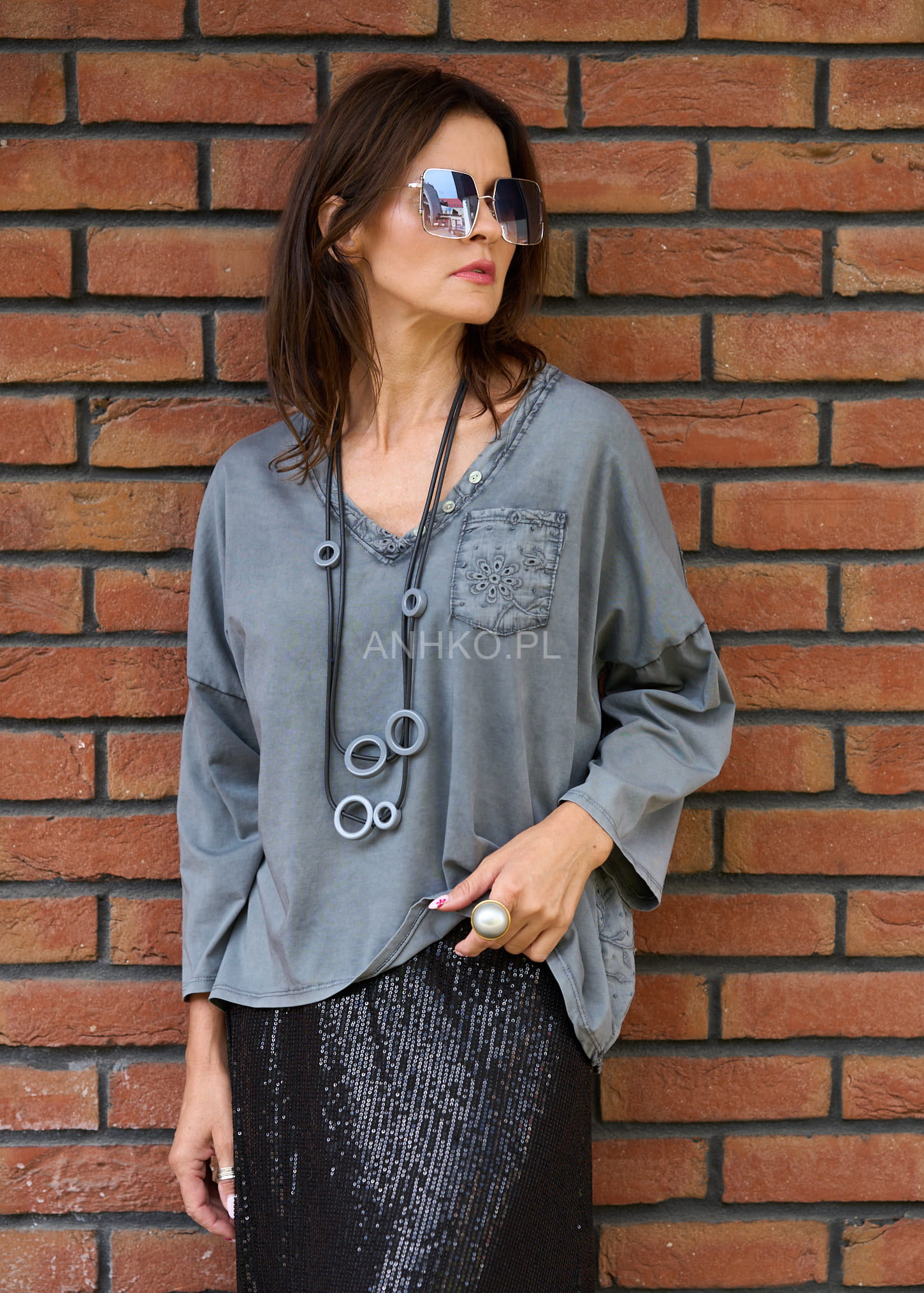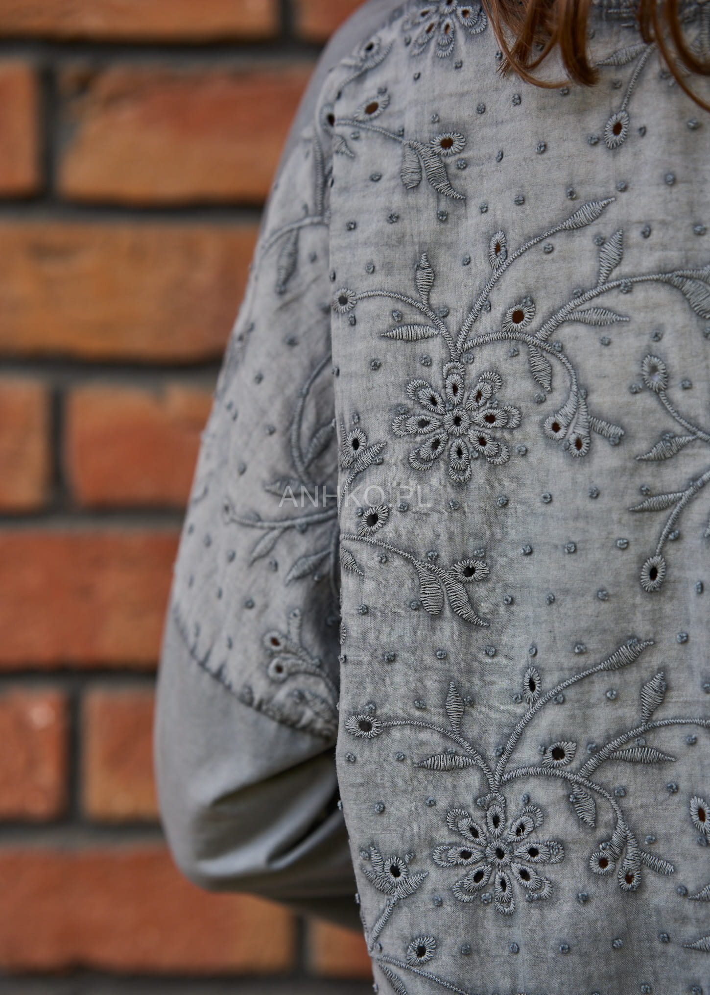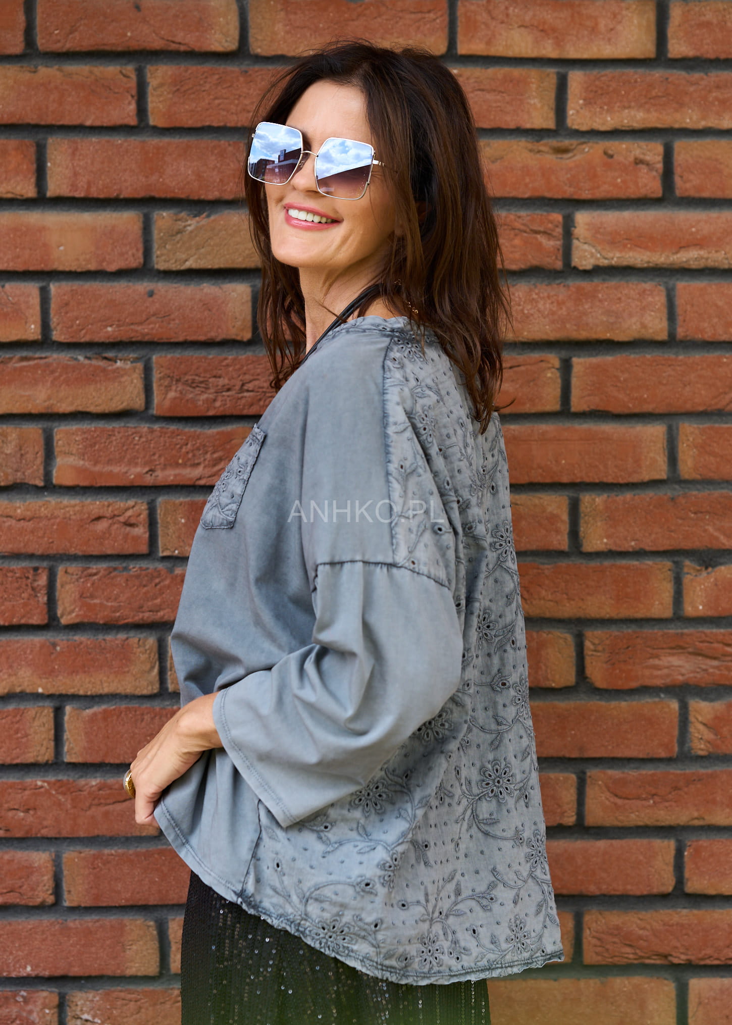 To szara bluzka, która łączy elegancję z nutą romantyzmu. Wykonana z lekkiego, przewiewnego materiału, ozdobiona haftem i koronkowymi wstawkami z przodu oraz z tyłu. Dekolt w kształcie litery V z guzikami dodaje delikatności, a luźny krój zapewnia komfort noszenia. Idealna do jeansów, eleganckich spodni lub spódnic, sprawdzi się zarówno w codziennych stylizacjach, jak i na wieczorne spotkania czy do pracy. Szary kolor i ponadczasowy design czynią ją bazą garderoby, którą można łatwo wystylizować na wiele sposobów.