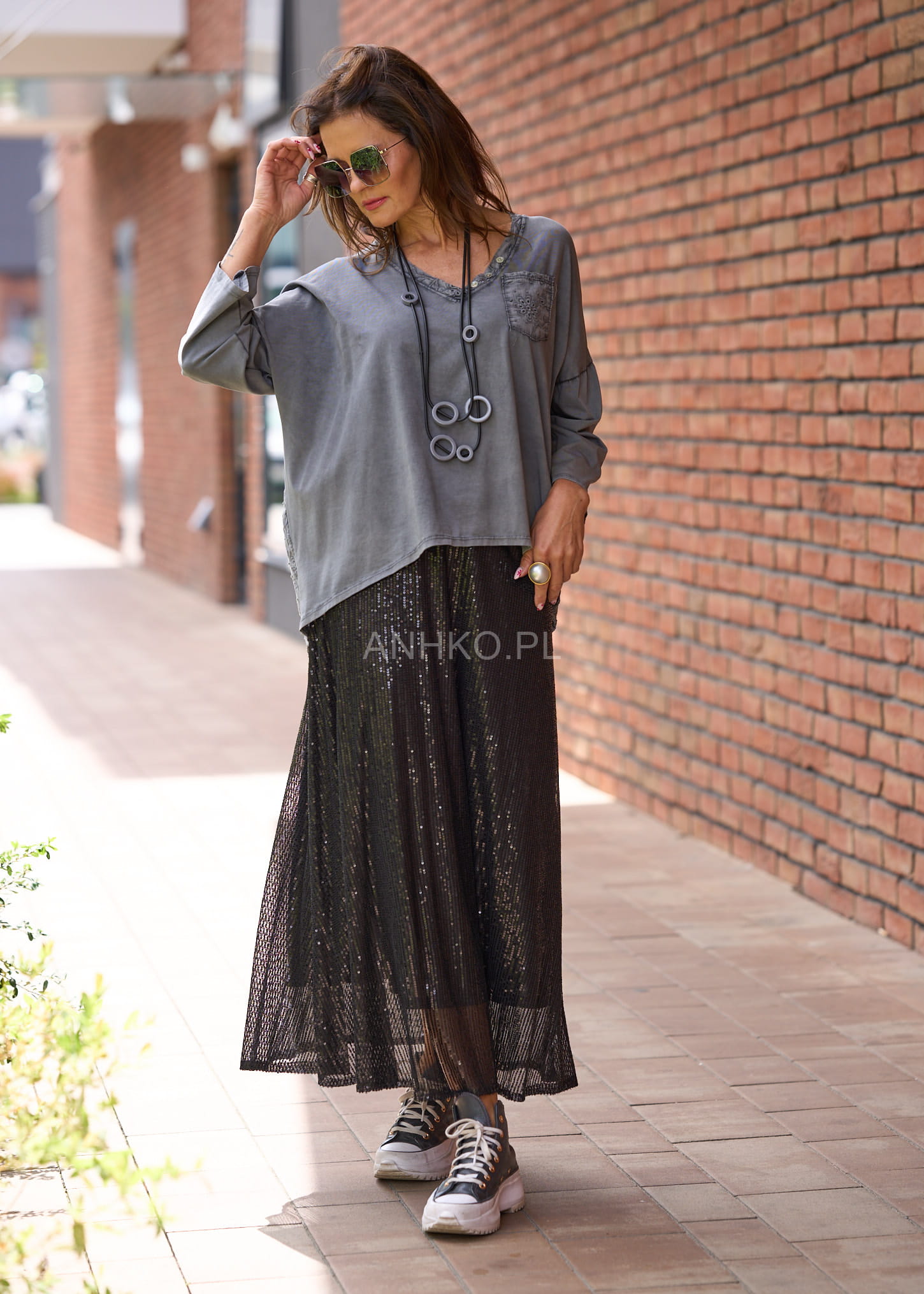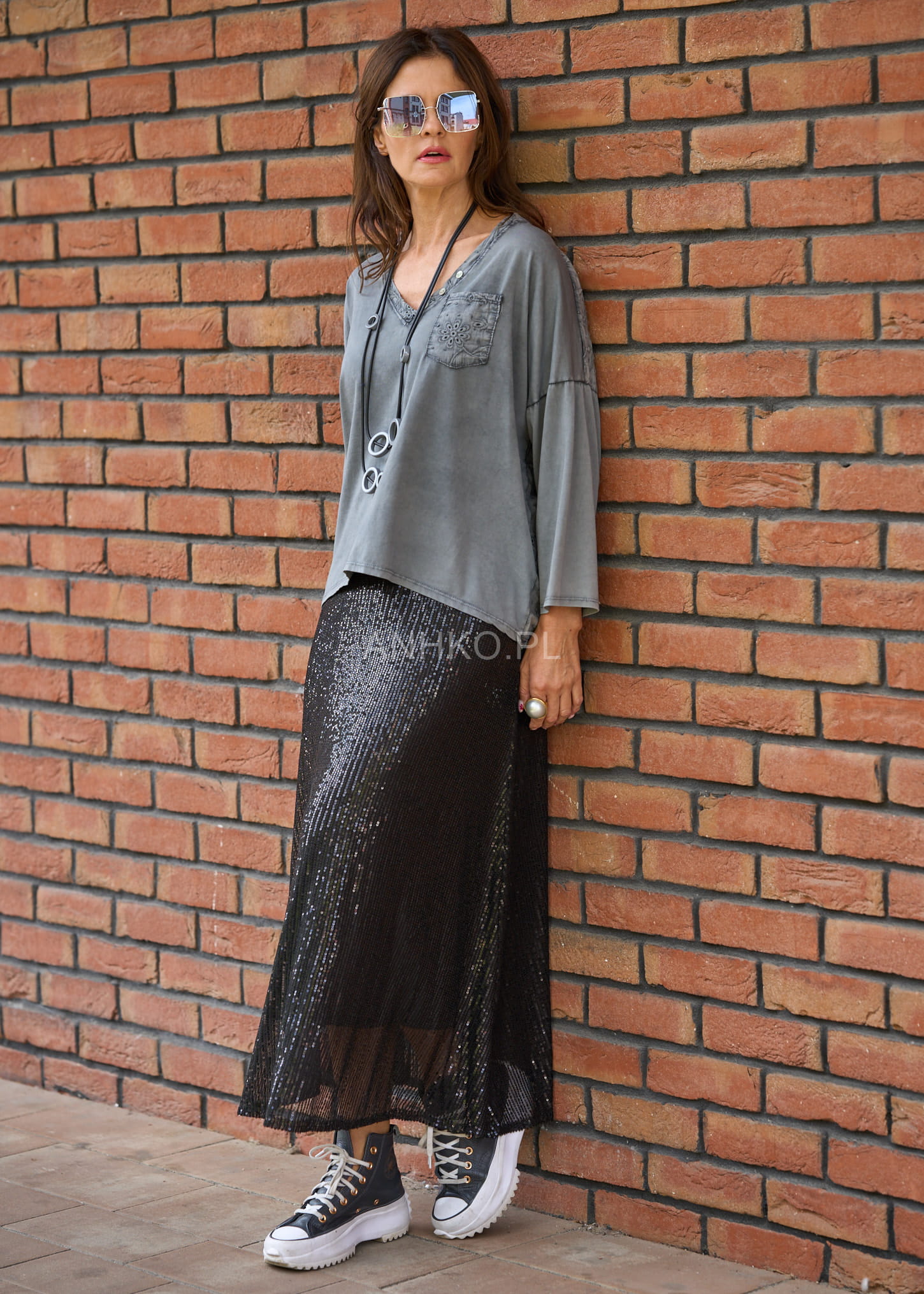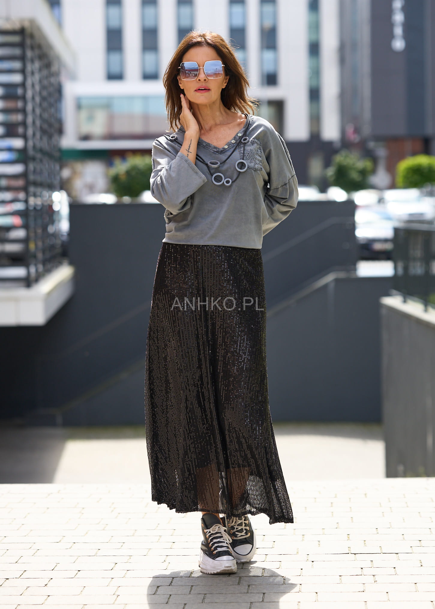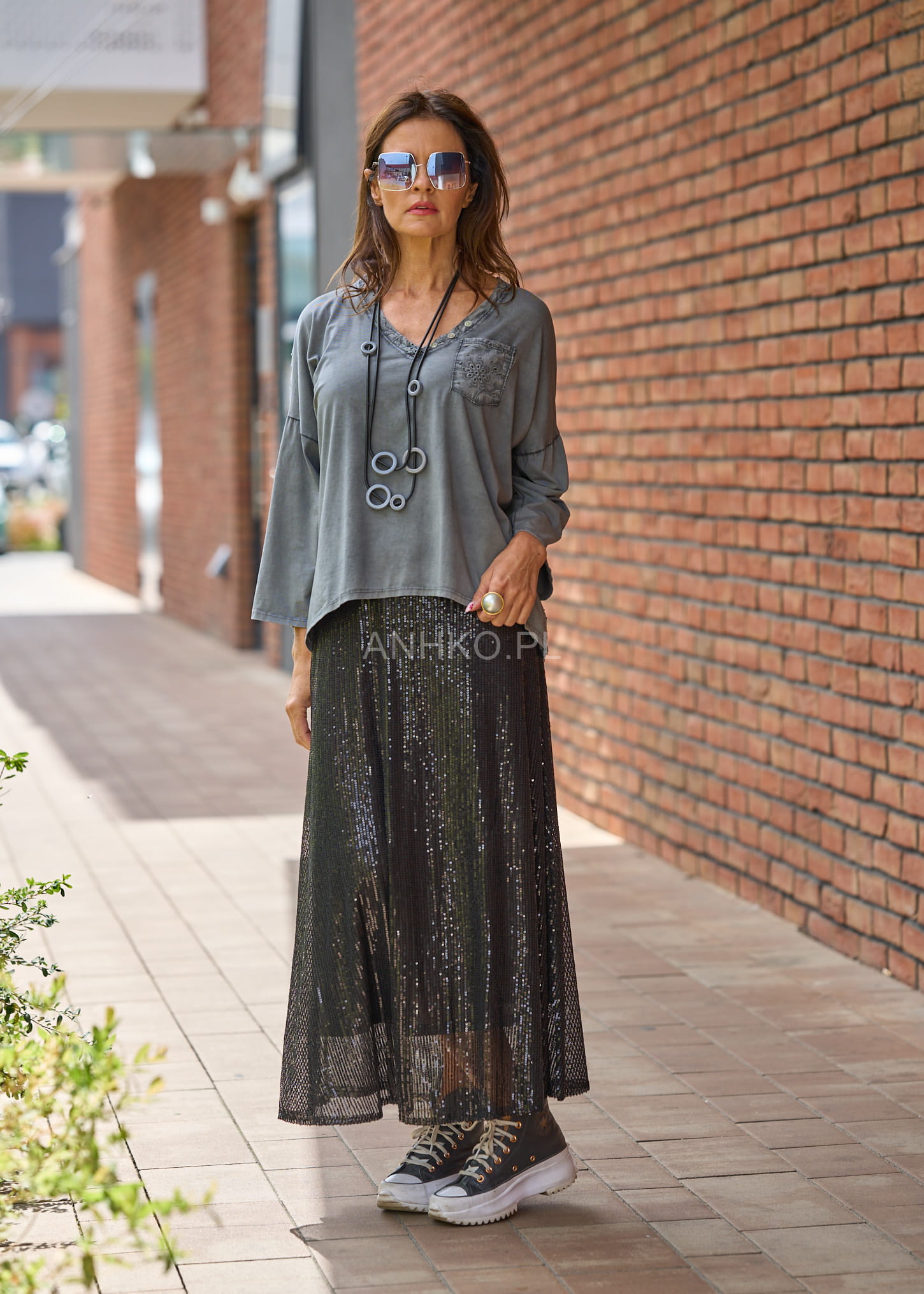 To szara bluzka, która łączy elegancję z nutą romantyzmu. Wykonana z lekkiego, przewiewnego materiału, ozdobiona haftem i koronkowymi wstawkami z przodu oraz z tyłu. Dekolt w kształcie litery V z guzikami dodaje delikatności, a luźny krój zapewnia komfort noszenia. Idealna do jeansów, eleganckich spodni lub spódnic, sprawdzi się zarówno w codziennych stylizacjach, jak i na wieczorne spotkania czy do pracy. Szary kolor i ponadczasowy design czynią ją bazą garderoby, którą można łatwo wystylizować na wiele sposobów.