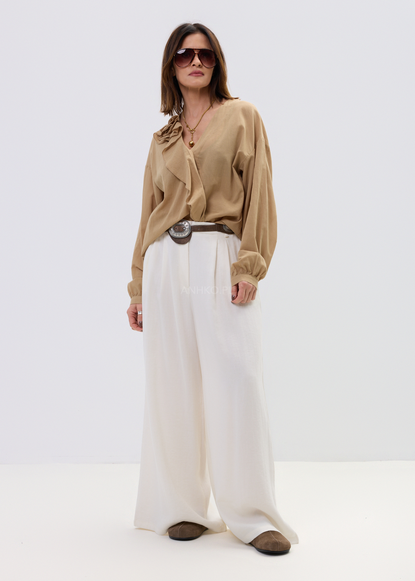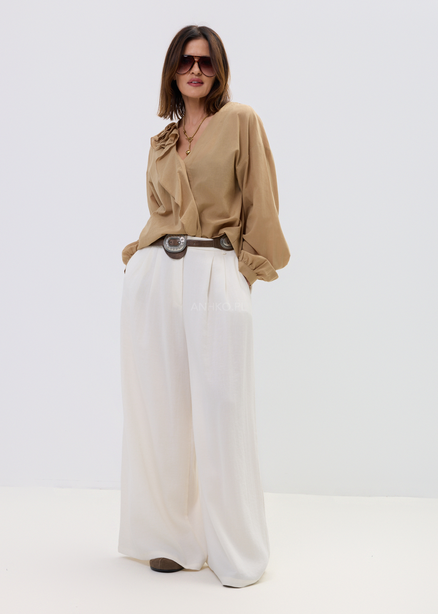 Spodnie Sofola Śmietankowe - Lekkie, śmietankowe spodnie o szerokiej nogawce, które łączą komfort z eleganckim vibe’em. Idealne na co dzień i na wyjścia – wyglądają świetnie zarówno z basicowym topem, jak i marynarką.