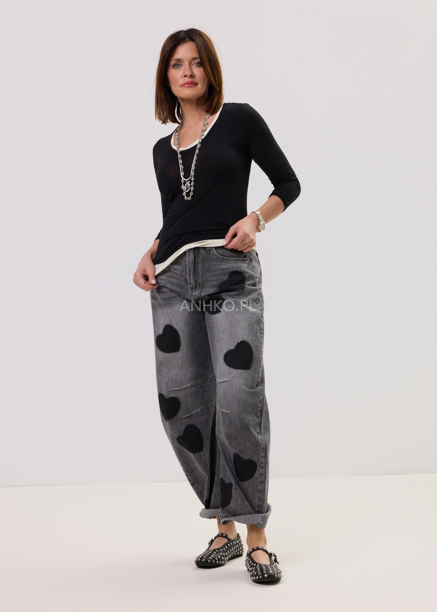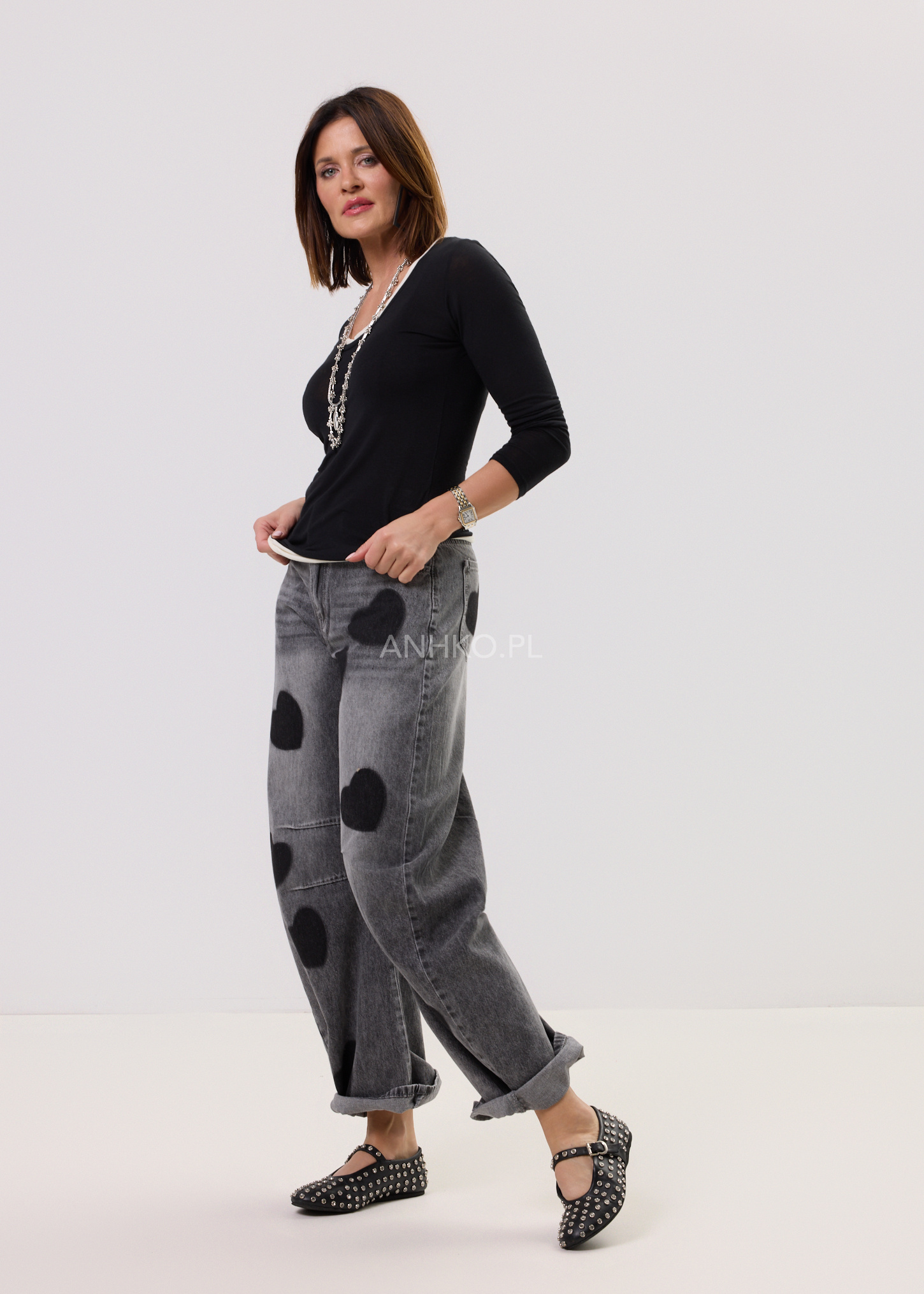 Jeansy HeartBeat Gray Denim - Grafitowe baggy z charakterem. Sprany denim i kontrastowe serca w formie printu robią efekt WOW bez przesady. Wysoki stan, luźna nogawka i pełna długość – idealne, jeśli lubisz modę z nutą street i luz w najlepszym wydaniu.