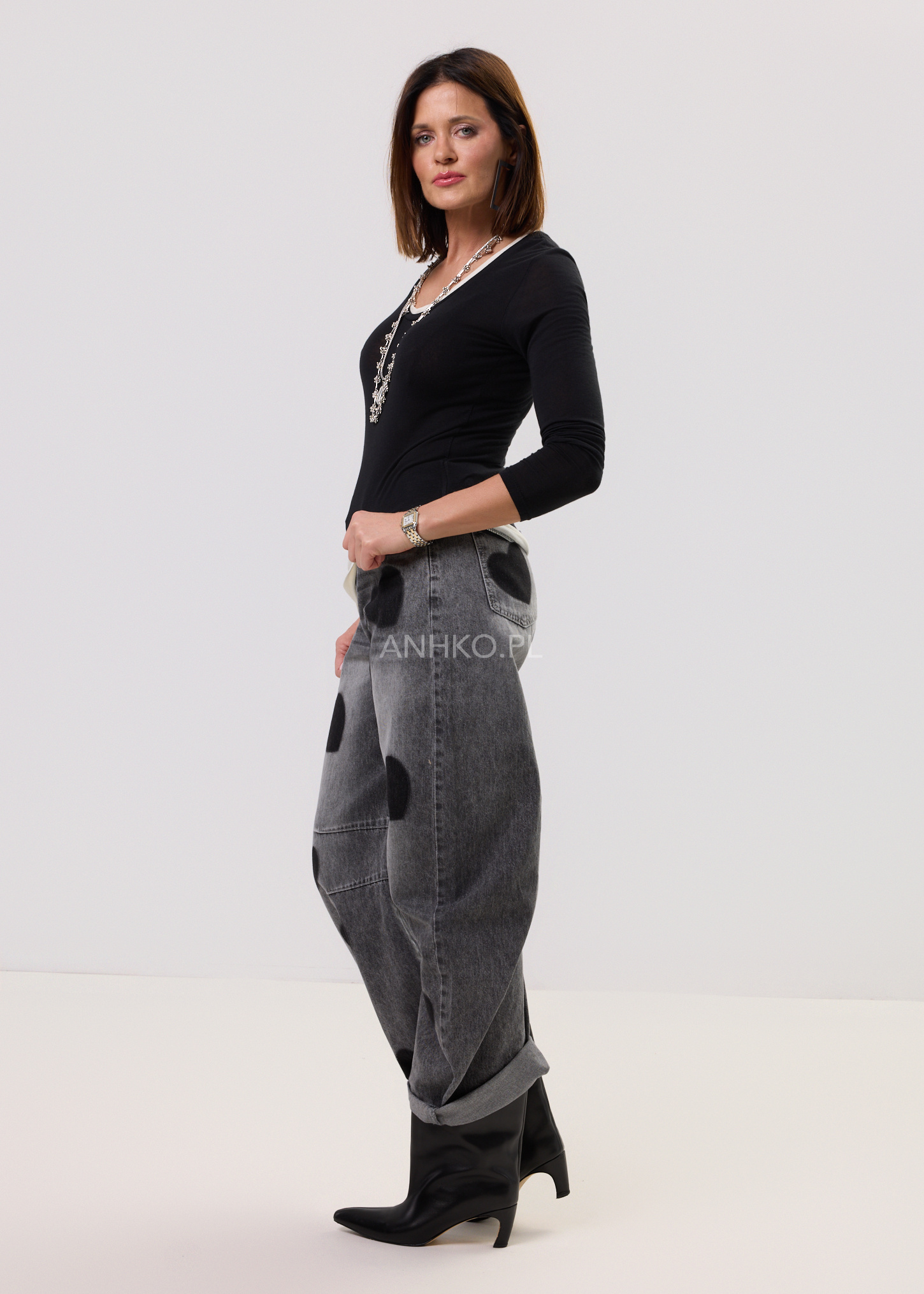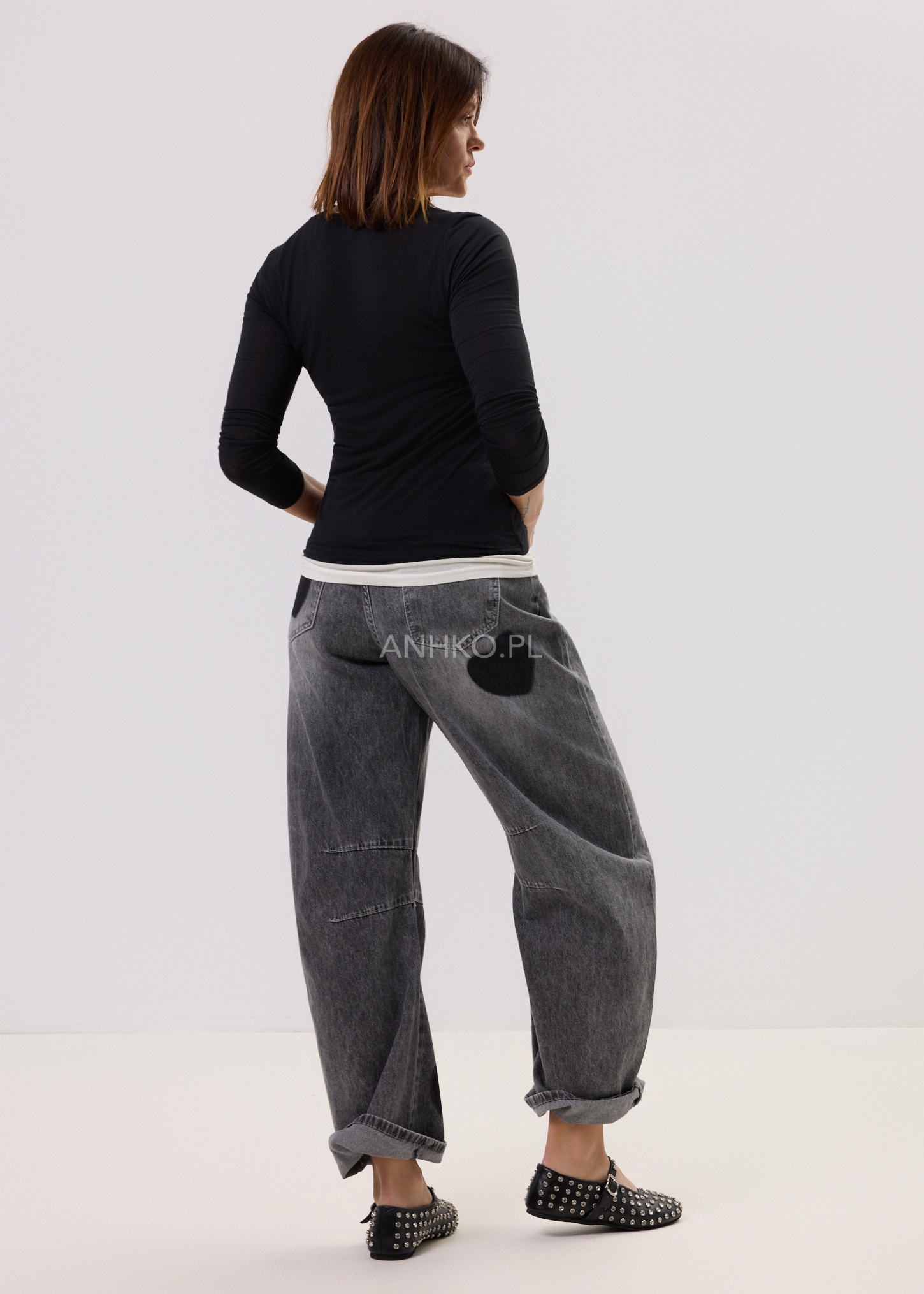 Jeansy Patisa Antracytowe - Komfortowe spodnie o luźnym kroju z elastyczną talią, wykonane z miękkiej bawełny. Posiadają praktyczne kieszenie i wywijane nogawki, dodające całości nonszalanckiego charakteru. Idealne do codziennych stylizacji i casualowych zestawów.