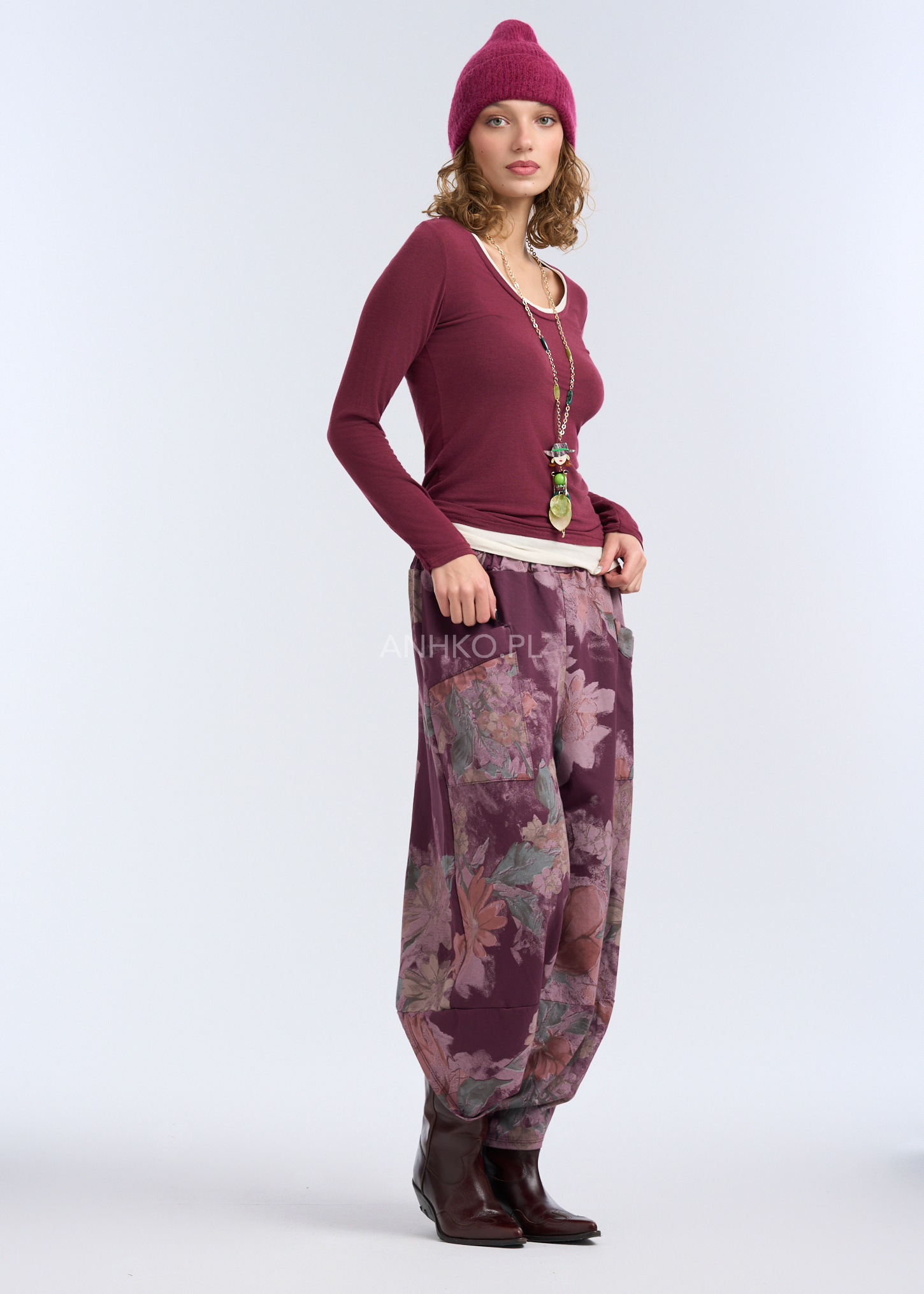 Spodnie Dawn Floral Dream Śliwkowe - Luźne spodnie w kwiatowy wzór, wykonane z bawełny z dodatkiem elastanu. Wygodne, przewiewne i stylowe – idealne na co dzień, spacery i spotkania w swobodnym stylu.